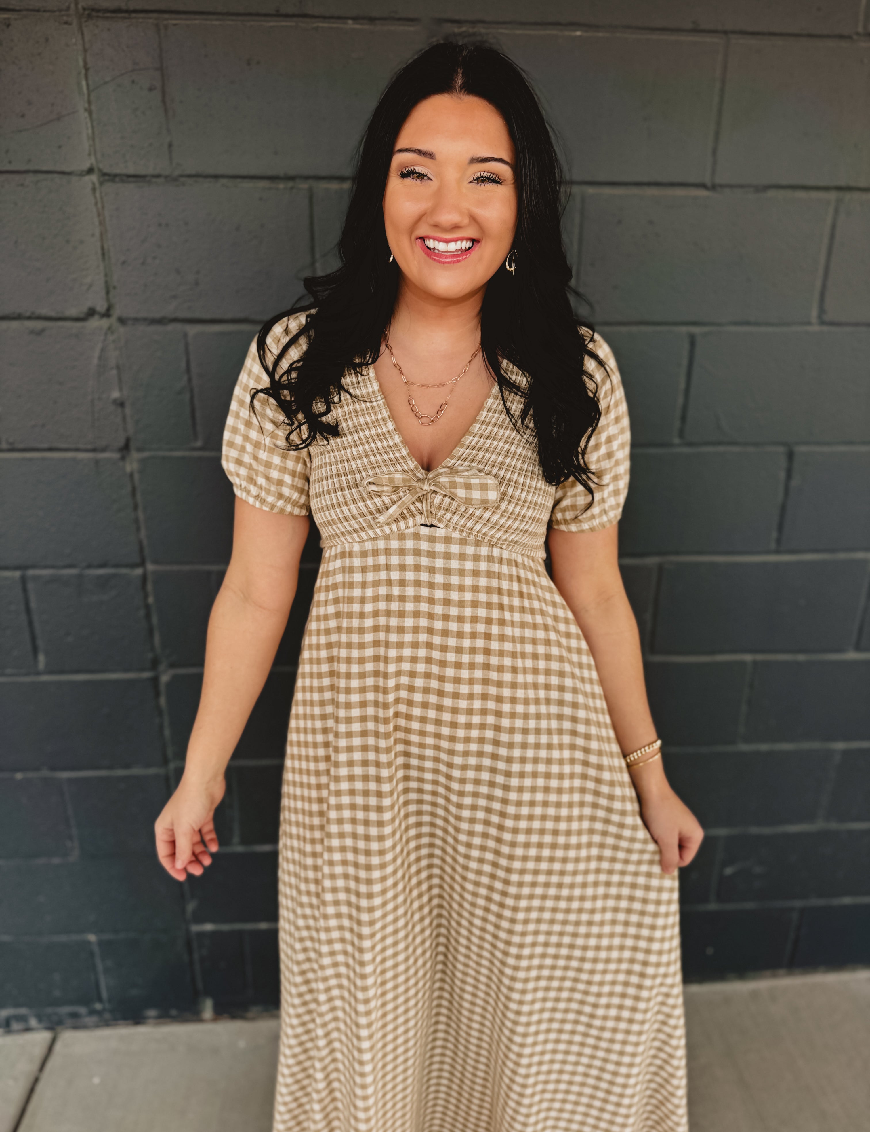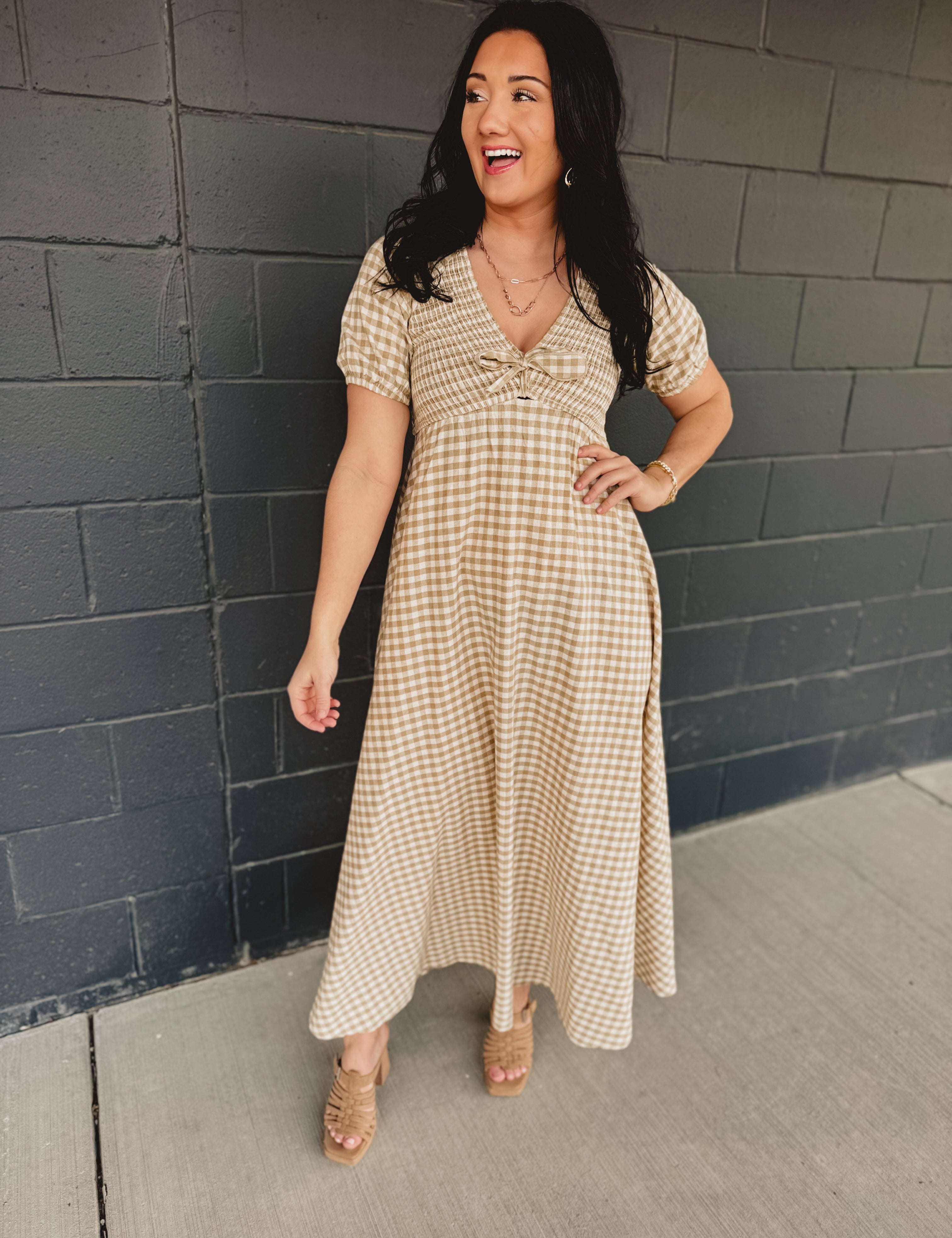 Smocked Gingham Bow Tie Maxi Dress - Linen