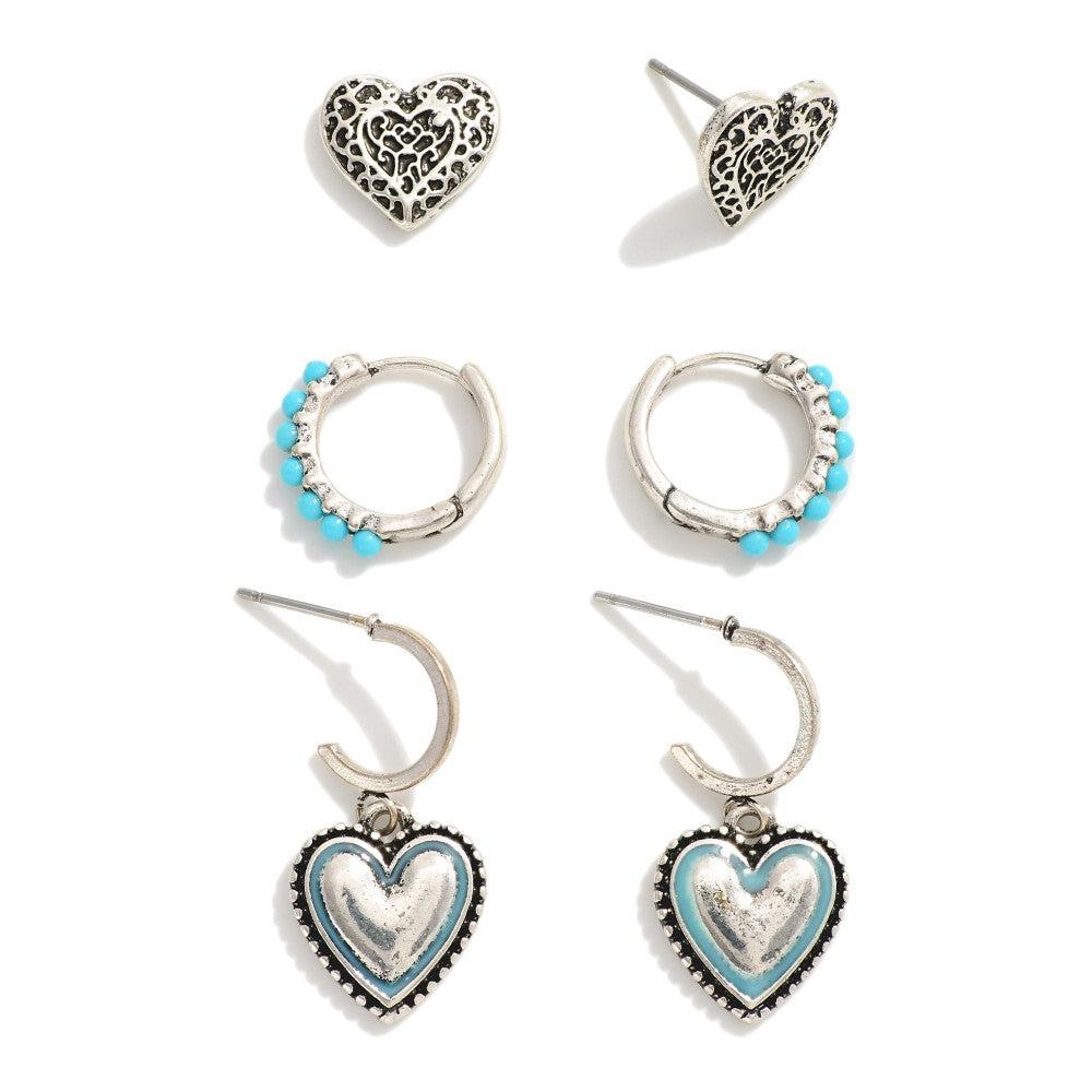 Heart & Turquoise Hoop & Stud Earrings, Set of 3 - Silver