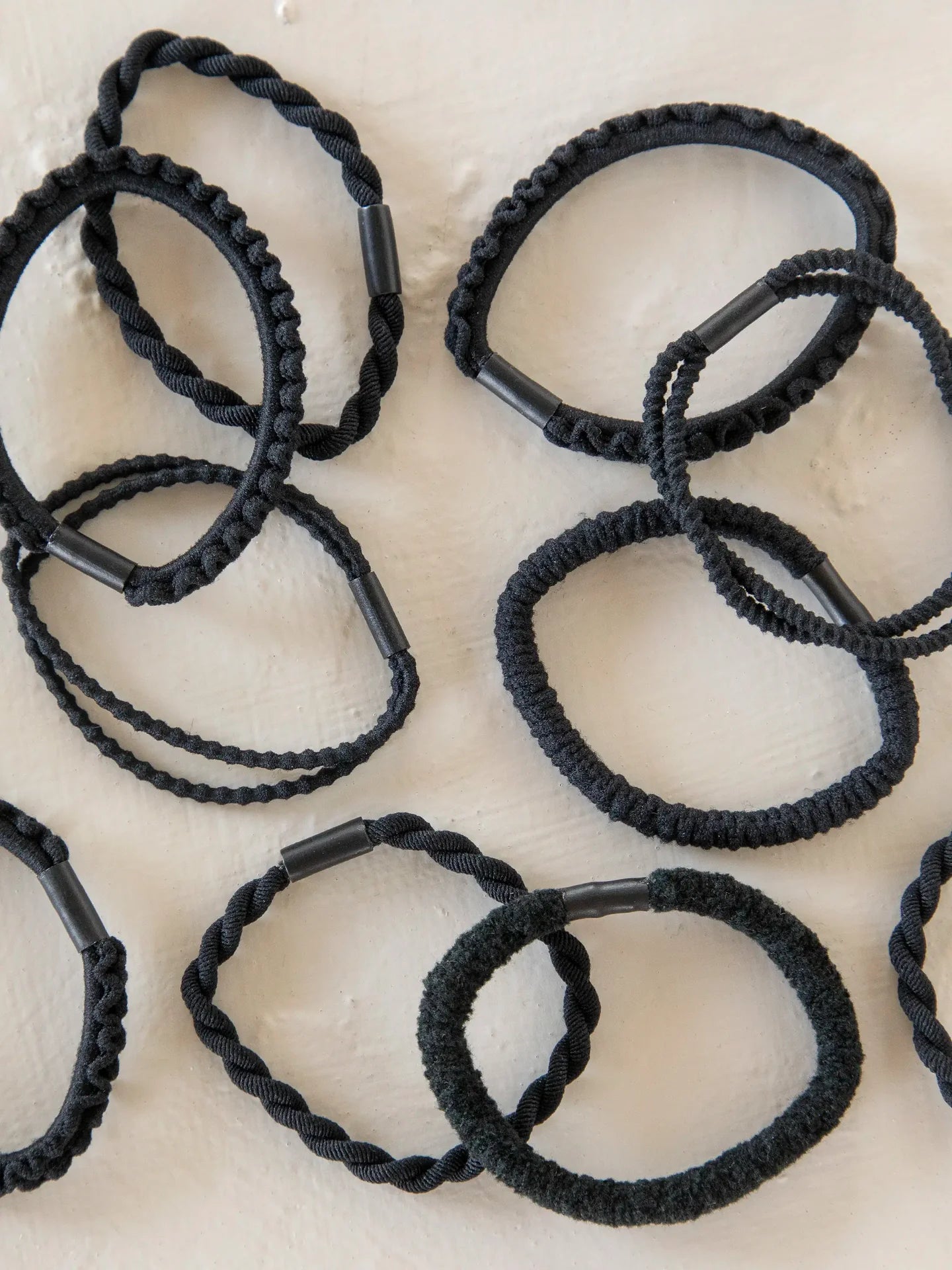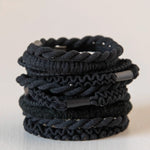 - Set of 10 textured hair ties in a classic black color