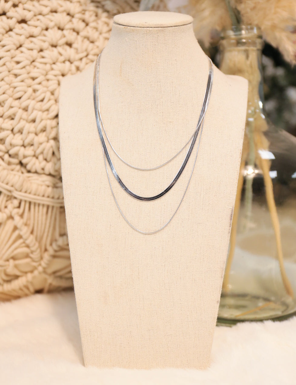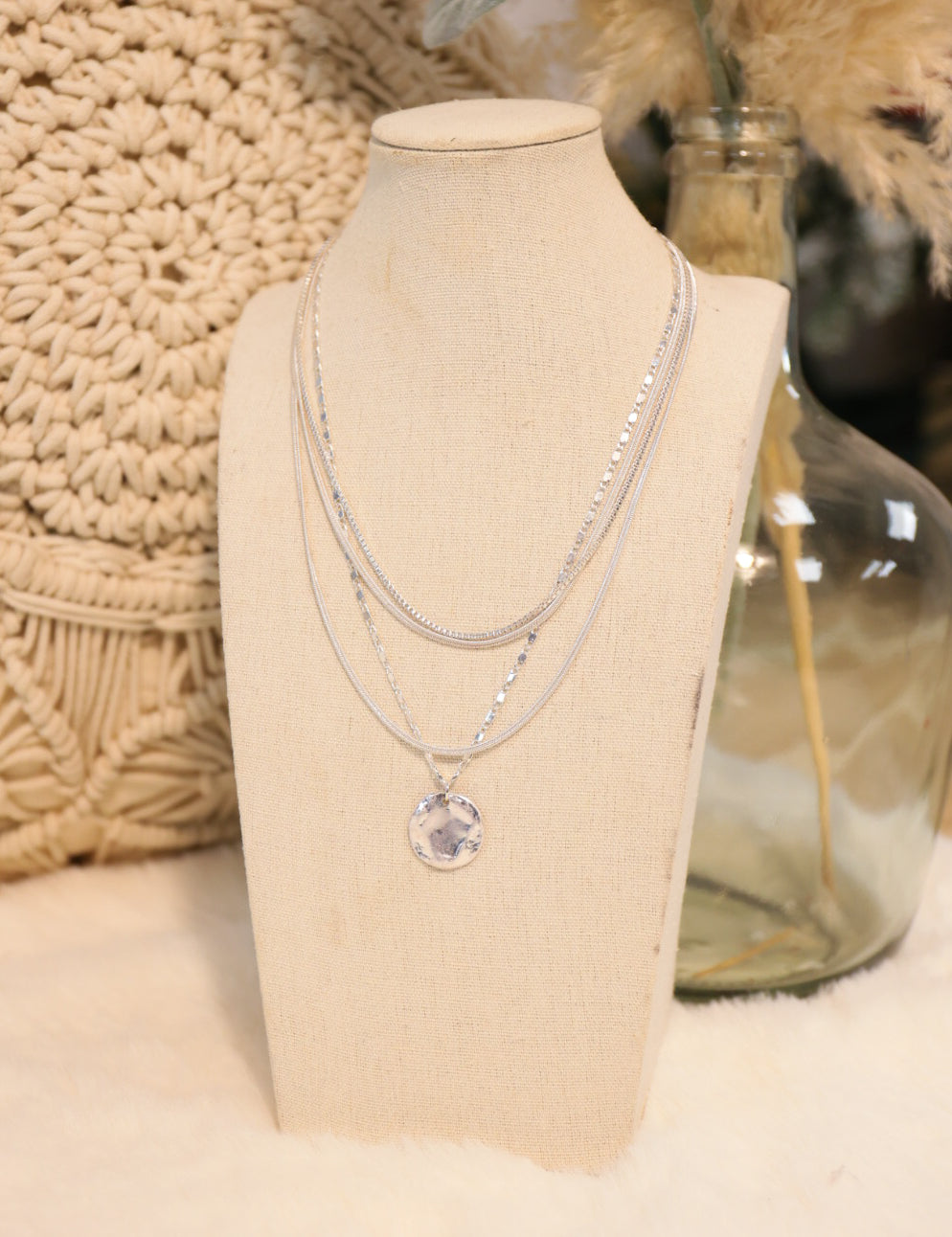 Hammered Circle Pendant Chain Layered Necklace - Silver