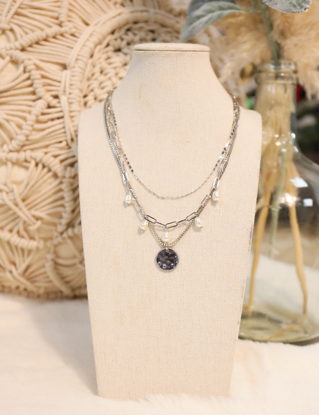 Pearl Accent Hammered Pendant Layered Necklace - Silver