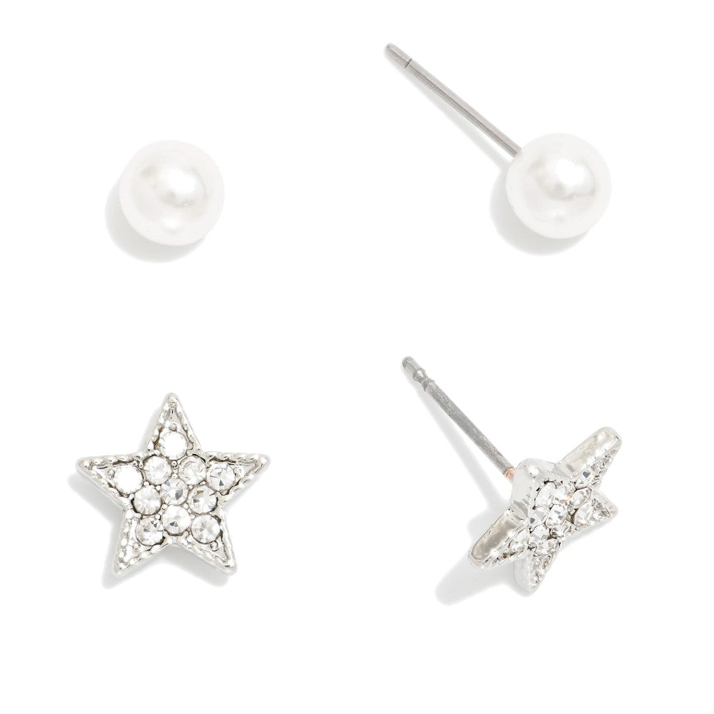 Rhinestone Star & Pearl Stud Earrings, Set of 2 - Silver
