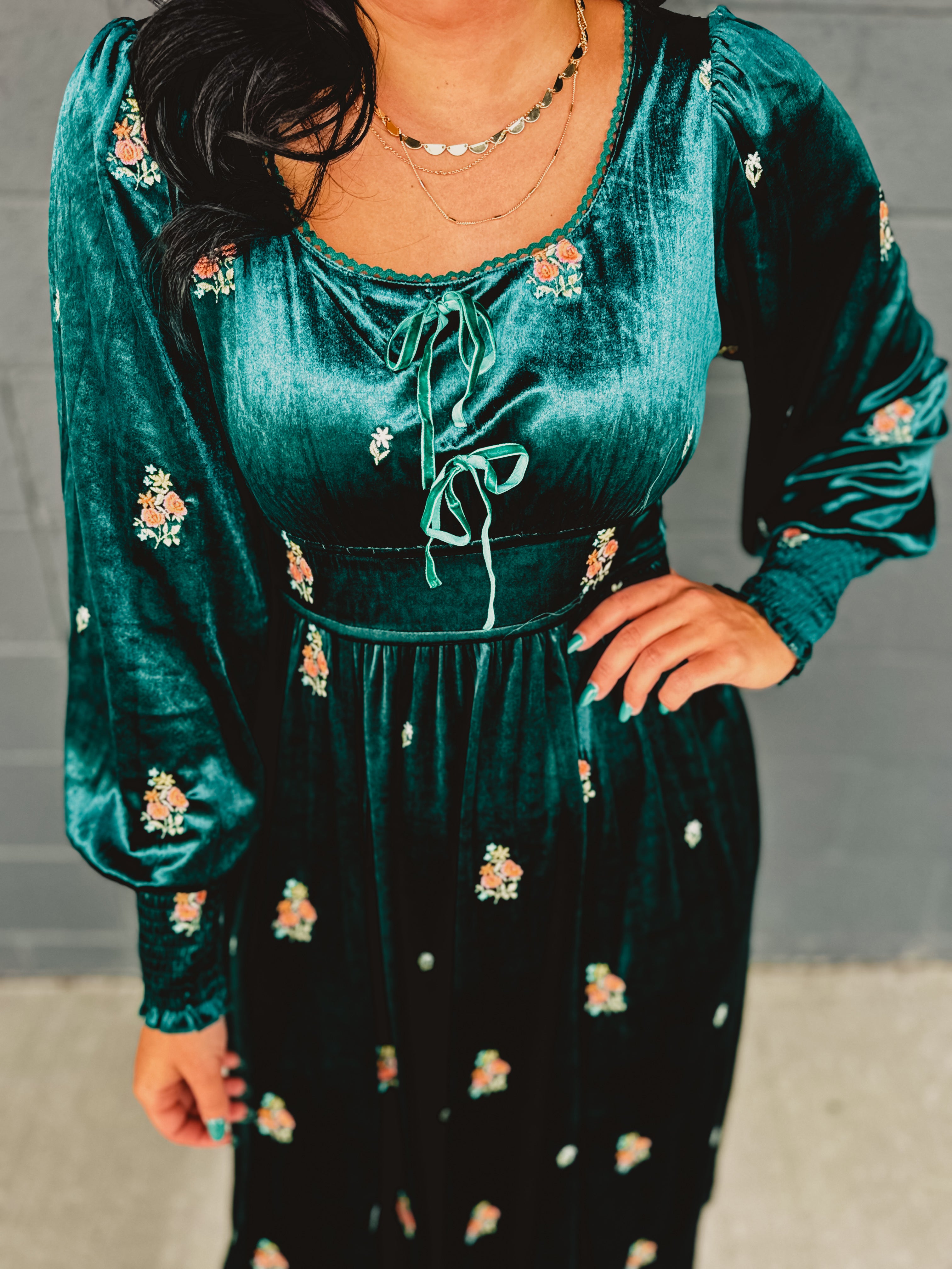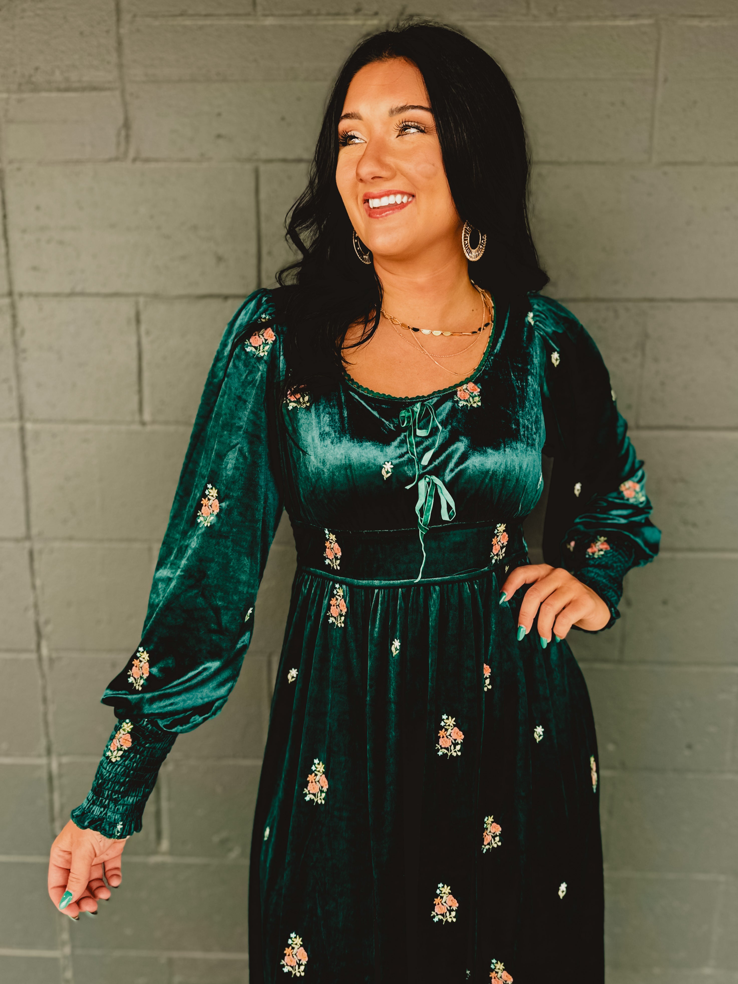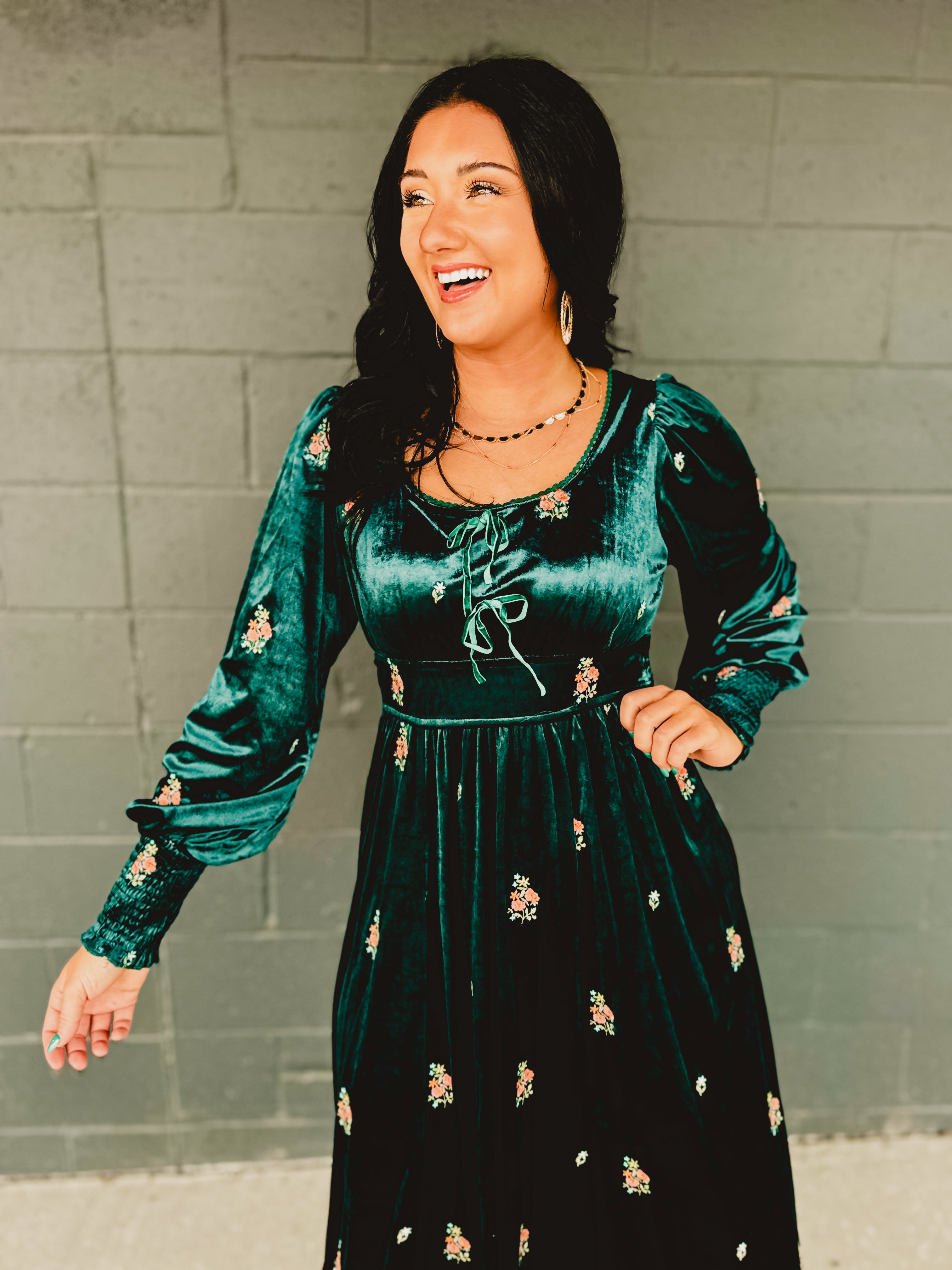 This jade velvet maxi dress with embroidered details and long sleeves brings an elegant, romantic feel, perfect for holiday parties or special fall occasions.