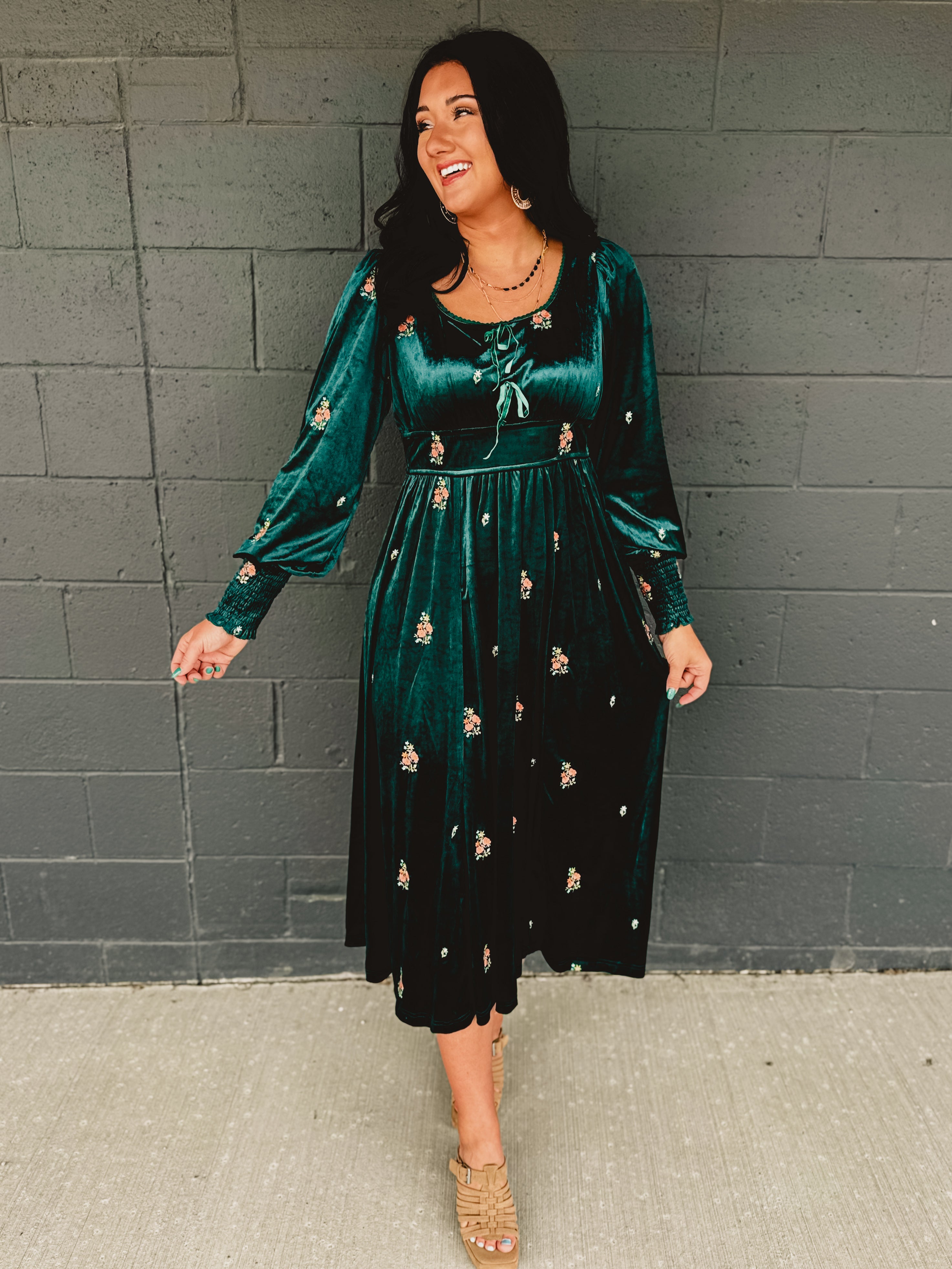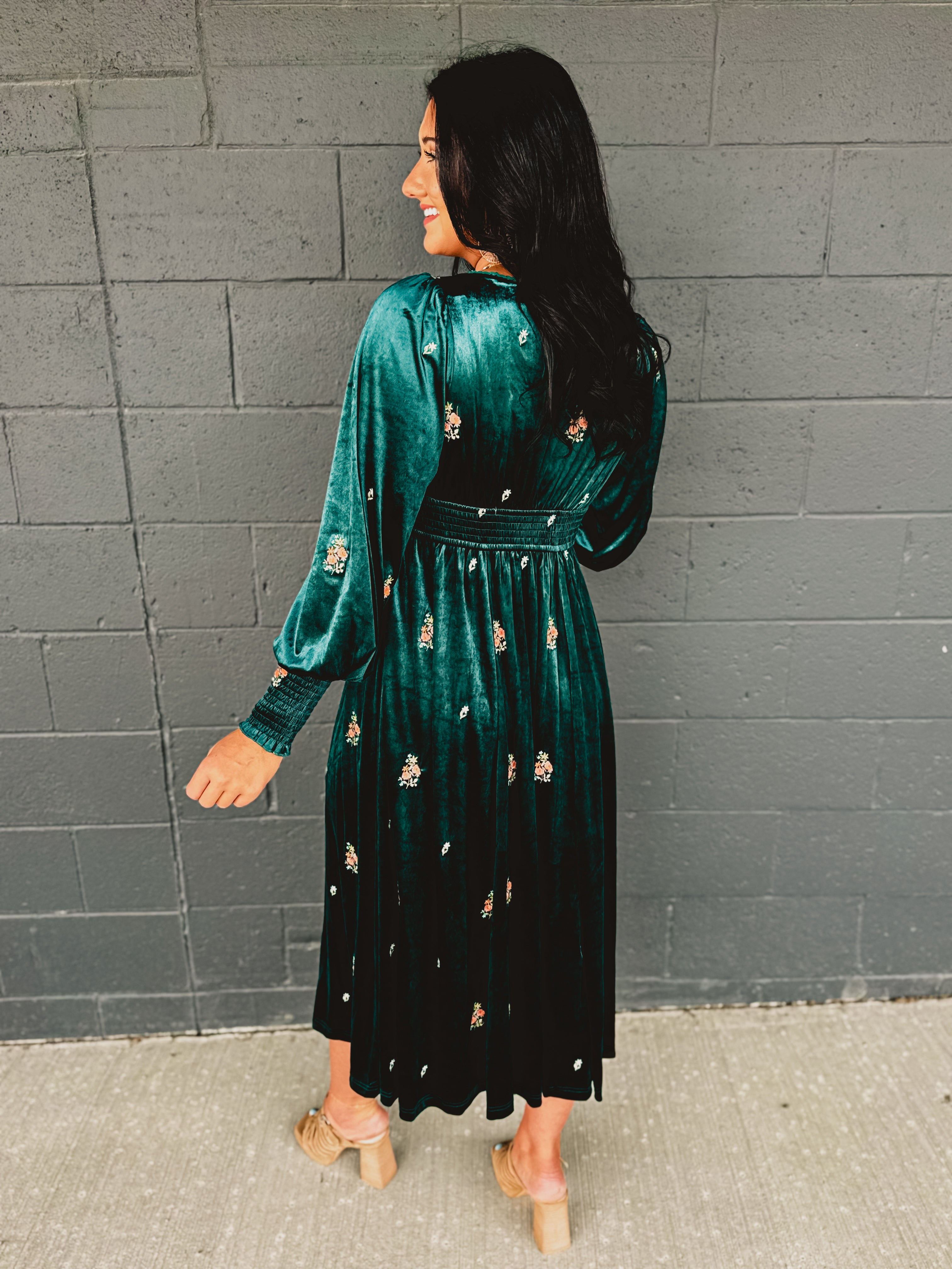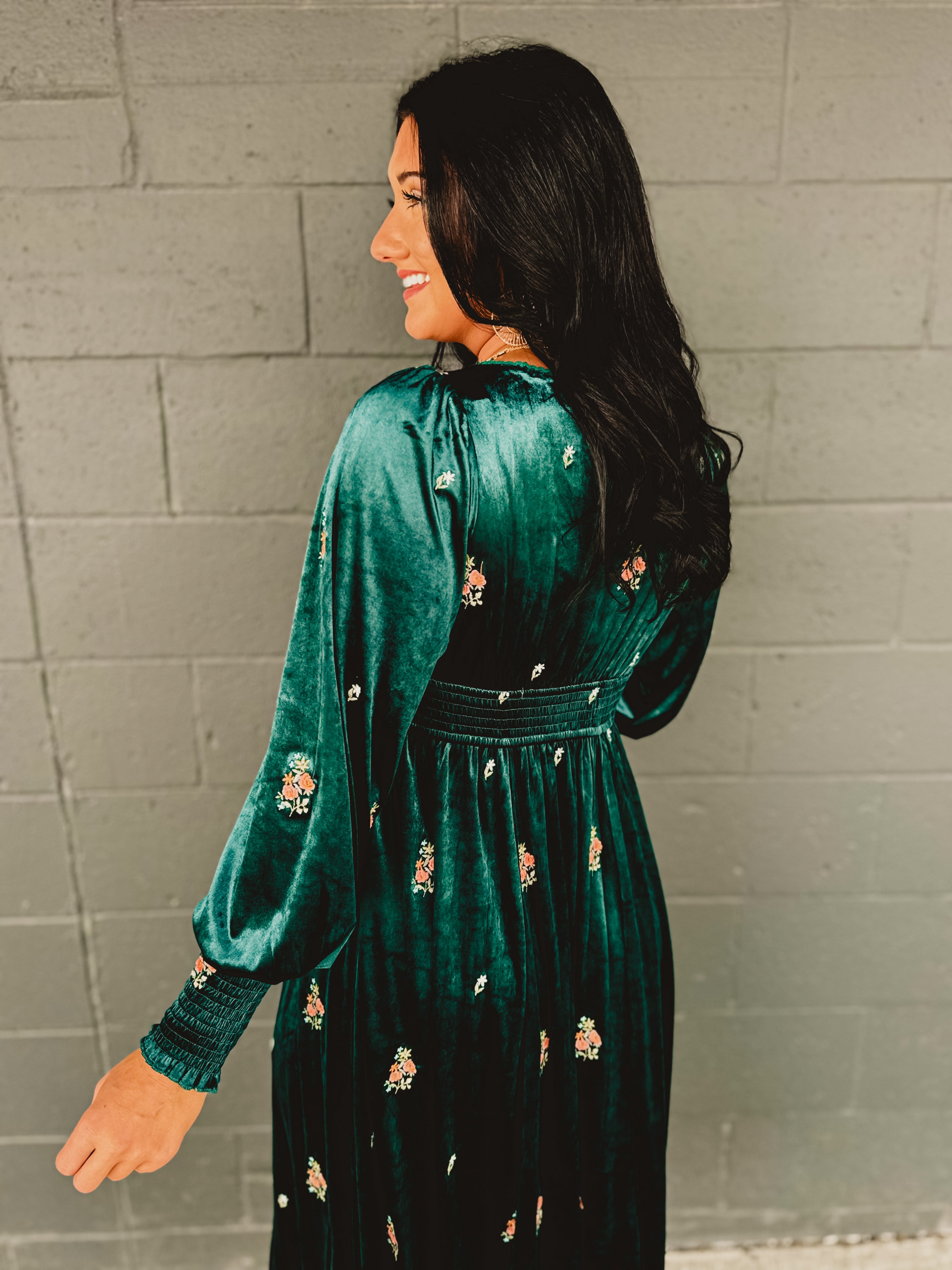 This jade velvet maxi dress with embroidered details and long sleeves brings an elegant, romantic feel, perfect for holiday parties or special fall occasions.