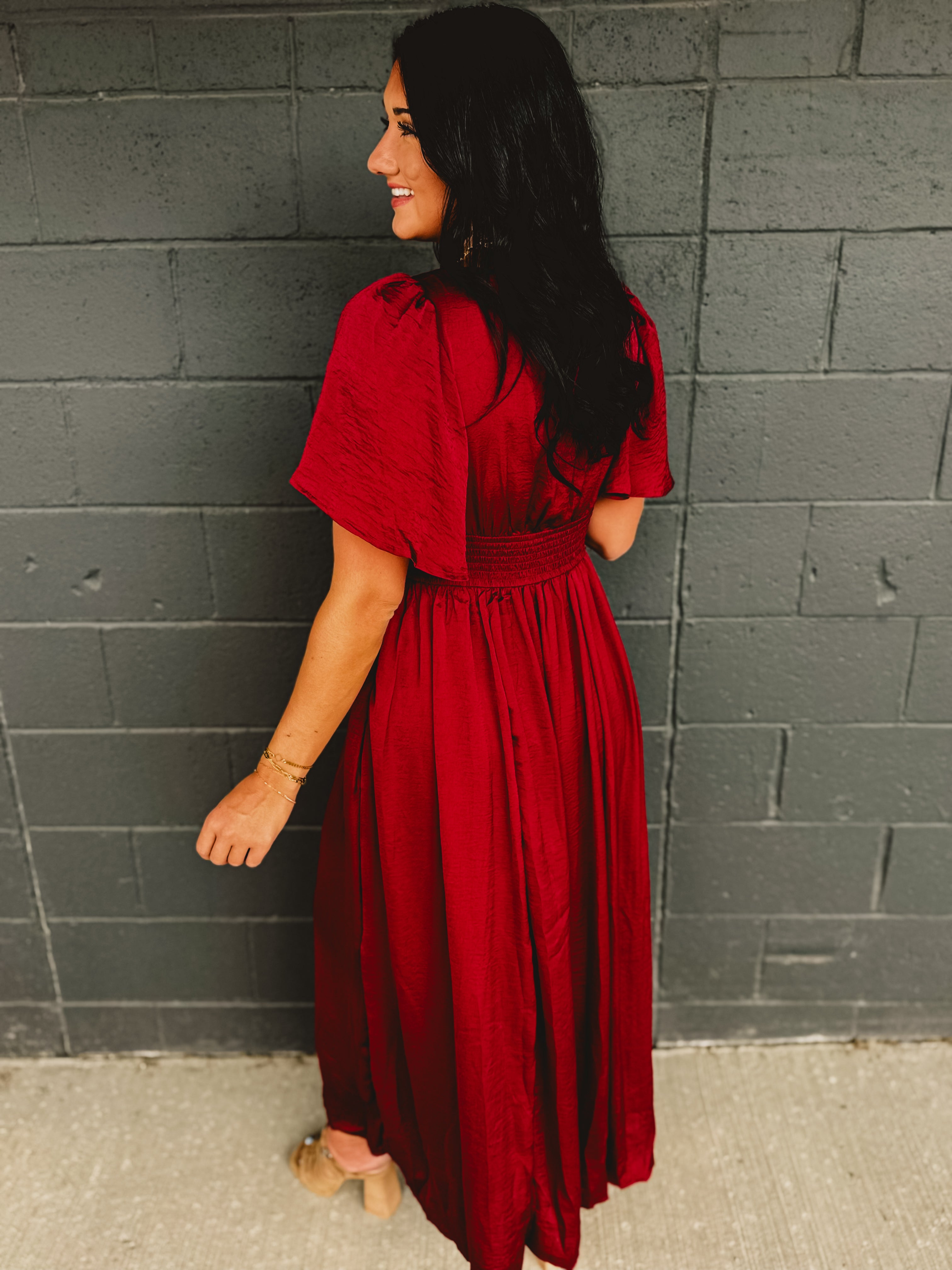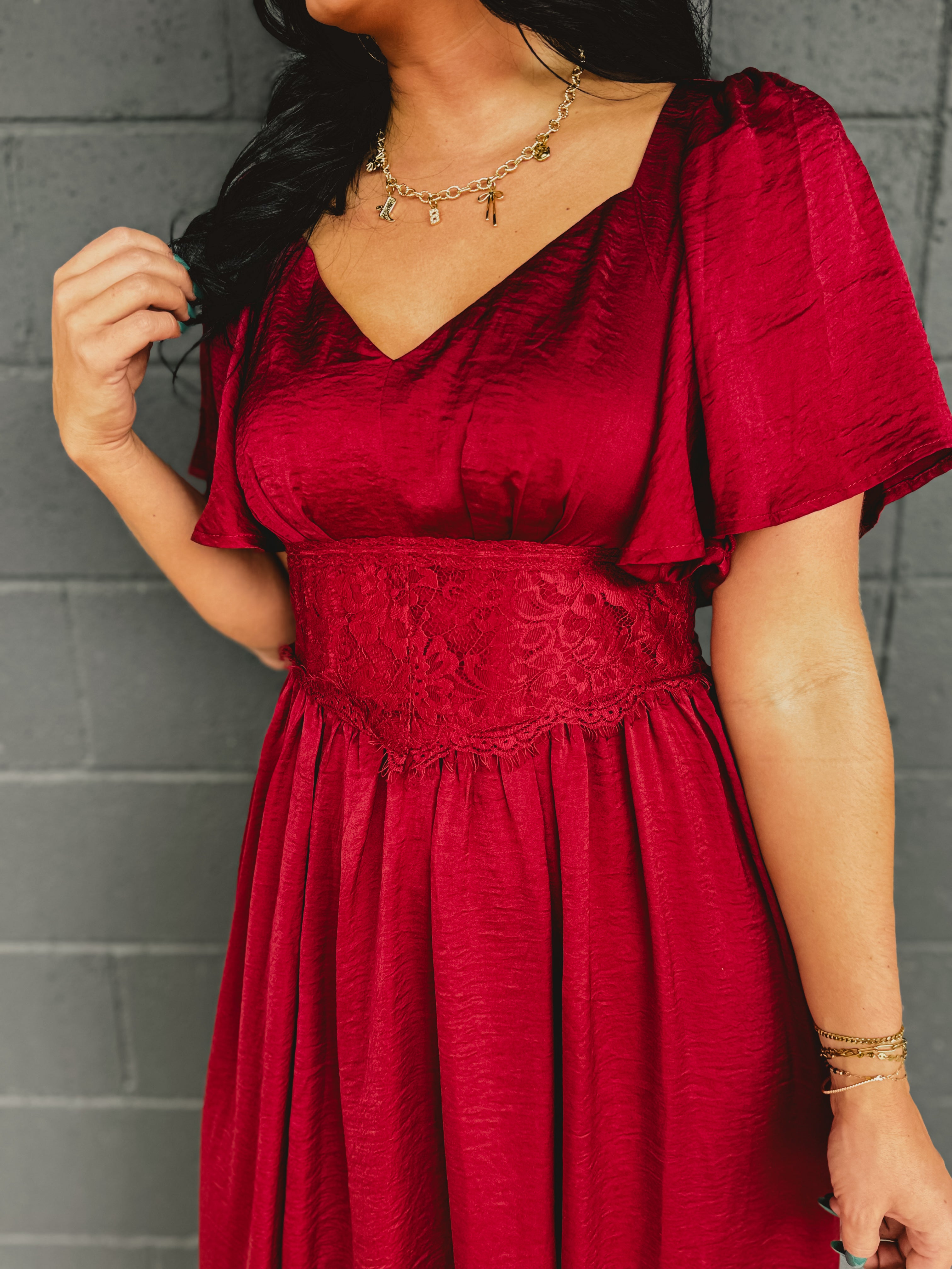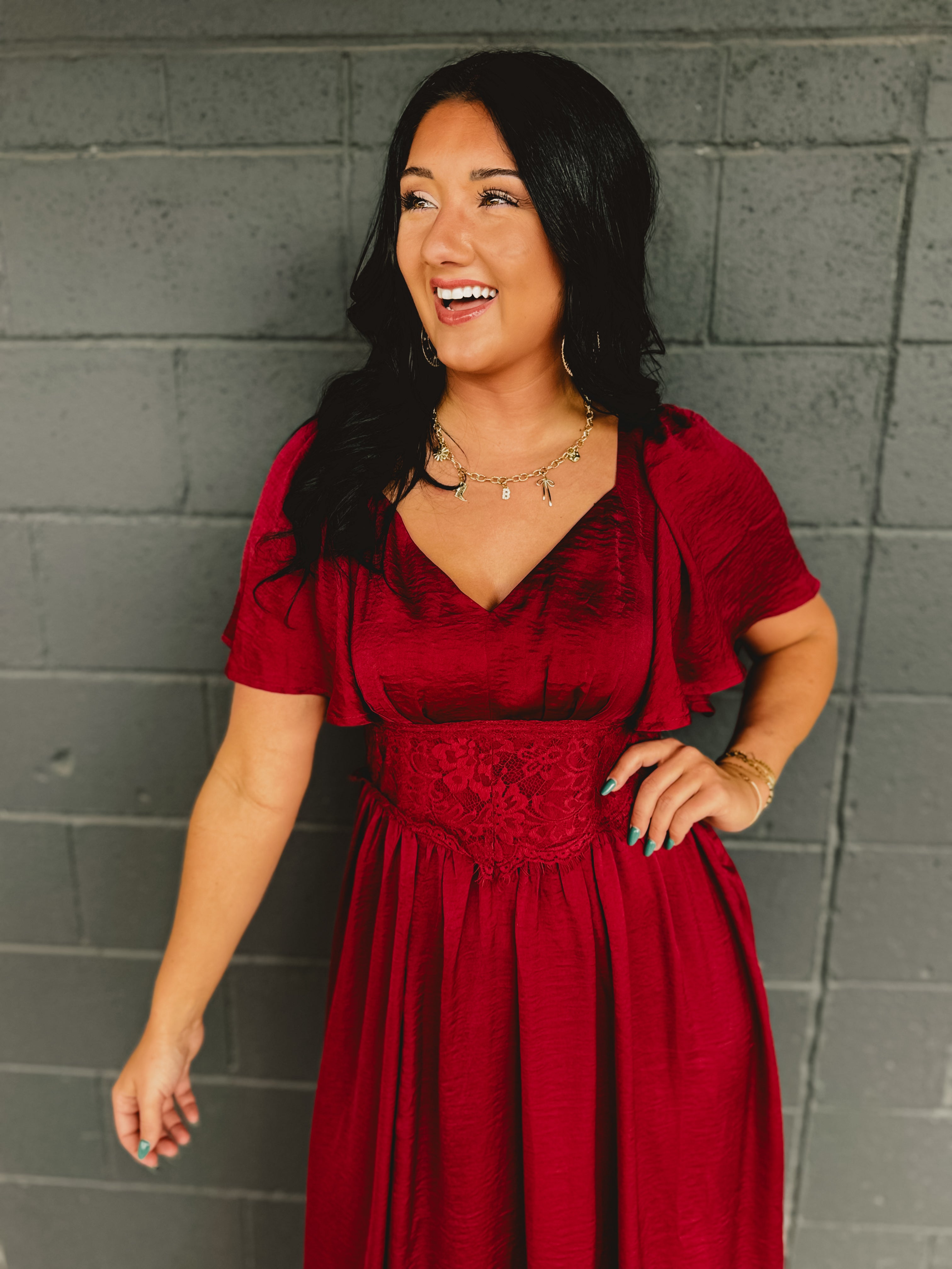 This cranberry washed satin maxi dress with lace details brings an elegant, romantic feel that’s perfect for fall occasions or evening events!