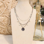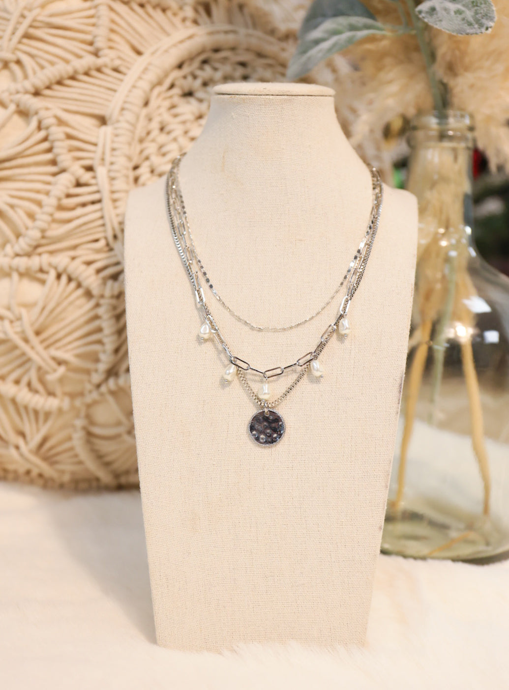 Pearl Accent Hammered Pendant Layered Necklace - Silver