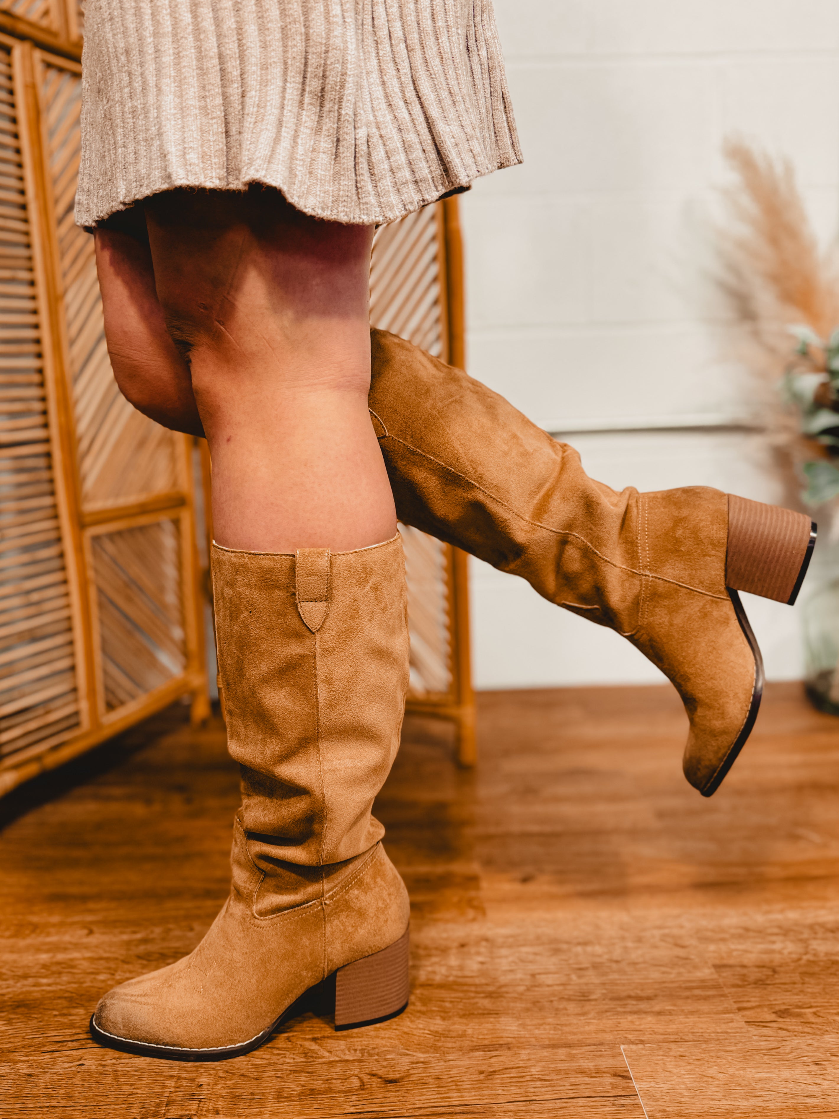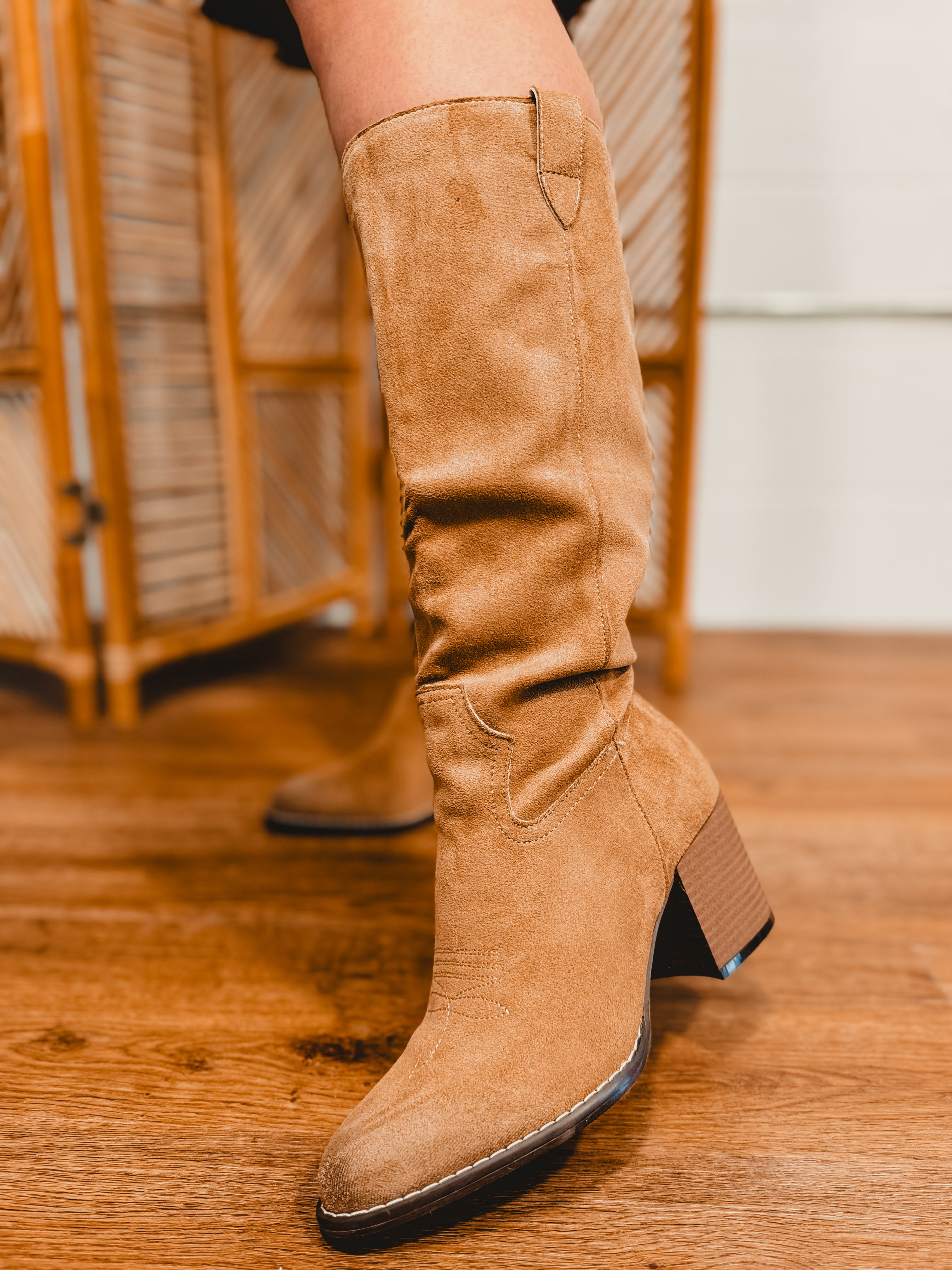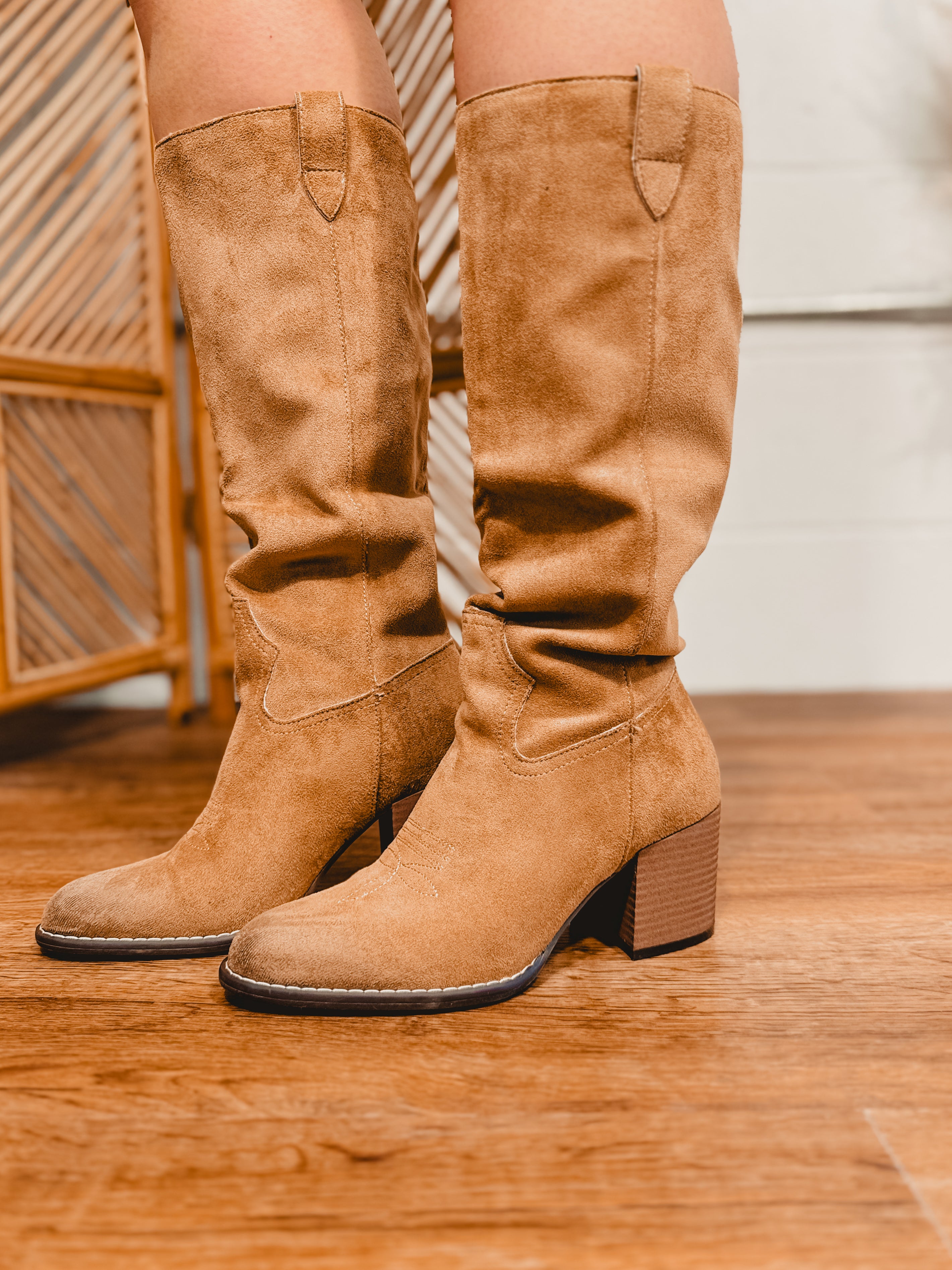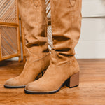 Make an entrance with the ROXANNE — a bold knee-high boot with unmistakable Western attitude. Crafted from luxe suede and finished with intricate stitching, this style blends rugged charm with a sleek, elevated silhouette. The comfortable DreamCloud cushioned insole and easy slip-on design make it a standout boot you'll wear everywhere from concerts to everyday chic moments.