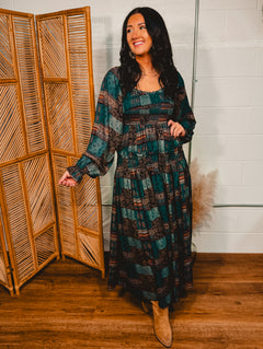 Patchwork Print Smocked Midi Dress - Pine
