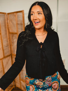 Front Tie-Up Textured Sweater Cardigan - Black