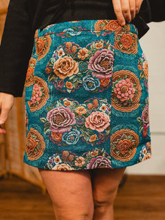 Floral Jacquard Tapestry Mini Skirt - Teal Blue