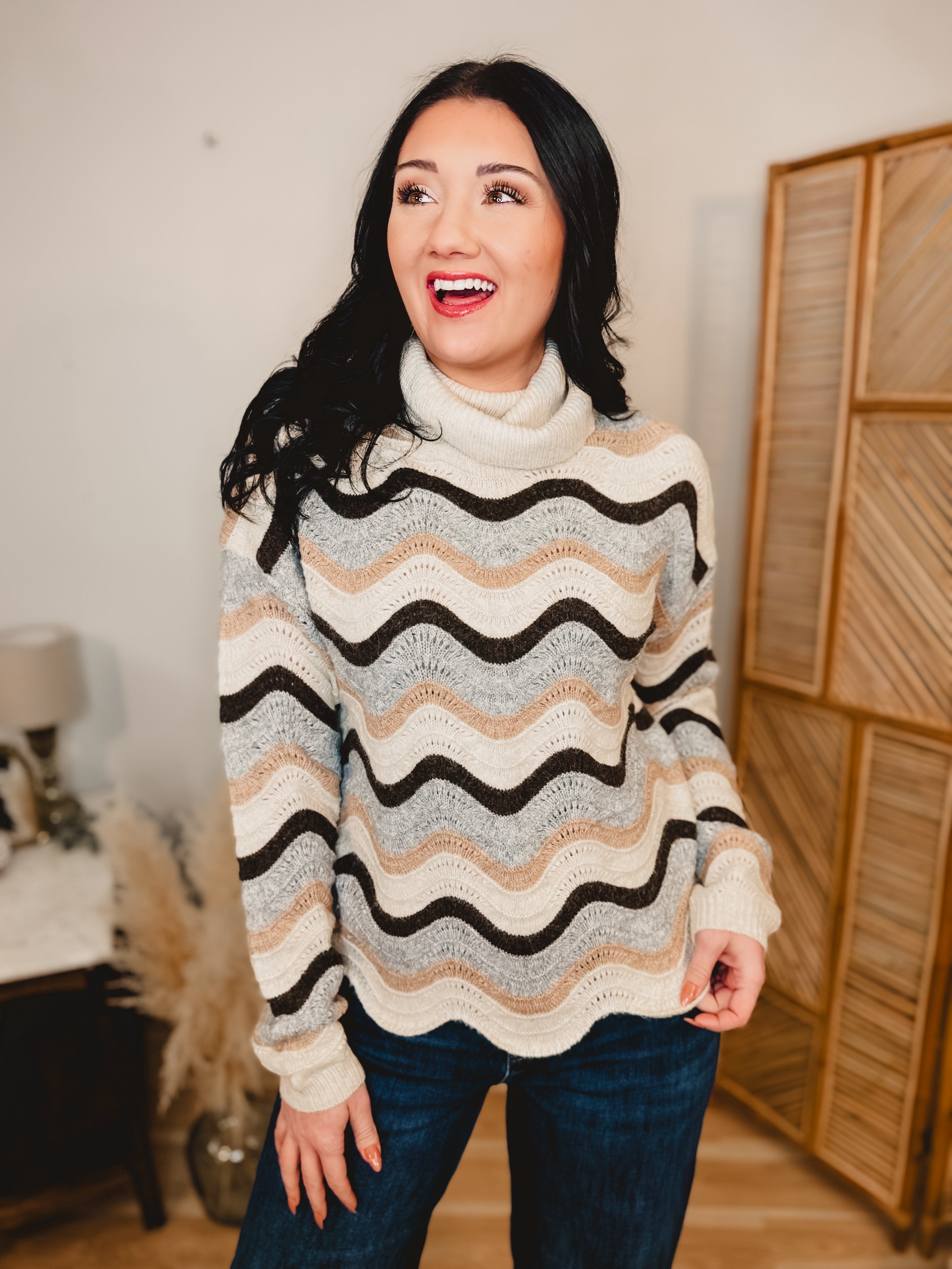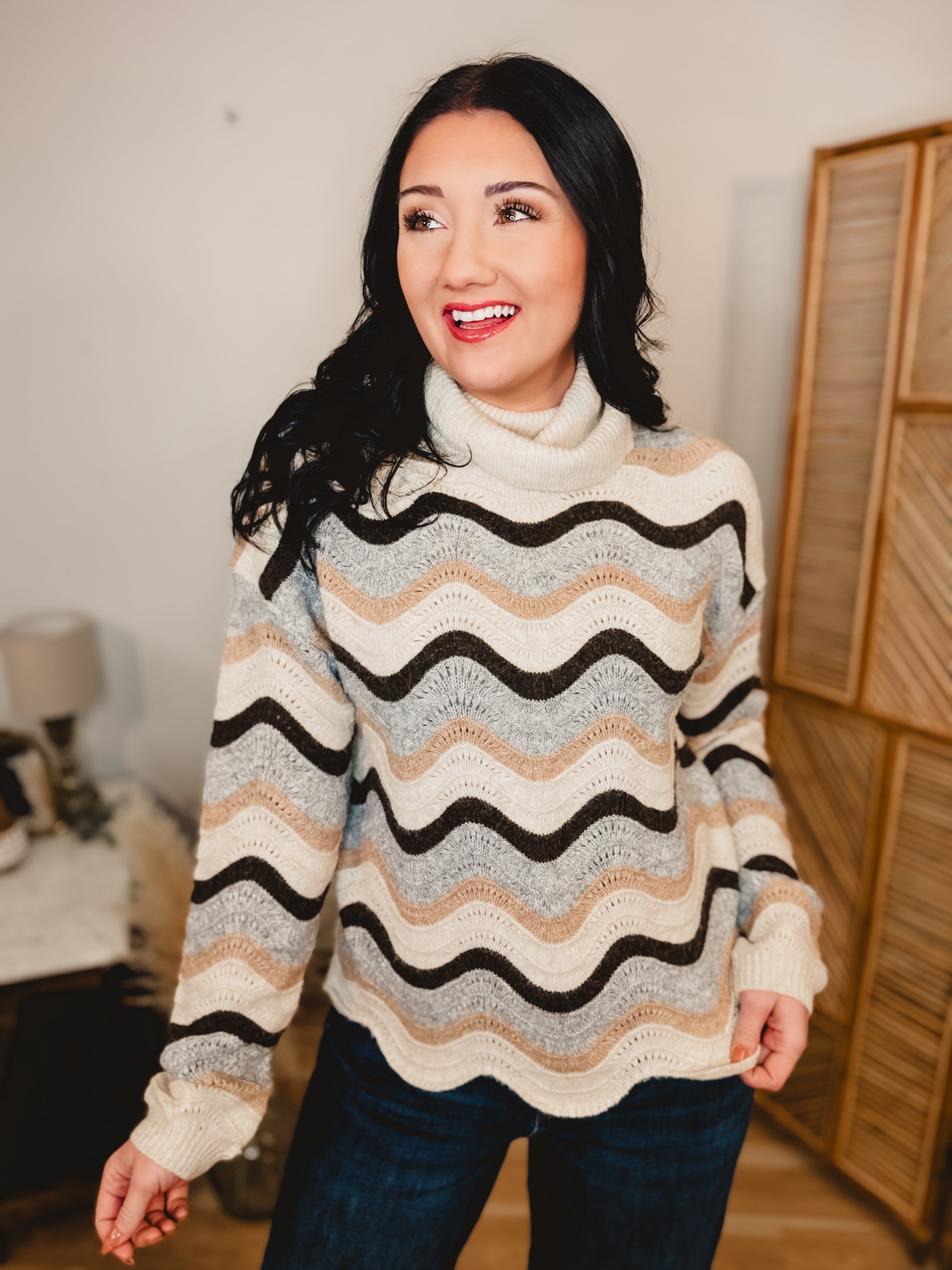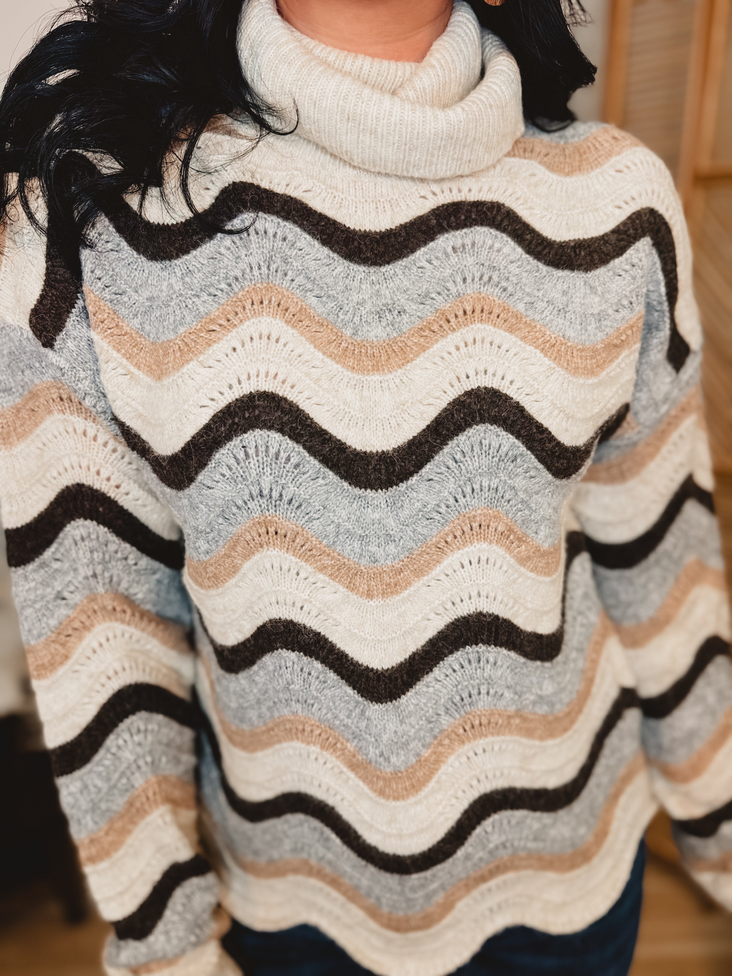 Cozy meets chic in this beautifully textured sweater, designed to keep you warm while elevating your everyday look. The soft wave stripe pattern and relaxed fit make it an easy favorite for fall and winter styling.