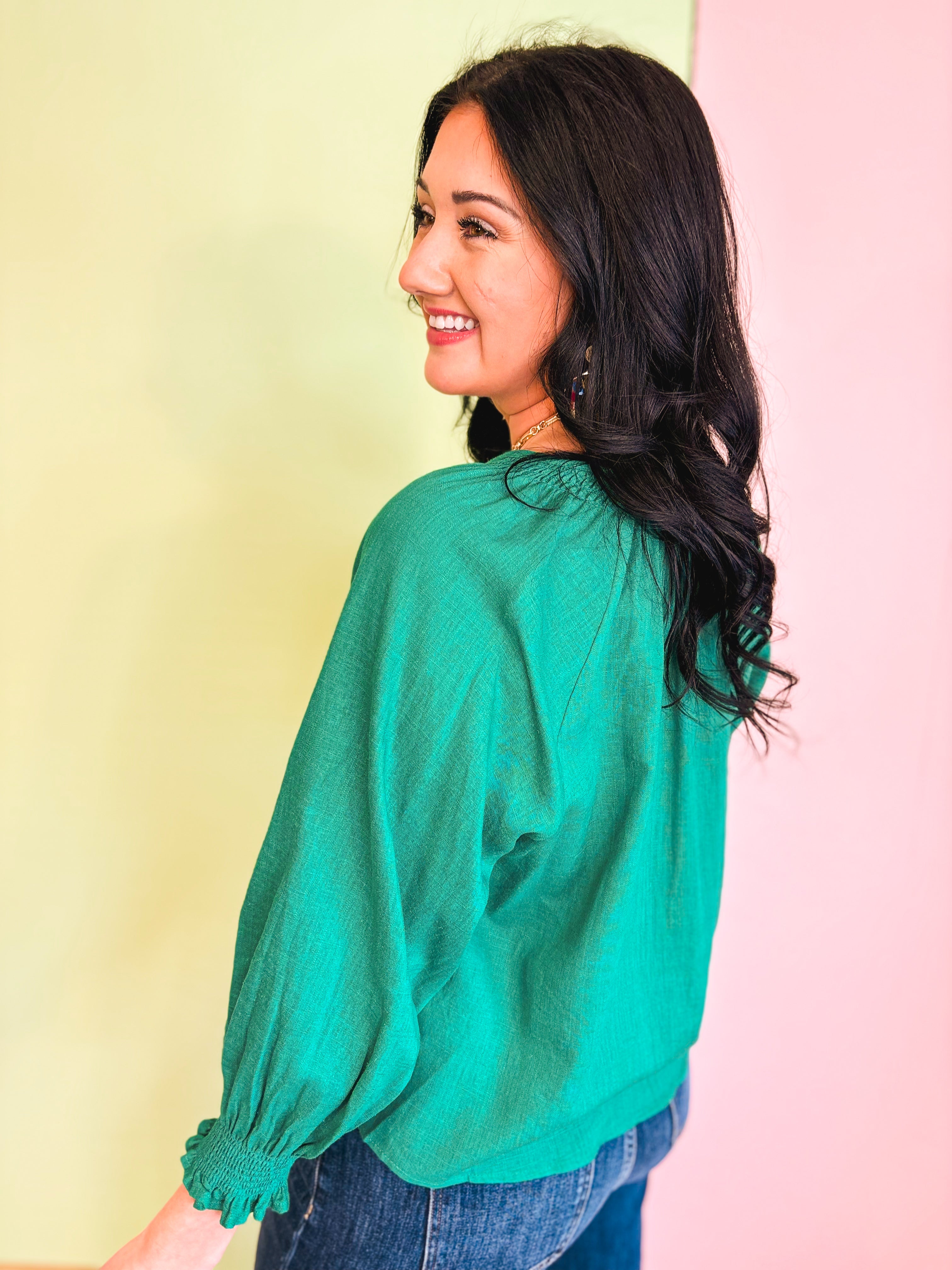 Drop Shoulder Smocked Cuff Blouse - Emerald