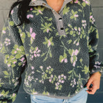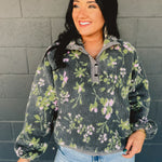 This cozy grey sherpa pullover with floral accents and snap button detail is the perfect blend of comfort and casual fall style. This top adds just the right amount of femininity while maintaining comfort!