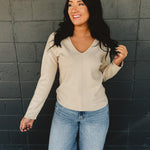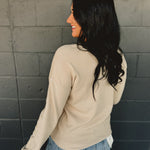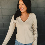 This oatmeal knit sweater with a front seam detail offers a simple yet cozy look, perfect for layering through the season. Its one of the softest tops you'll own!