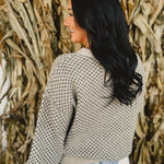 This khaki crewneck knit sweater with a jacquard pattern brings a touch of texture and timeless style to your cooler days wardrobe!