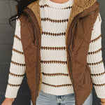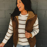 This dark brown quilted puffer vest with a cozy fleece lining is the perfect layering piece for chilly fall and winter days.