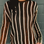 Cozy up in effortless style with this drop shoulder sweater featuring rich fall hues and raw edge detailing. The vertical stripes add a flattering touch to this laid-back look.