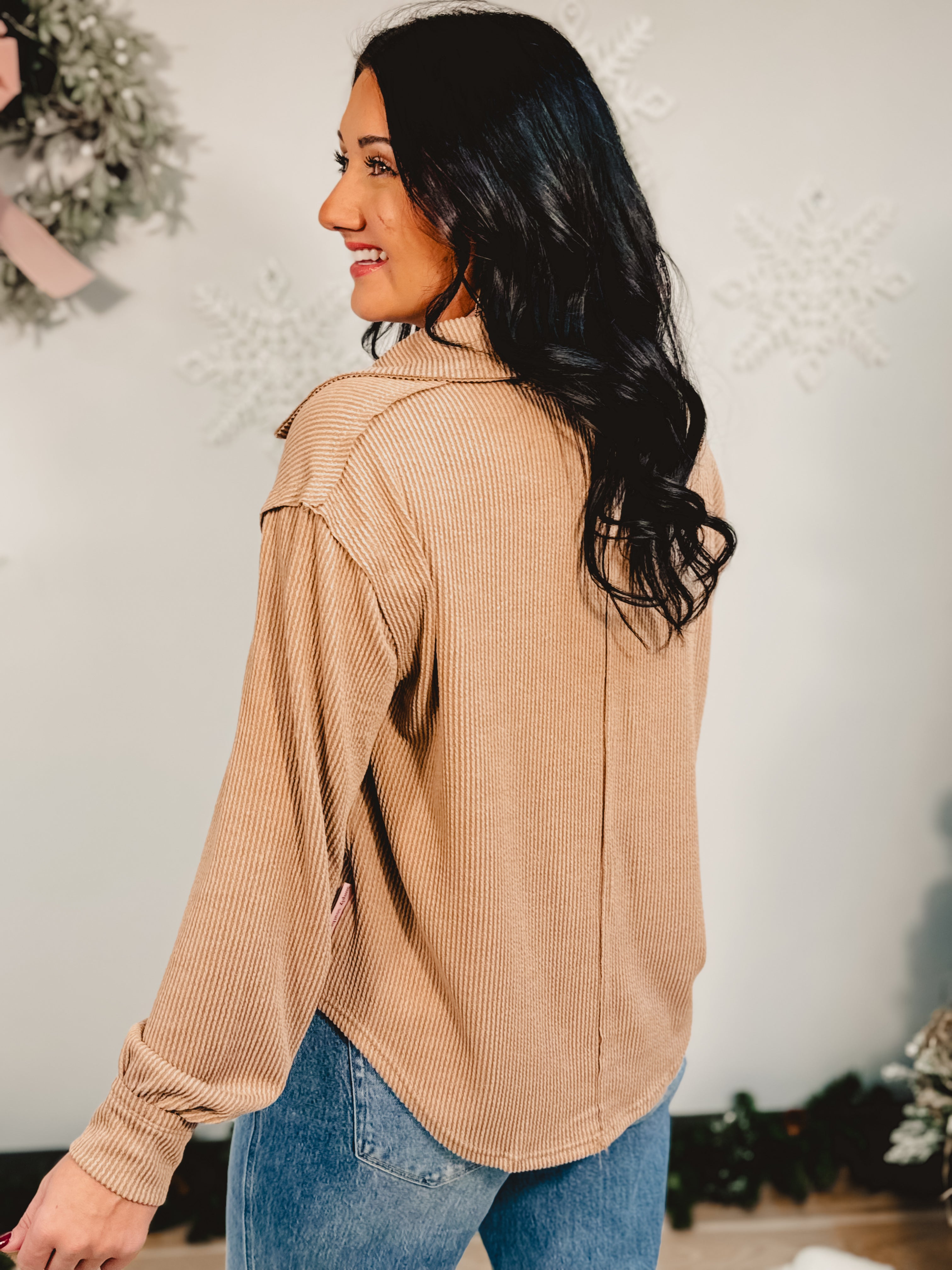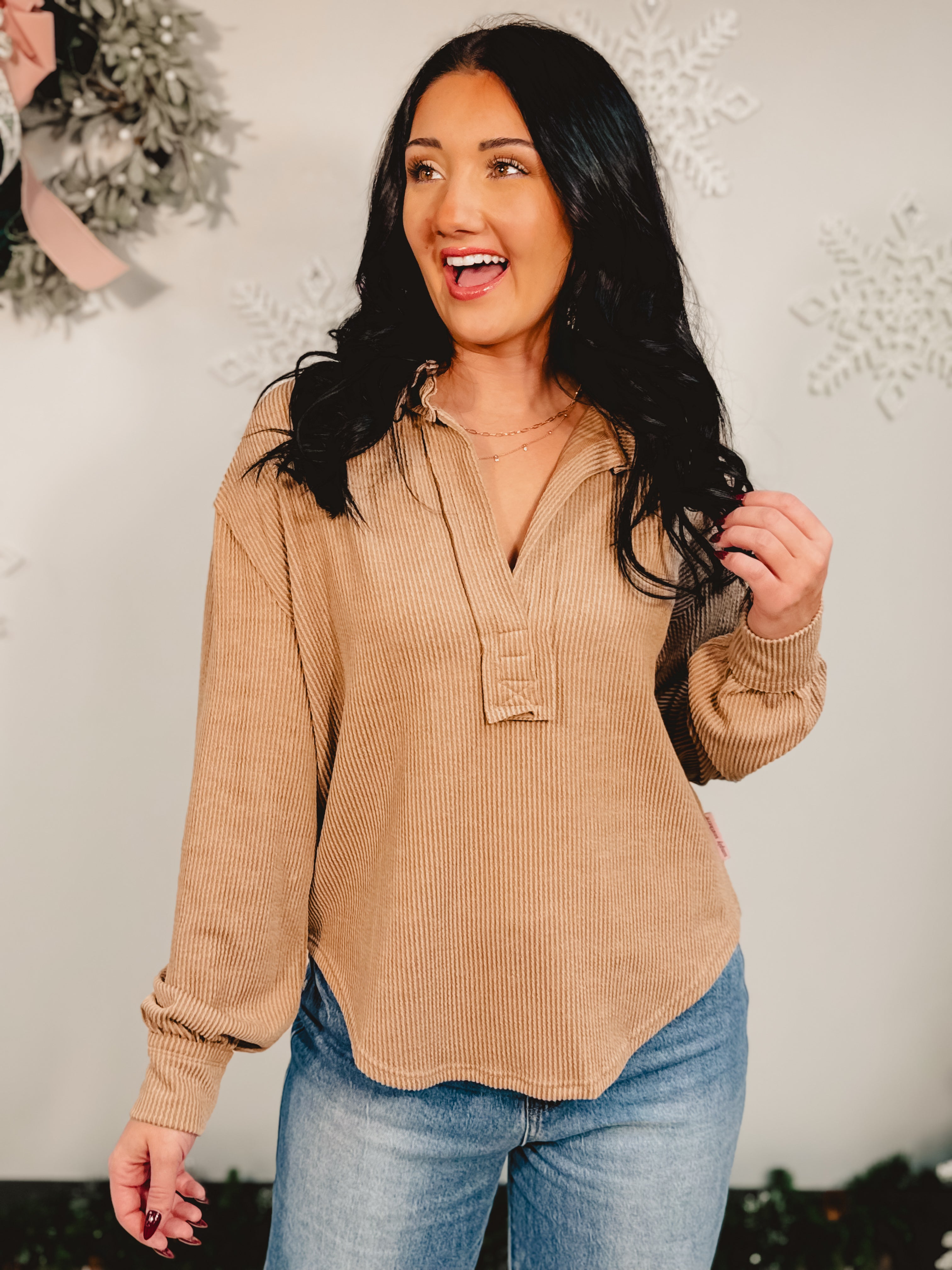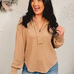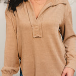 Stay effortlessly casual in this umber ribbed long sleeve top, featuring a split round neckline with a soft collared detail and raw edge finish for that perfectly relaxed look!