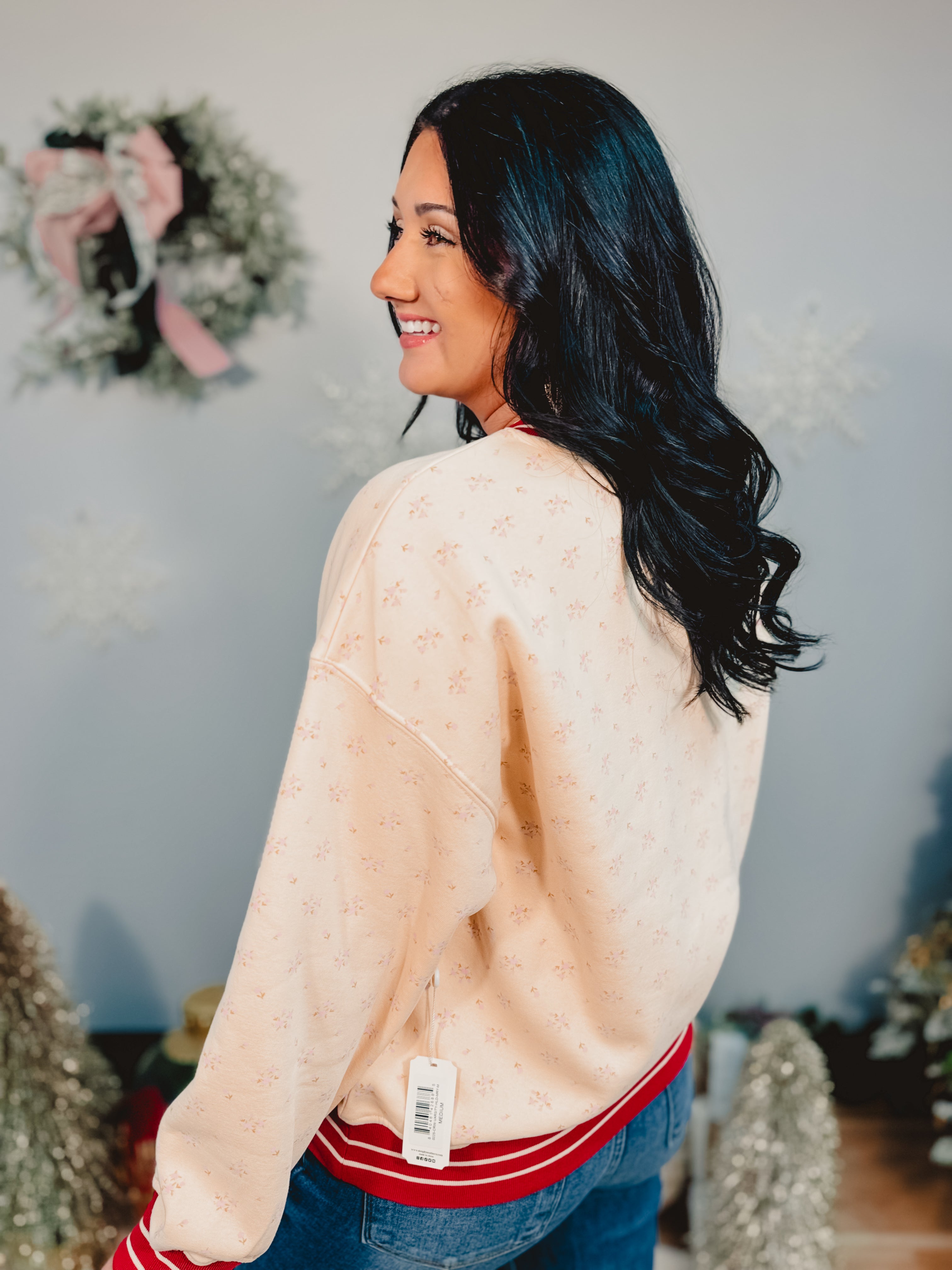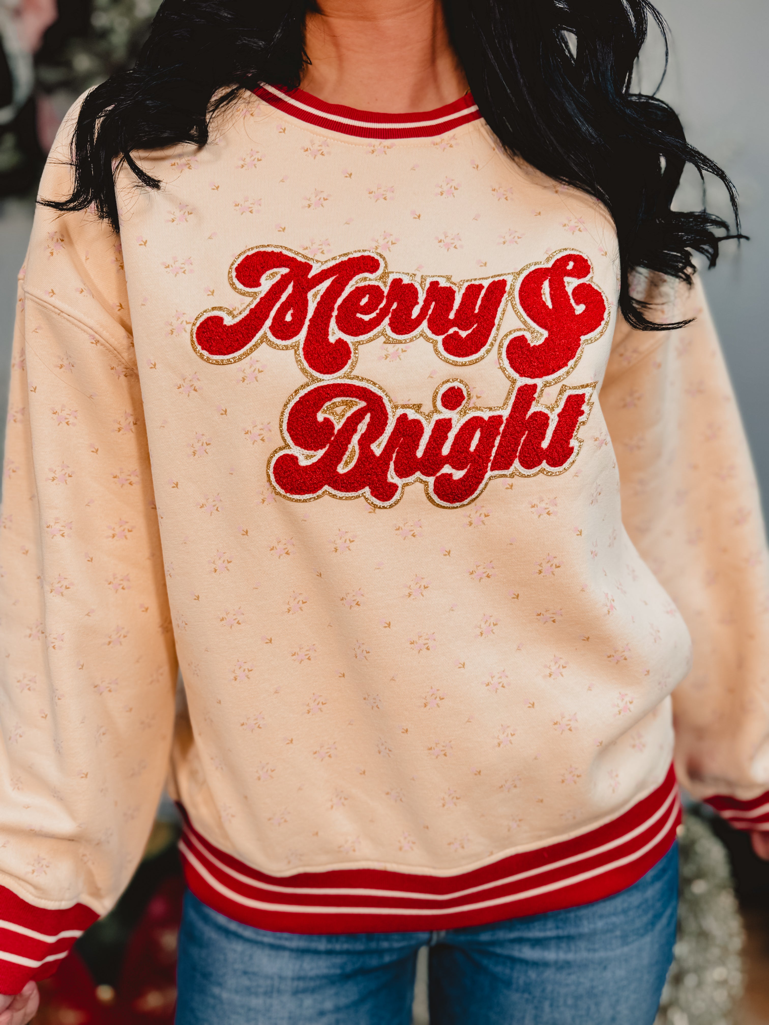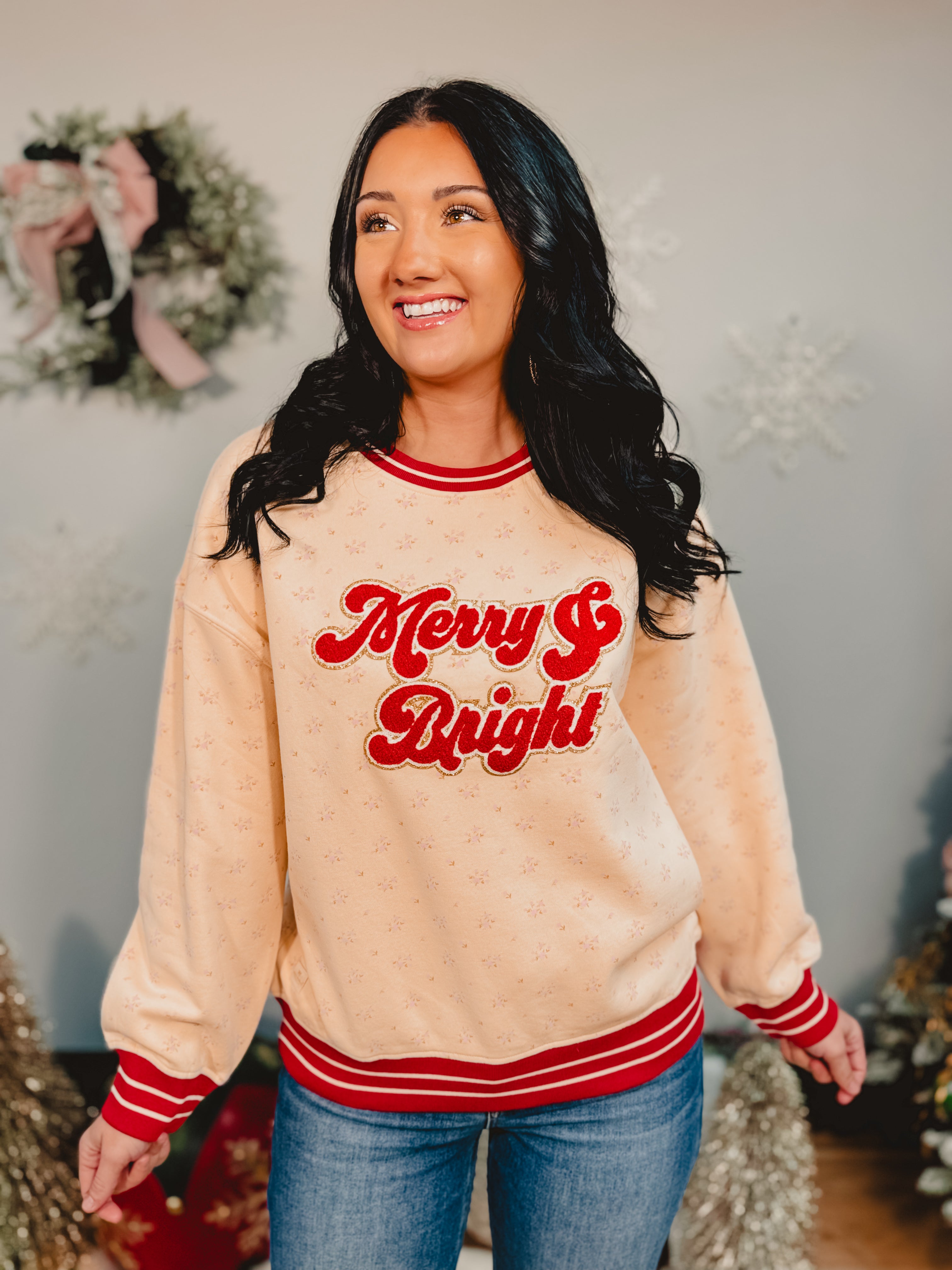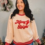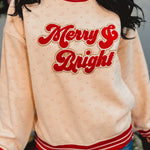 Stay festive and cozy in this cream varsity-style “Merry & Bright” sweatshirt, bringing classic holiday spirit and a touch of sparkle to your winter wardrobe!