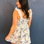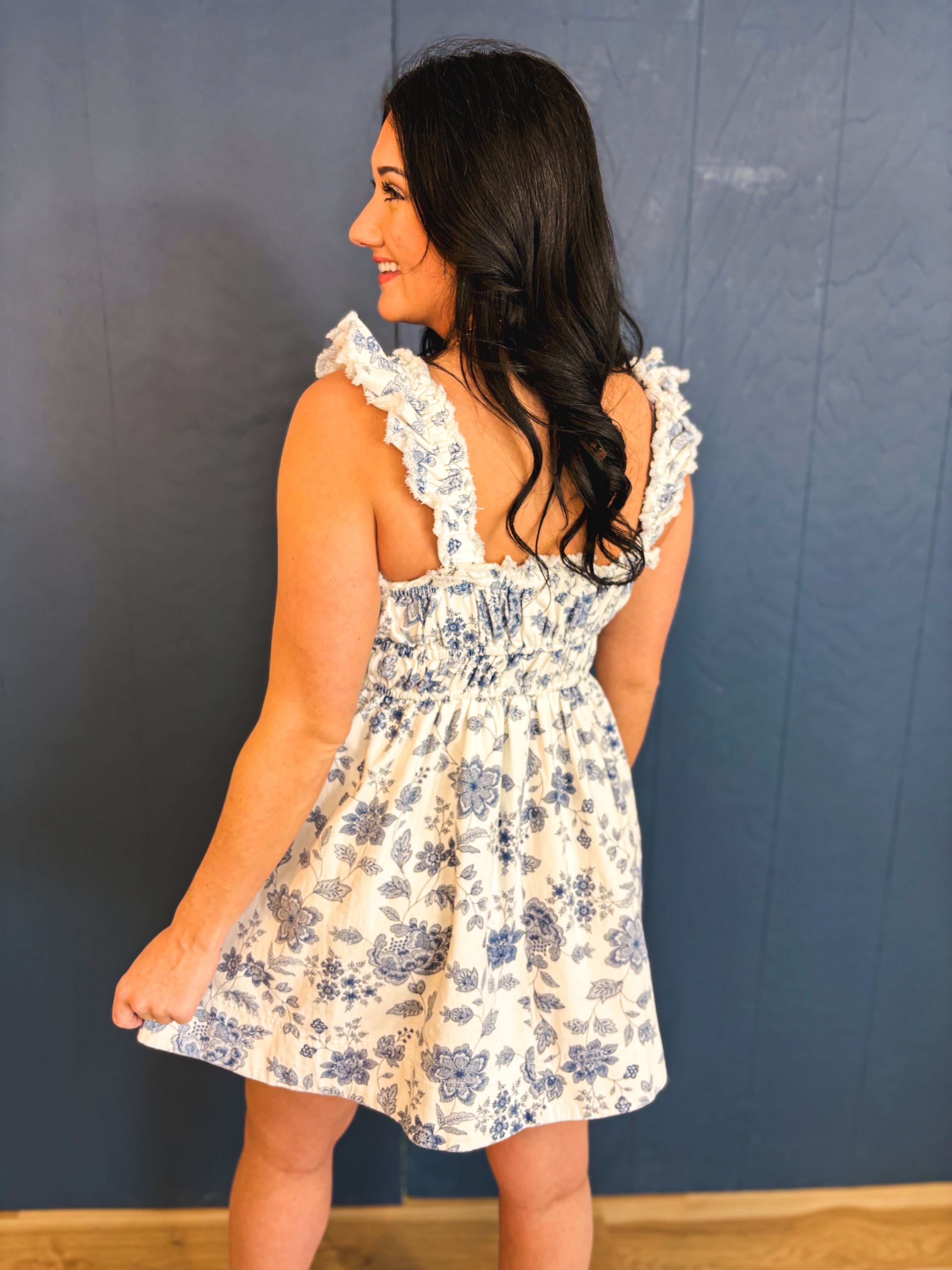 Floral Printed Denim Sleeveless Mini Dress - Blue/Ivory