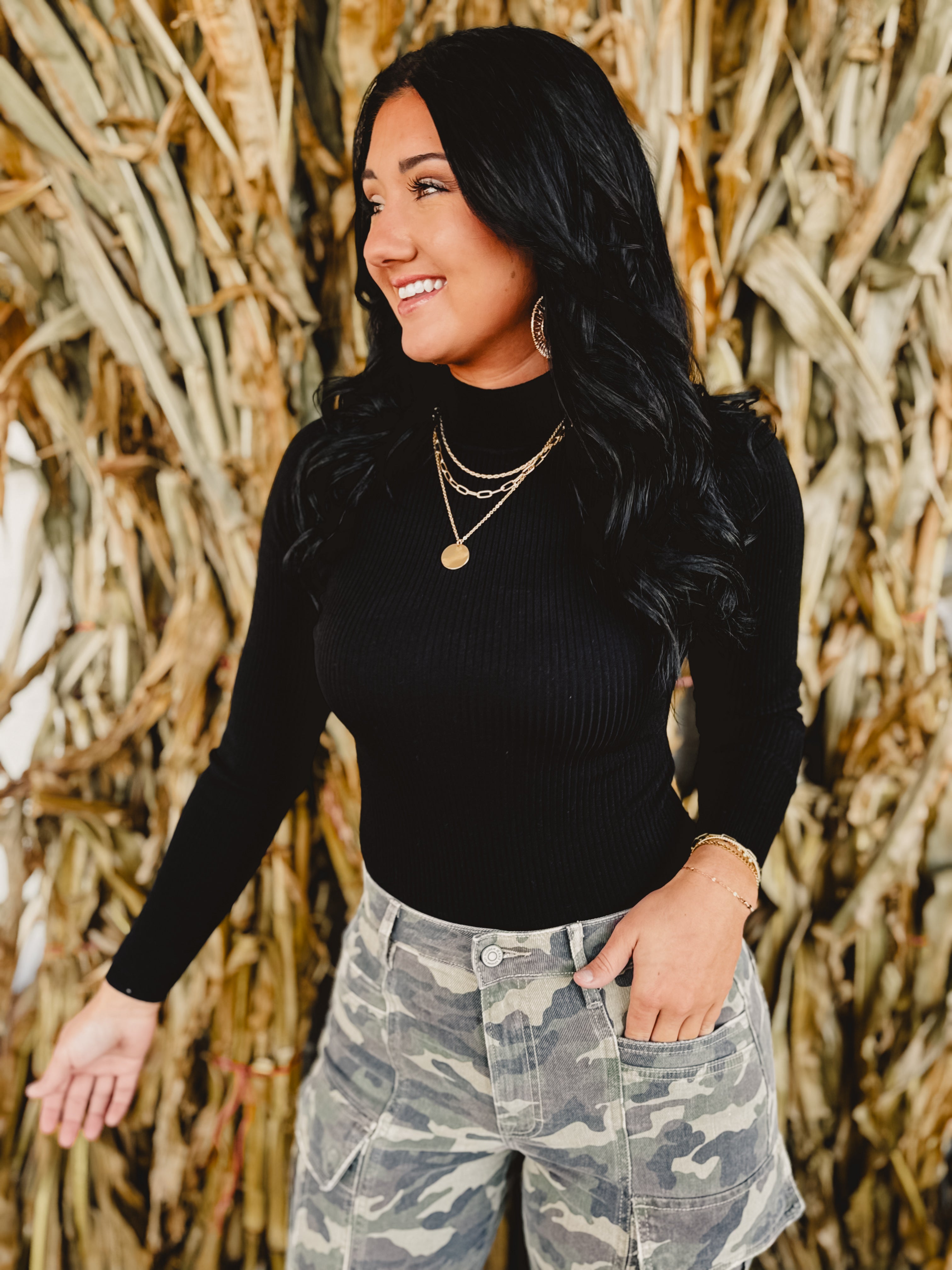 High Neck Long Sleeve Ribbed Bodysuit - Black