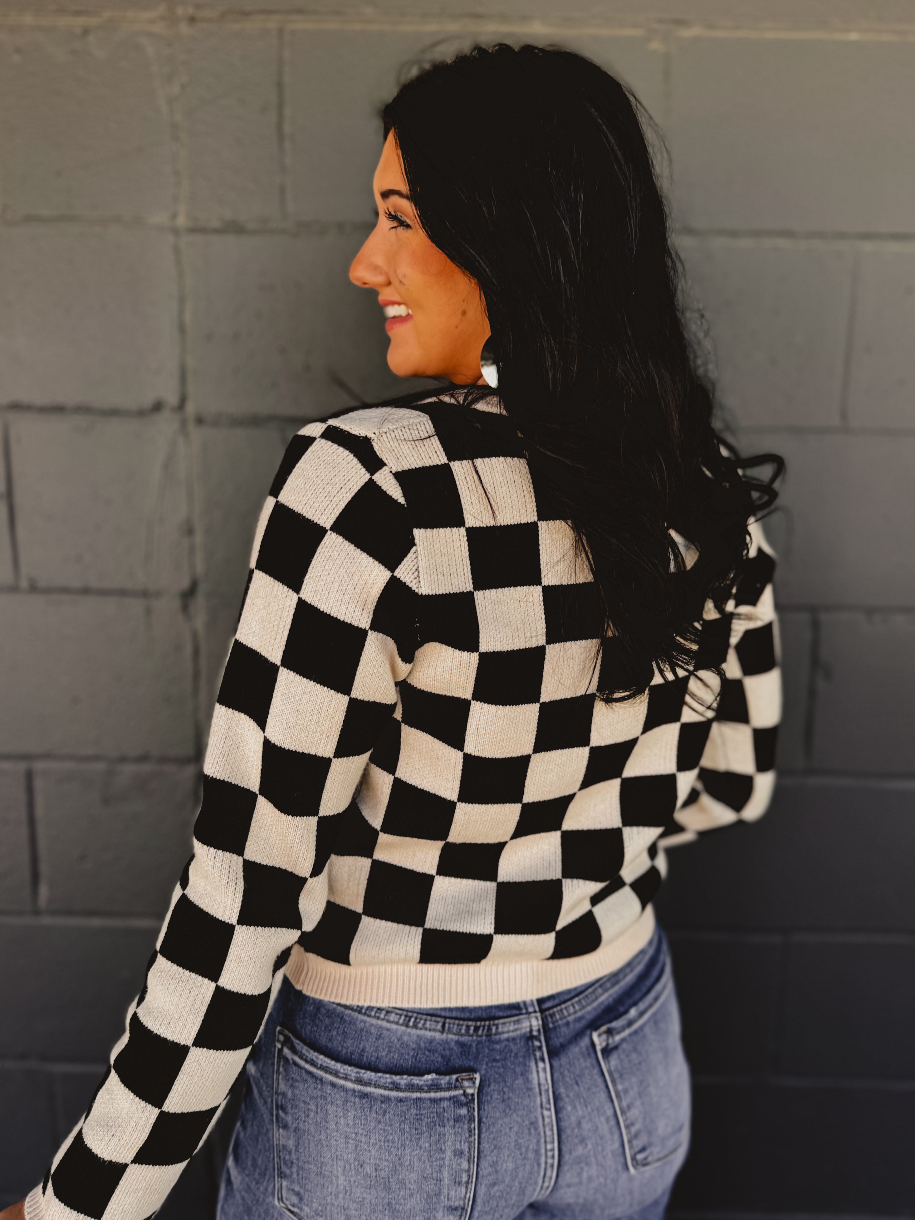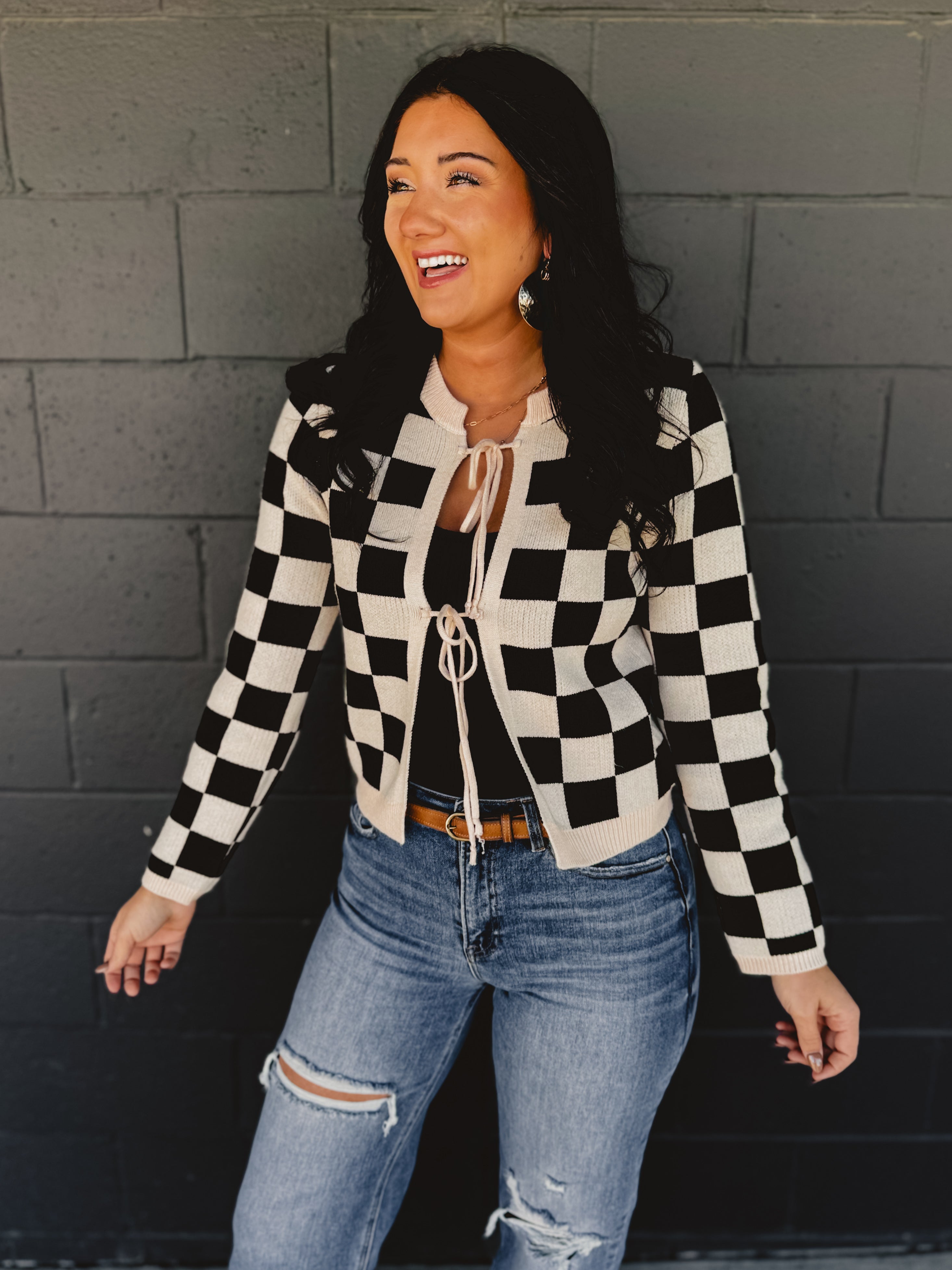 Checkered Tie Front Sweater Cardigan - Oatmeal/Black