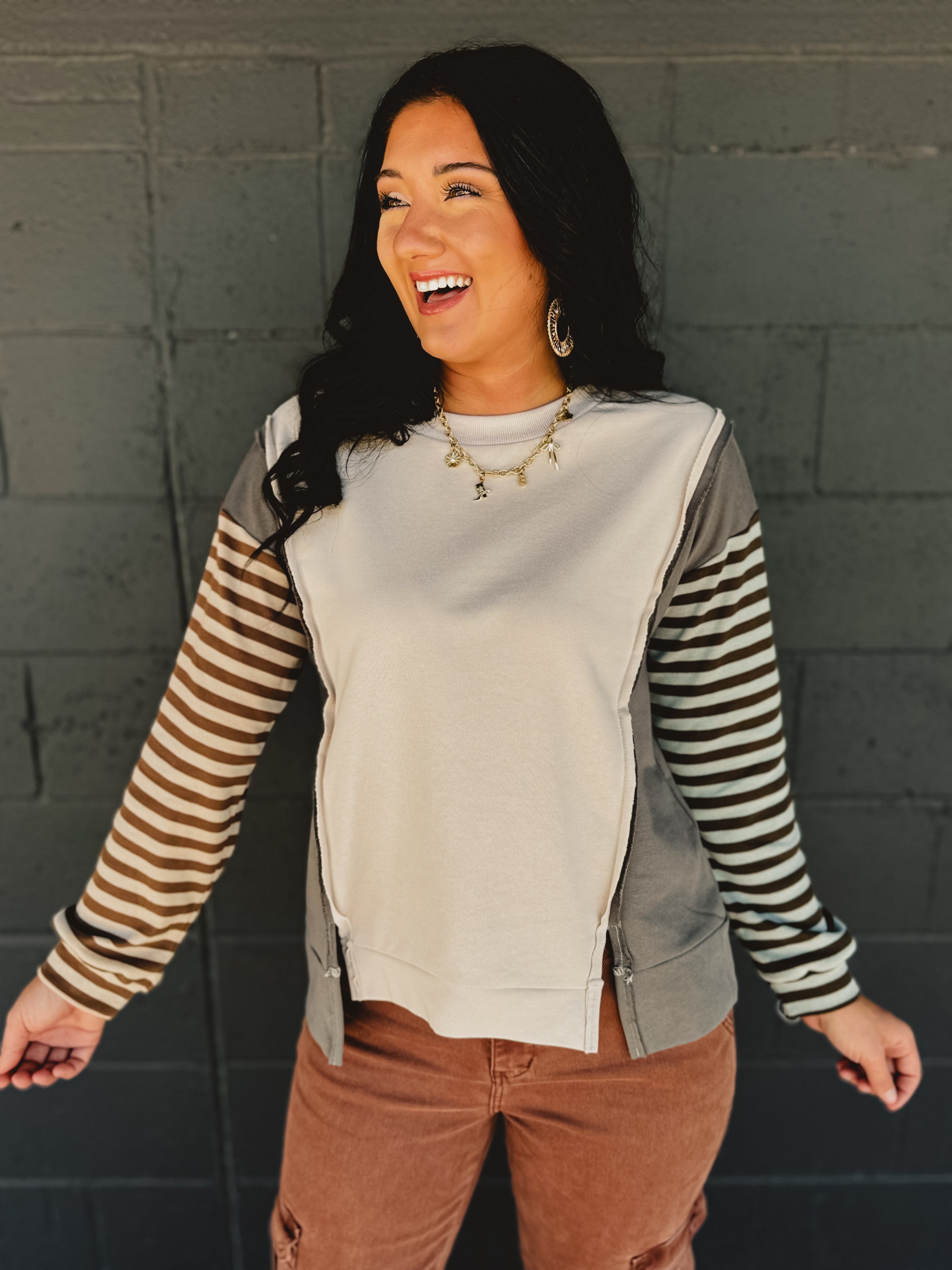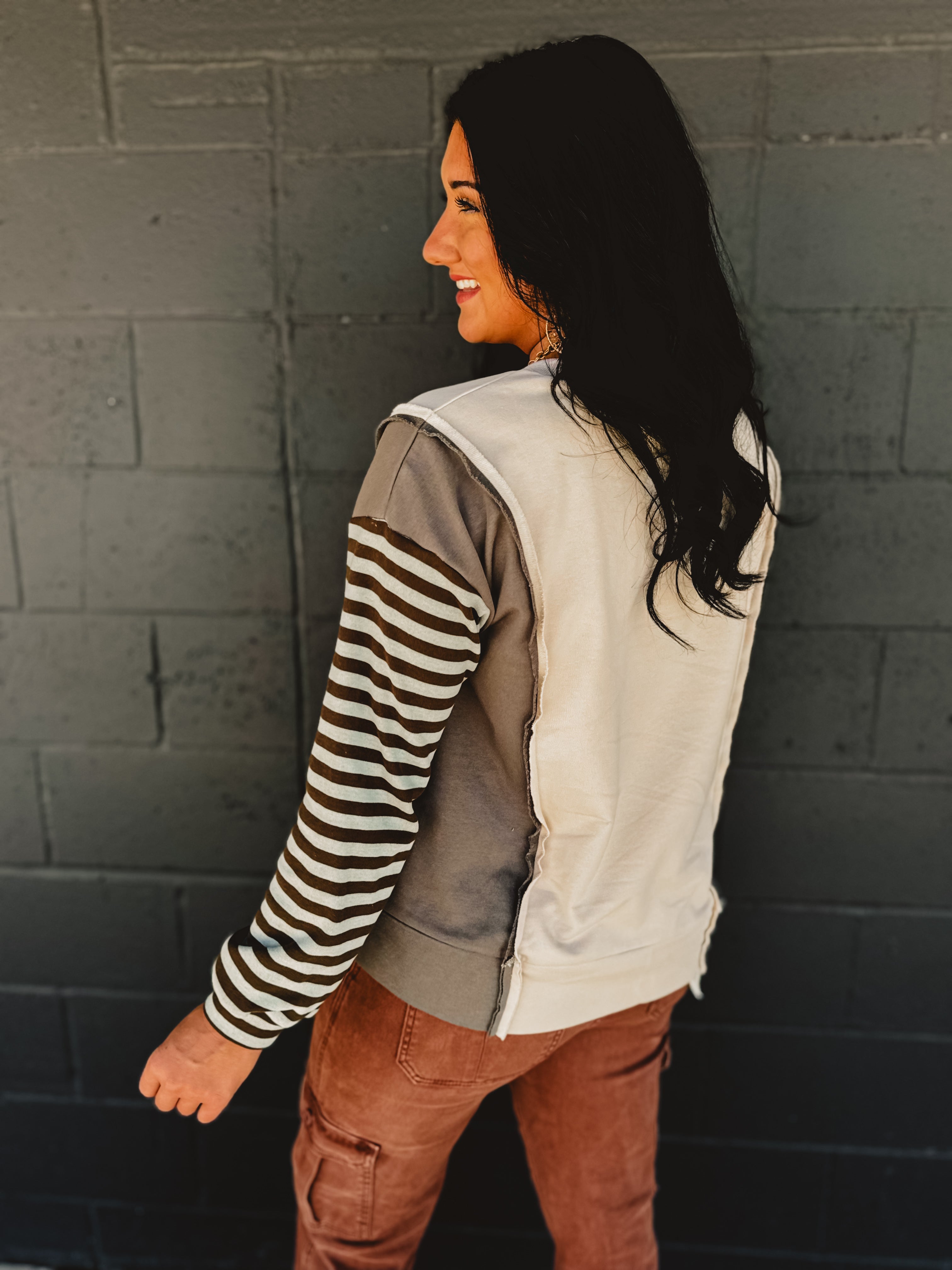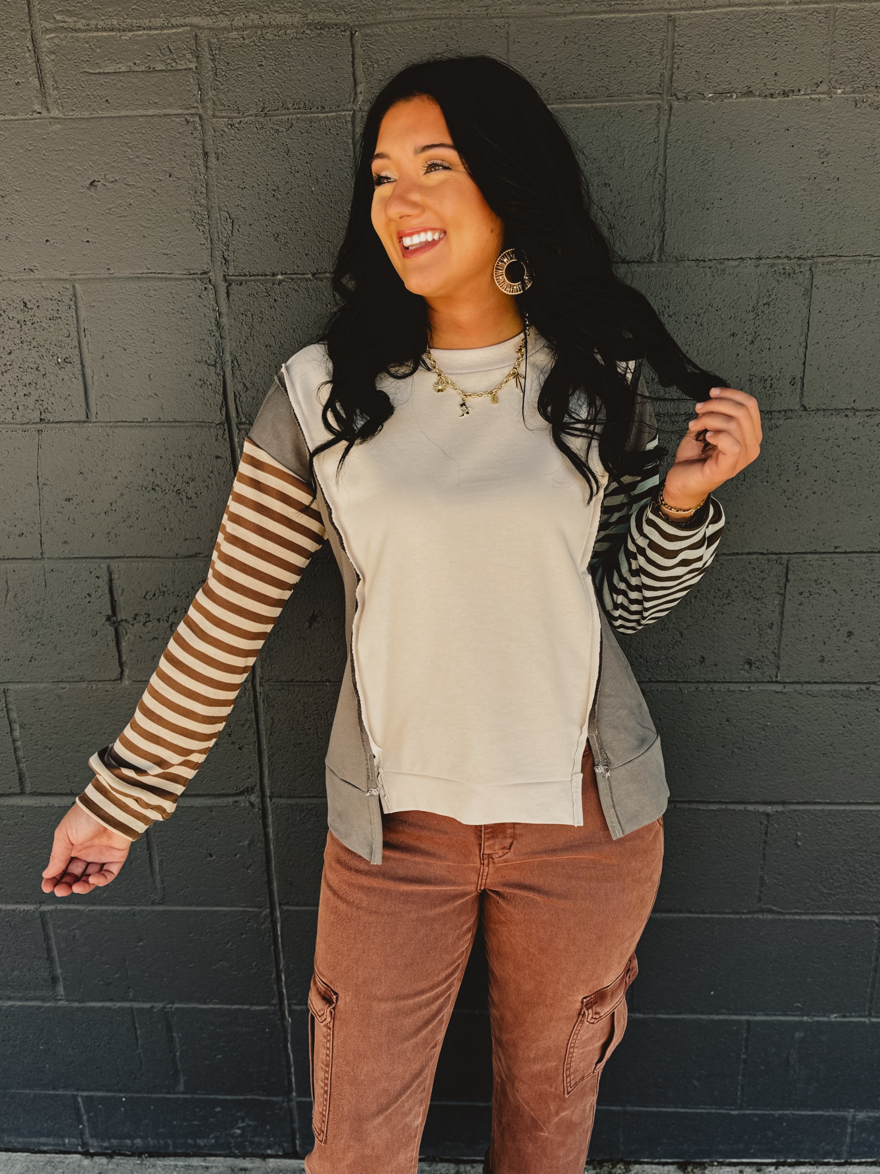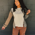 This striped sleeve top features a casual design with a relaxed fit, making it an easy go-to for everyday style and all-day comfort.