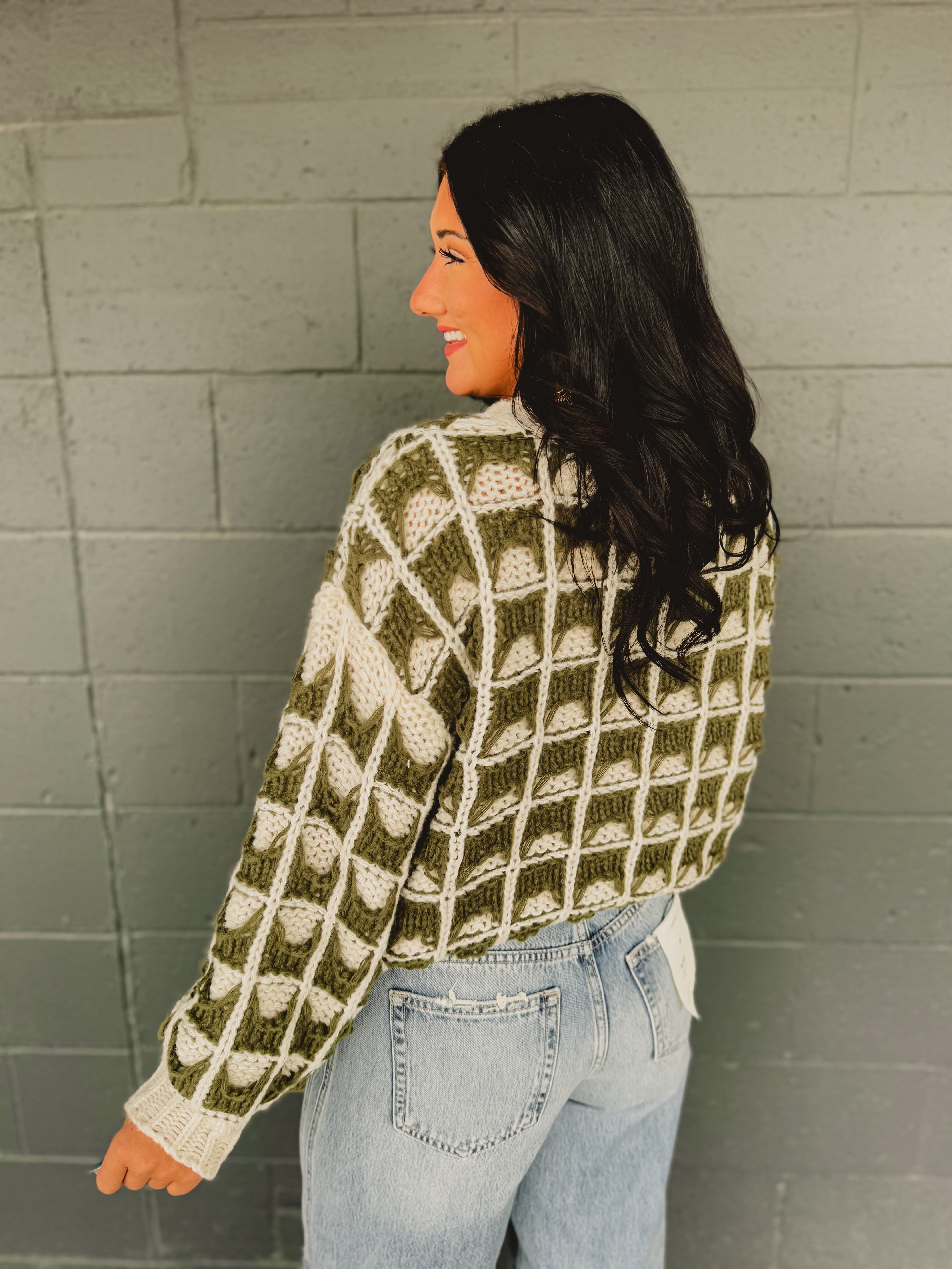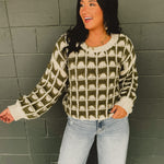 Stay cozy and stylish with the Contrast Square Knit Crewneck Sweater in Olive. Featuring a soft knit, drop shoulder, and striking contrast trim, this 100% polyester pullover blends comfort with eye-catching detail. Perfect for the season.
