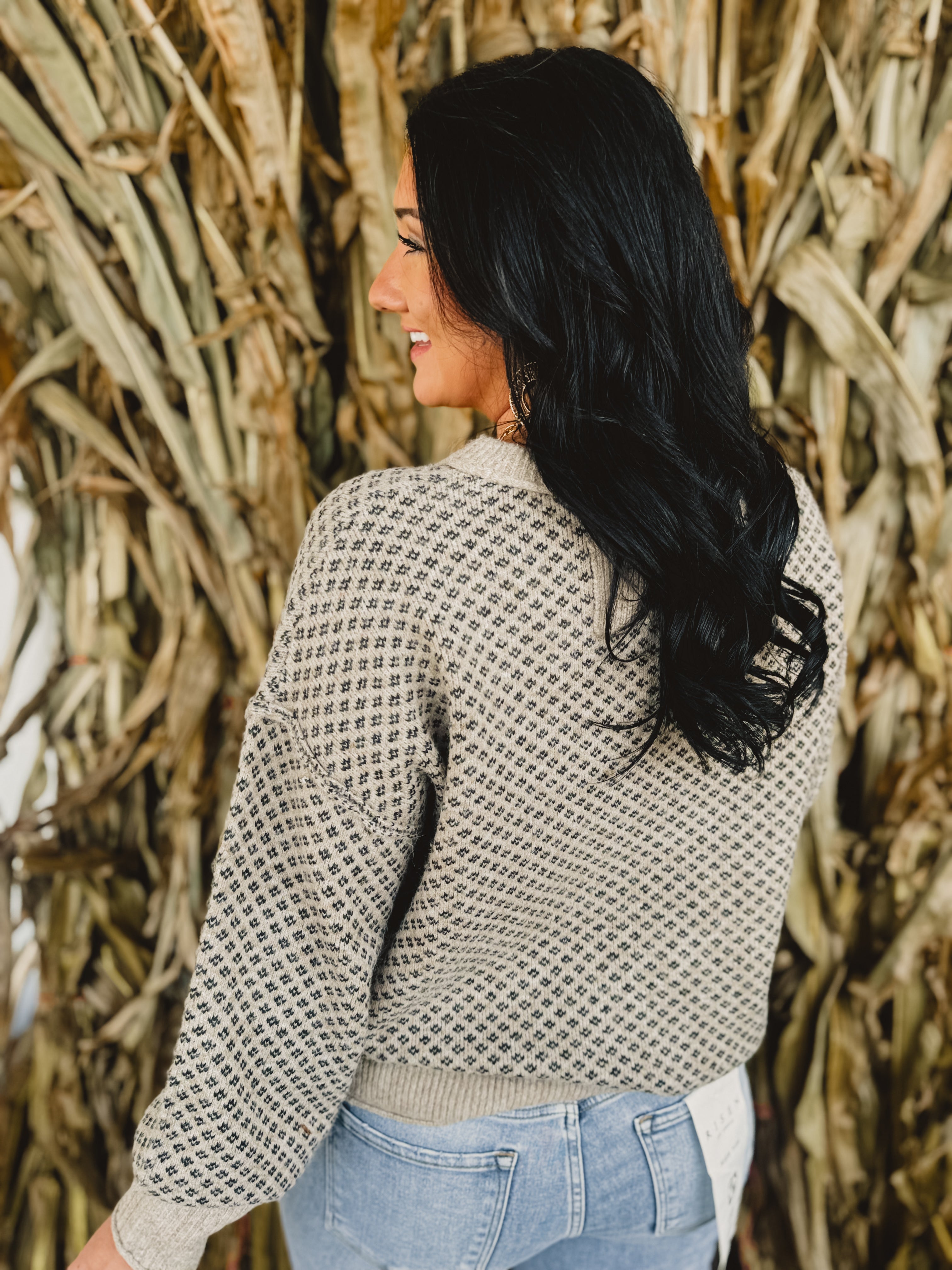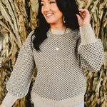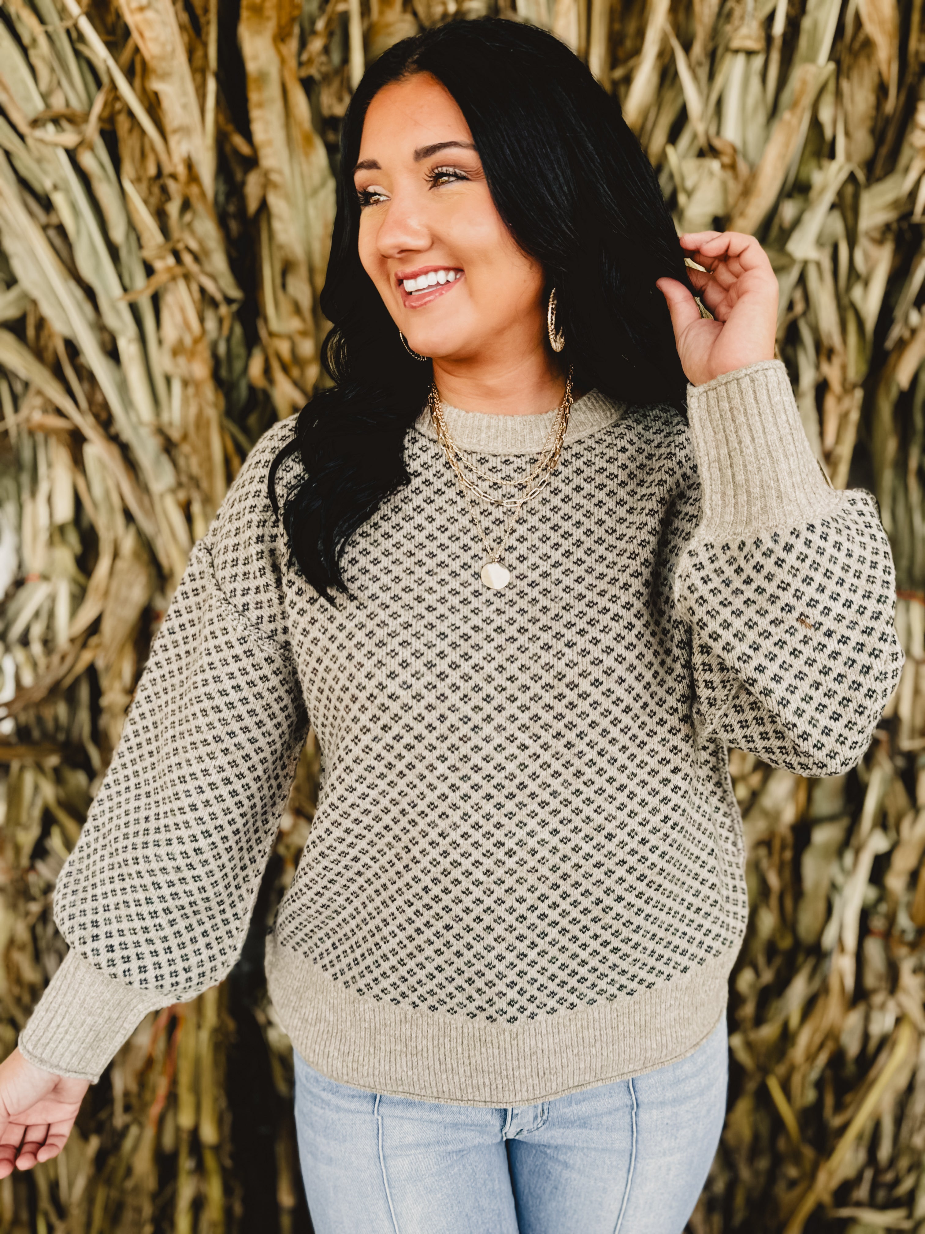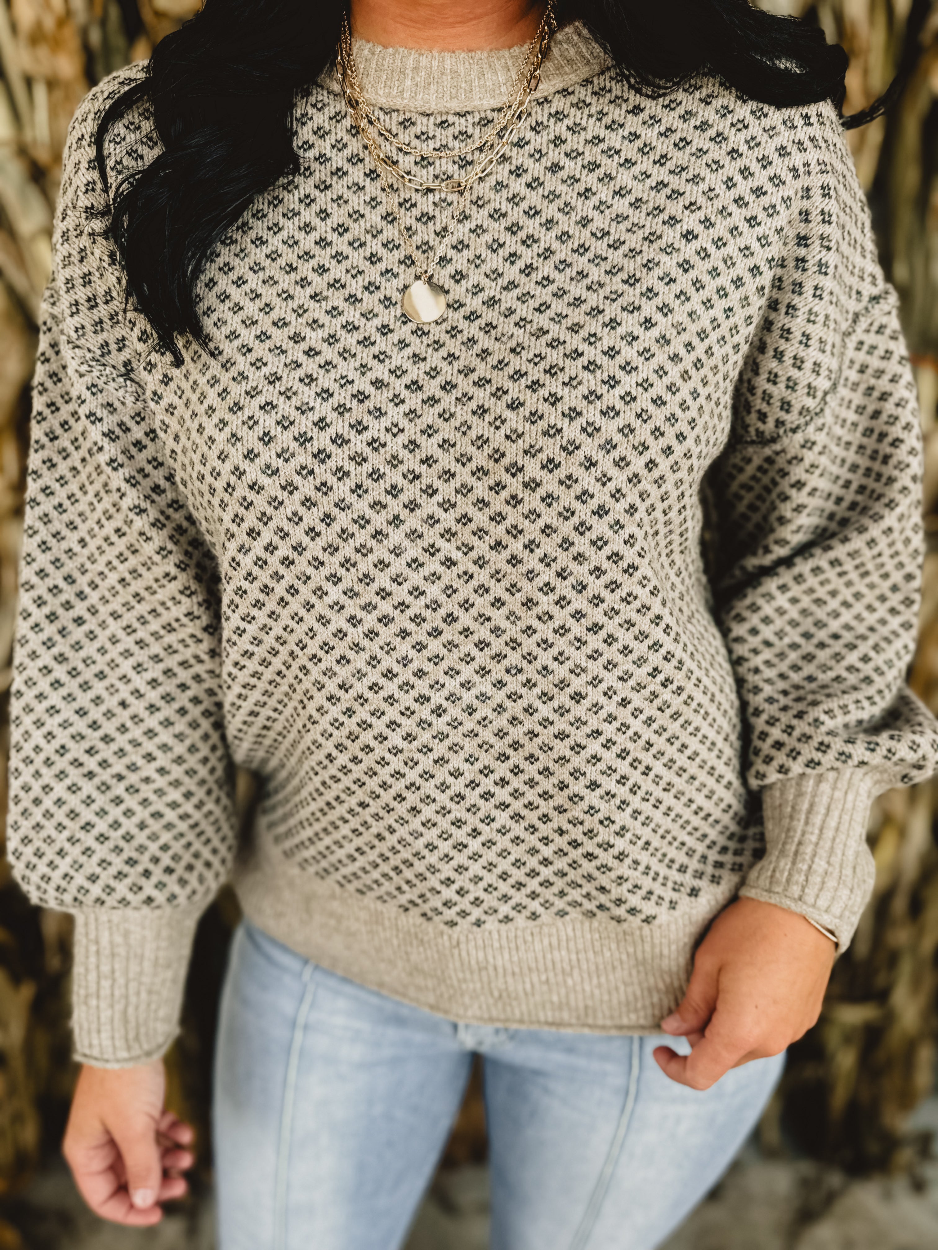 This khaki crewneck knit sweater with a jacquard pattern brings a touch of texture and timeless style to your cooler days wardrobe!