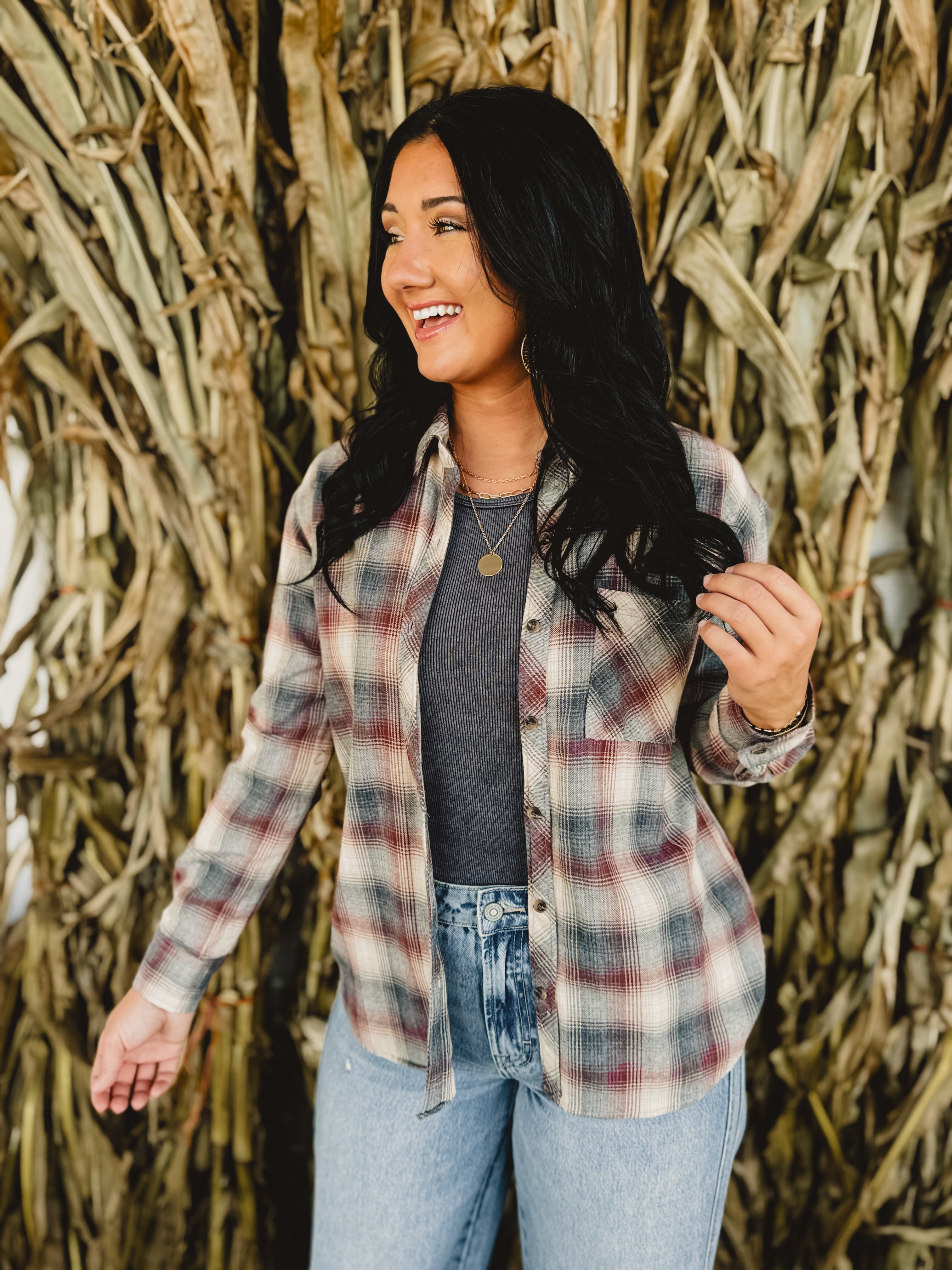 The Plaid Button Up Flannel - Grey Multi is all about comfort and versatility. With its round hem and long sleeves, it pairs perfectly with jeans, leggings, or even layered over a tee for a casual, put-together outfit. This is the flannel you’ll reach for again and again.