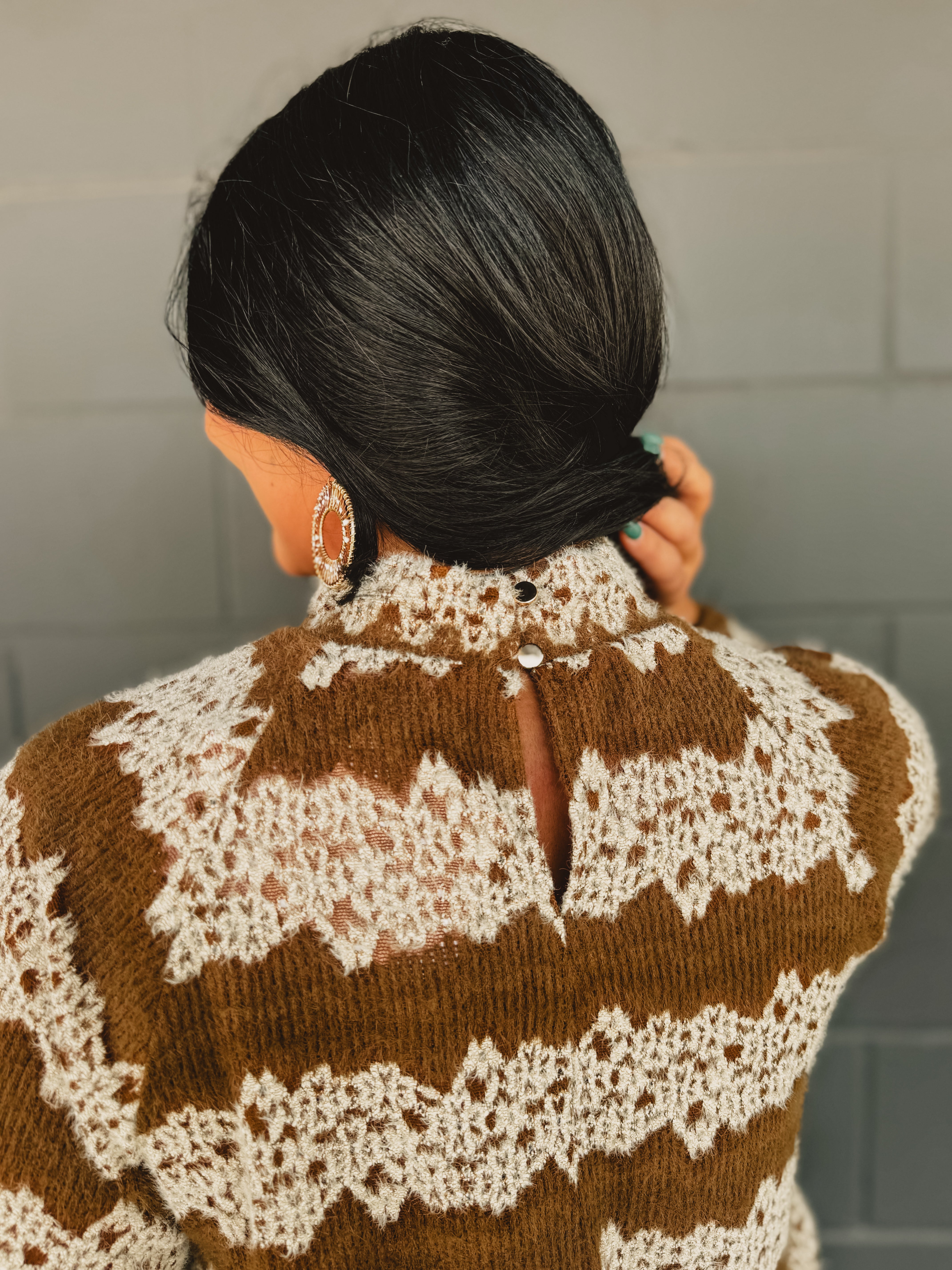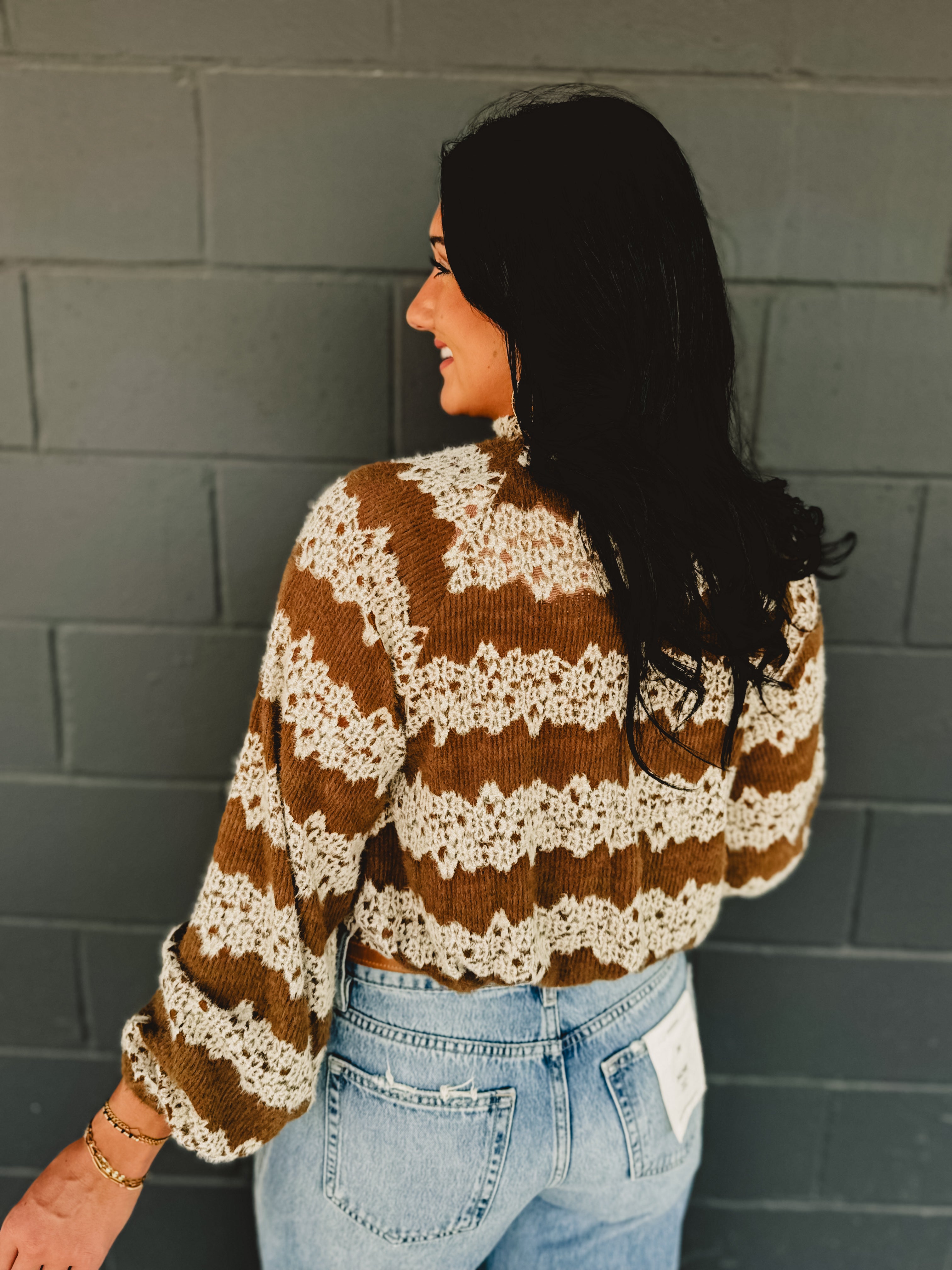 This mocha knit top with striped floral detail and a mock neck design offers a chic, feminine touch for effortless everyday style!