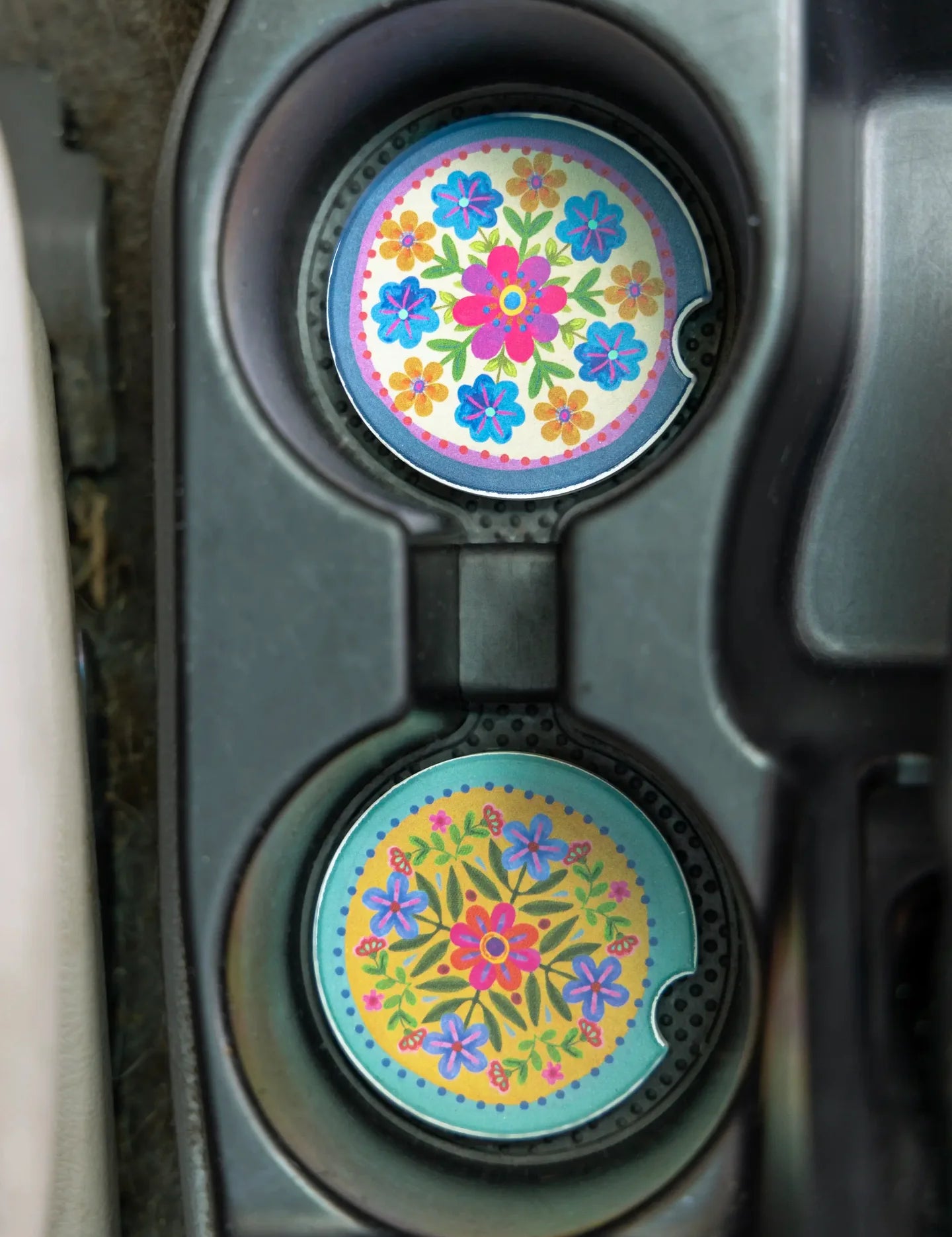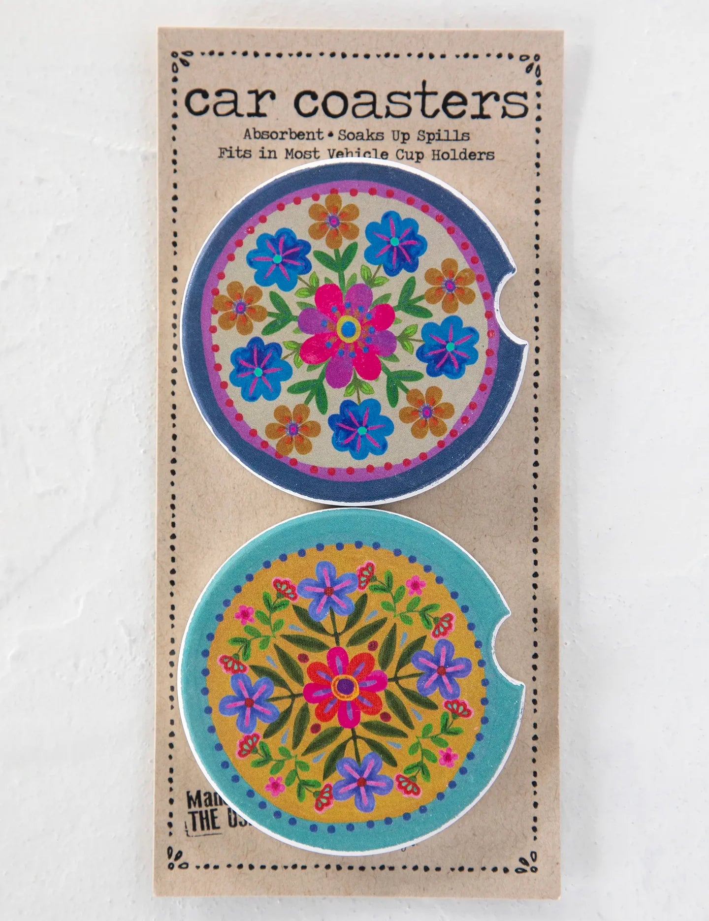Natural Life Car Coasters, Set of 2 - Mustard Folk Flower
