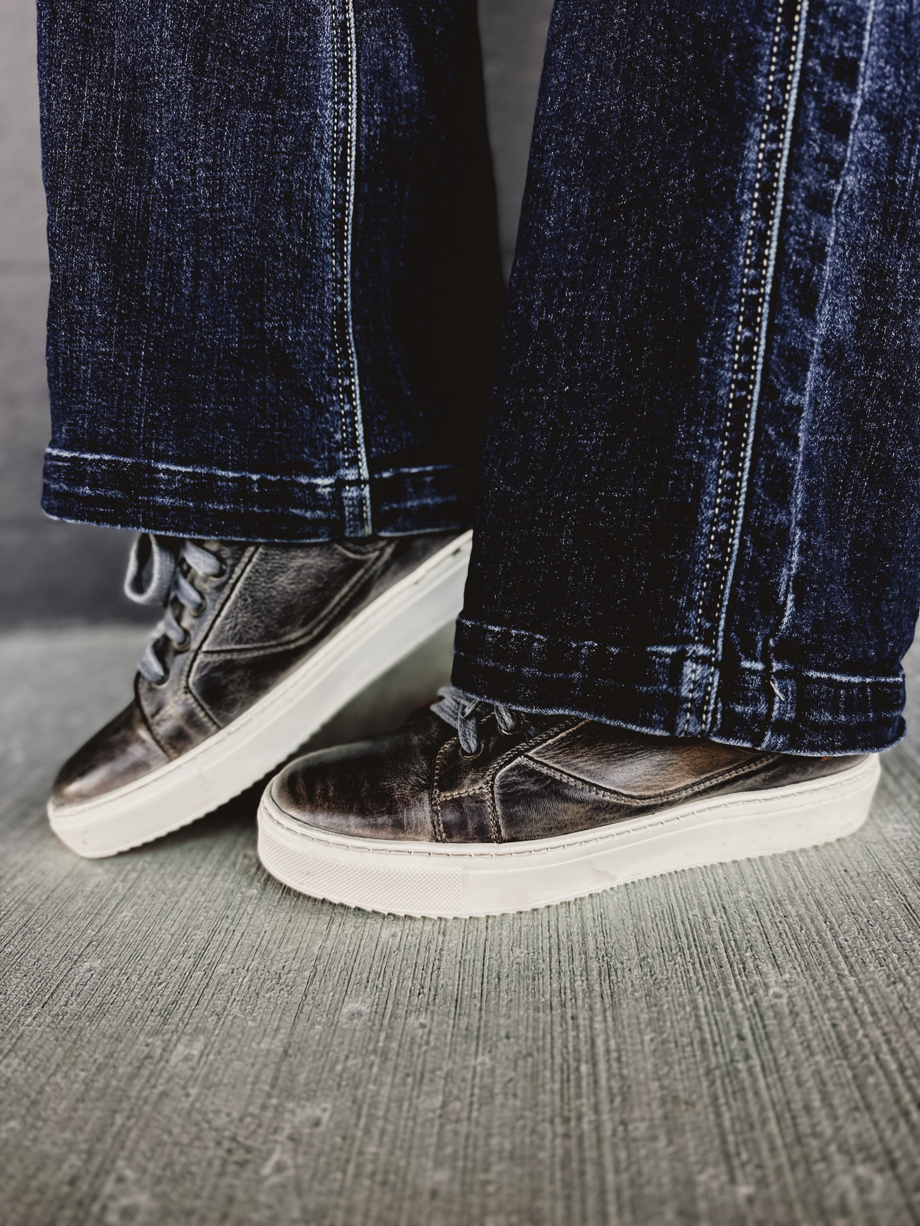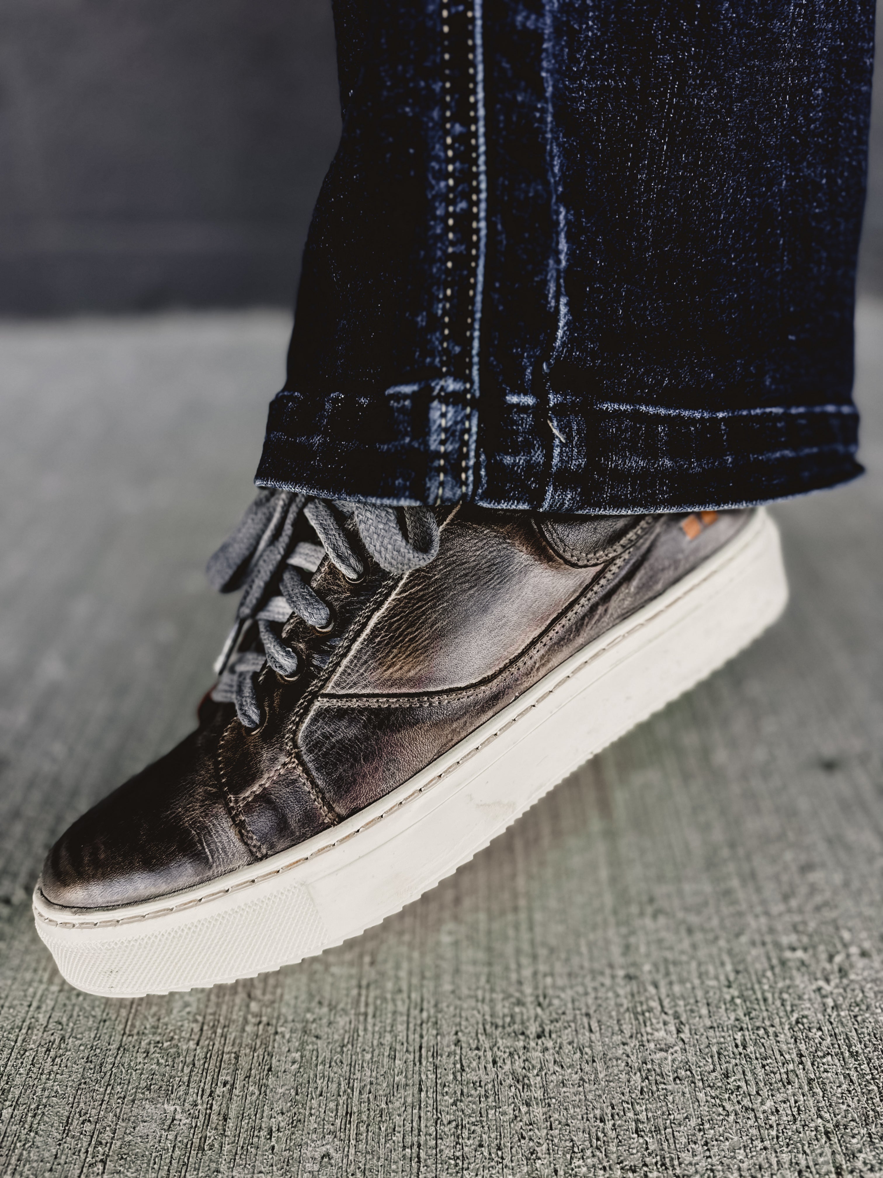 The Bedstu Azeli Sneaker in Graphite Rustic combines timeless style with exceptional comfort, featuring hand-stitched details and a durable white outsole for a sleek, versatile look that adapts effortlessly to any occasion.