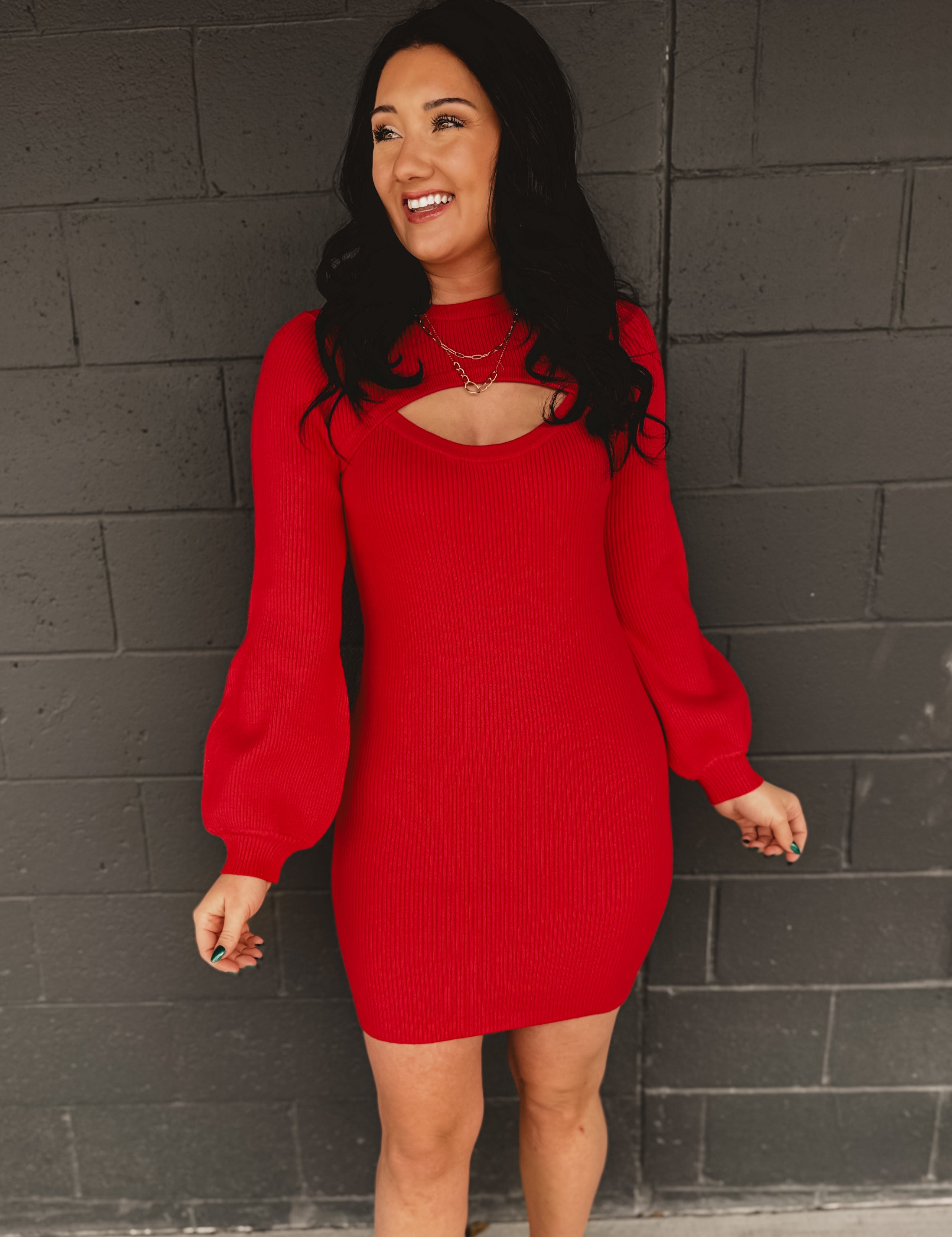 Cut-Out Detail Long Sleeve Sweater Mini Dress - Red