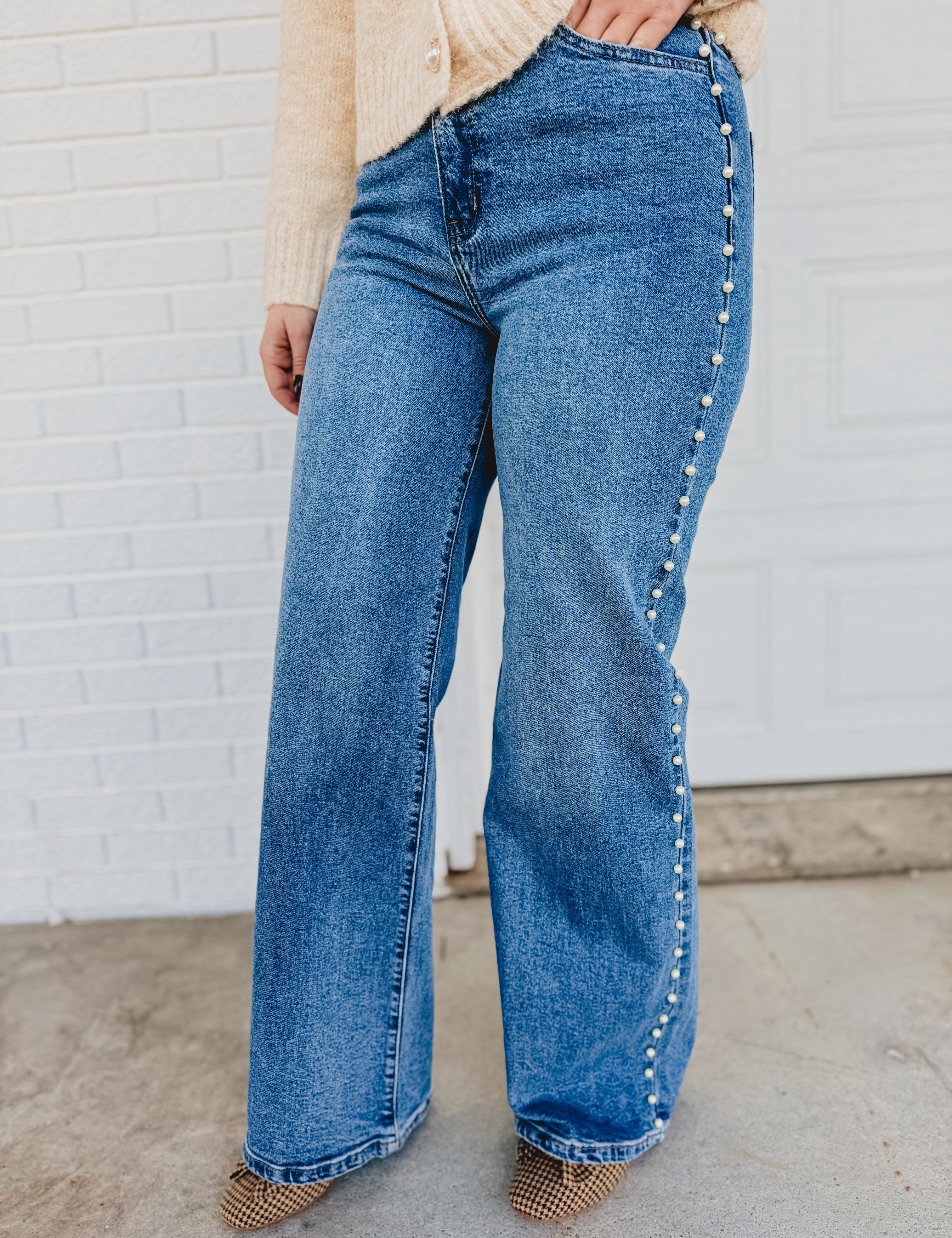 Pearl Detail High-Rise Wide Leg Jeans - Medium