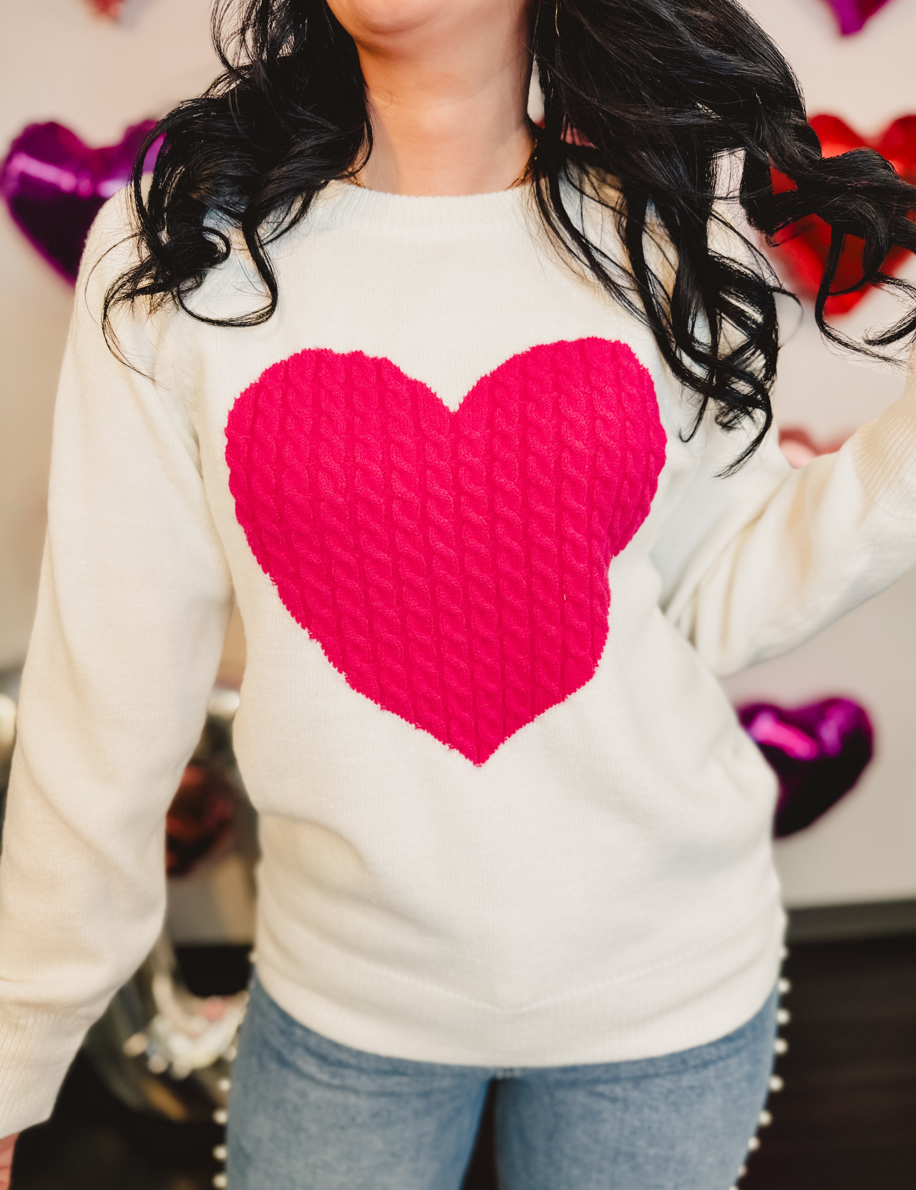 Cable Knit Heart Detail Knit Sweater - White/Pink