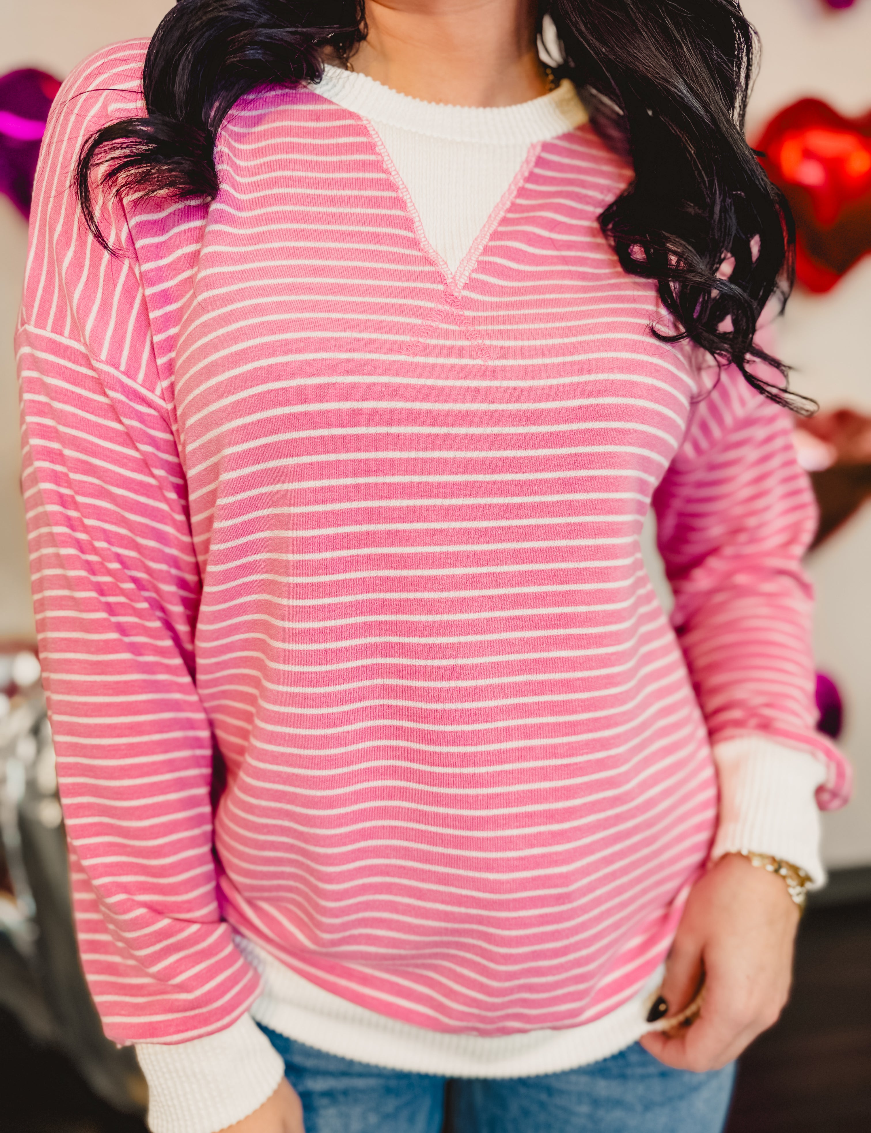 Striped Drop Shoulder Pullover Sweatshirt - Pink