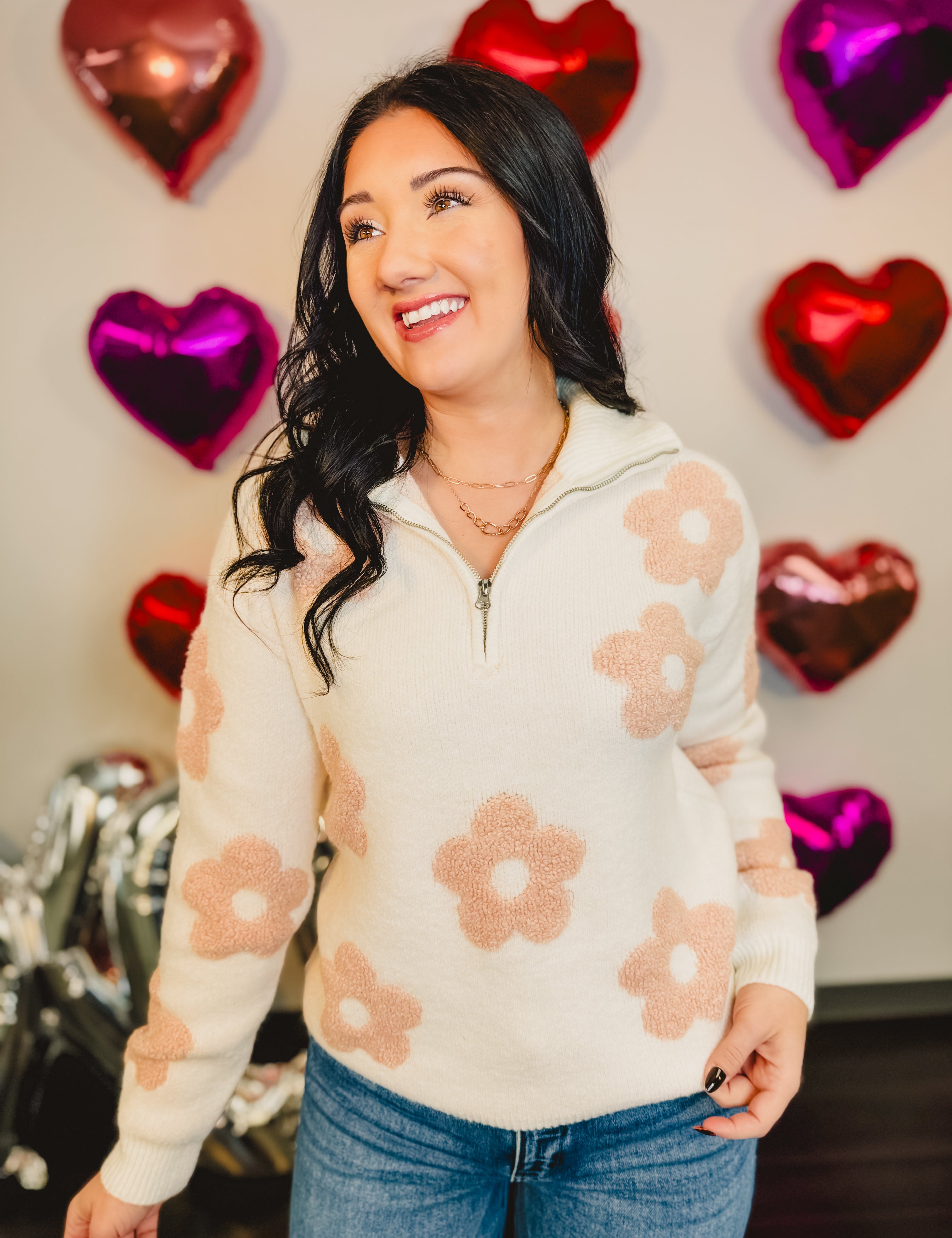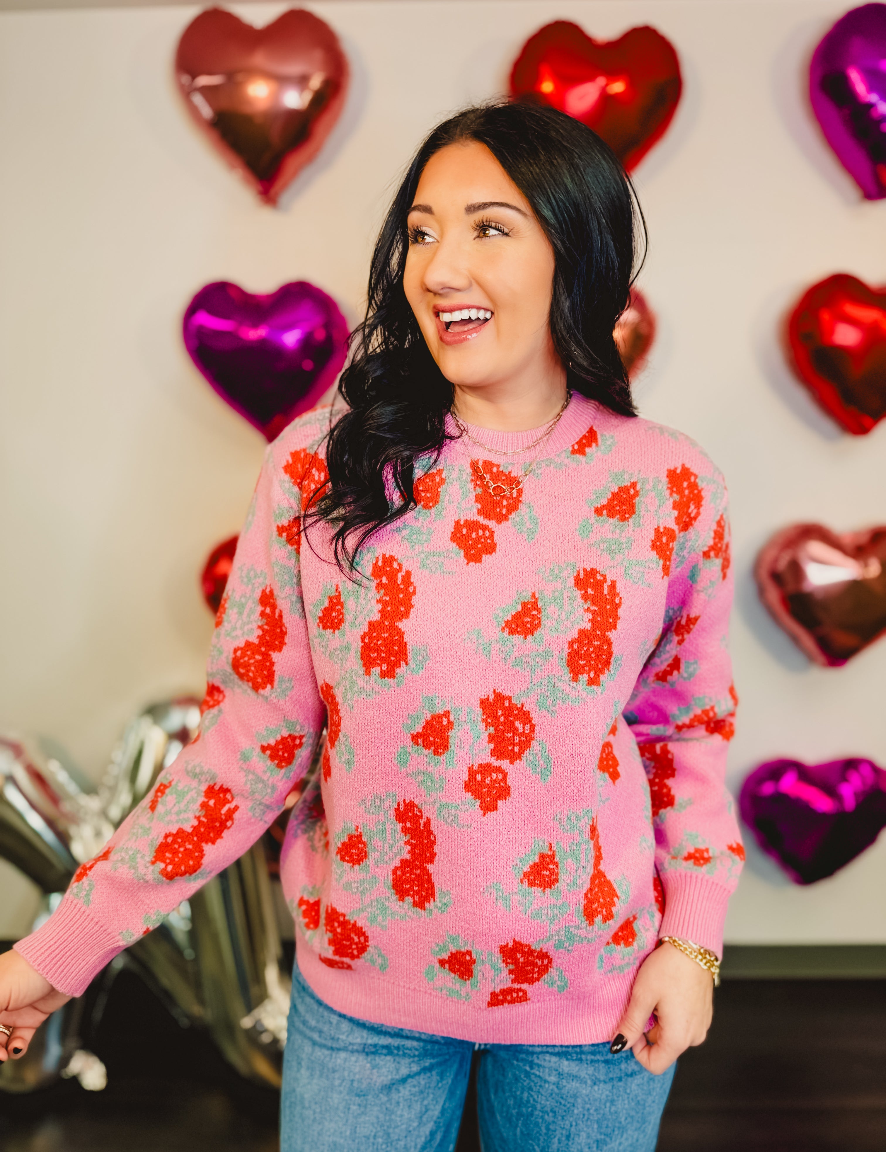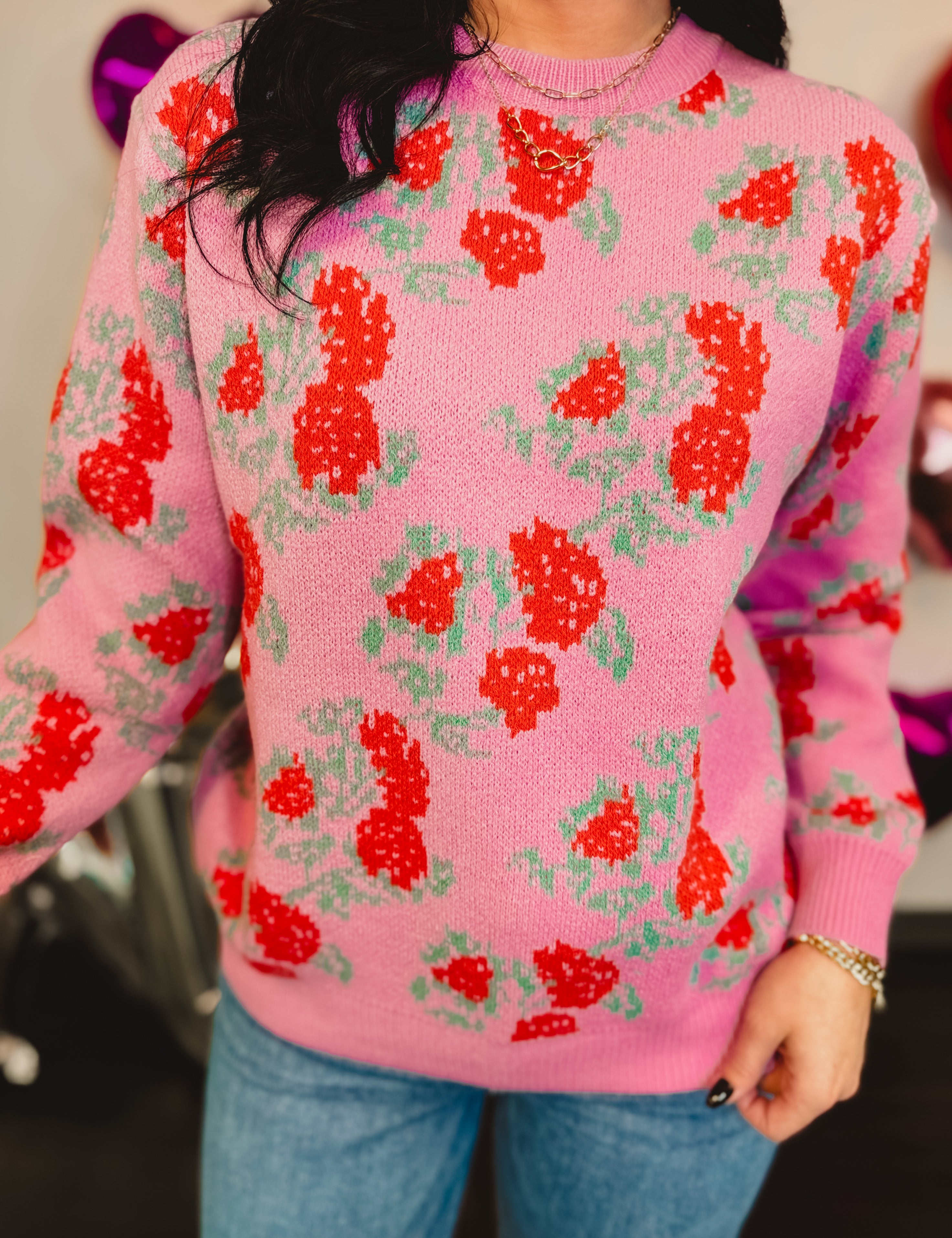 Rose Print Crewneck Knit Sweater - Pink/Red