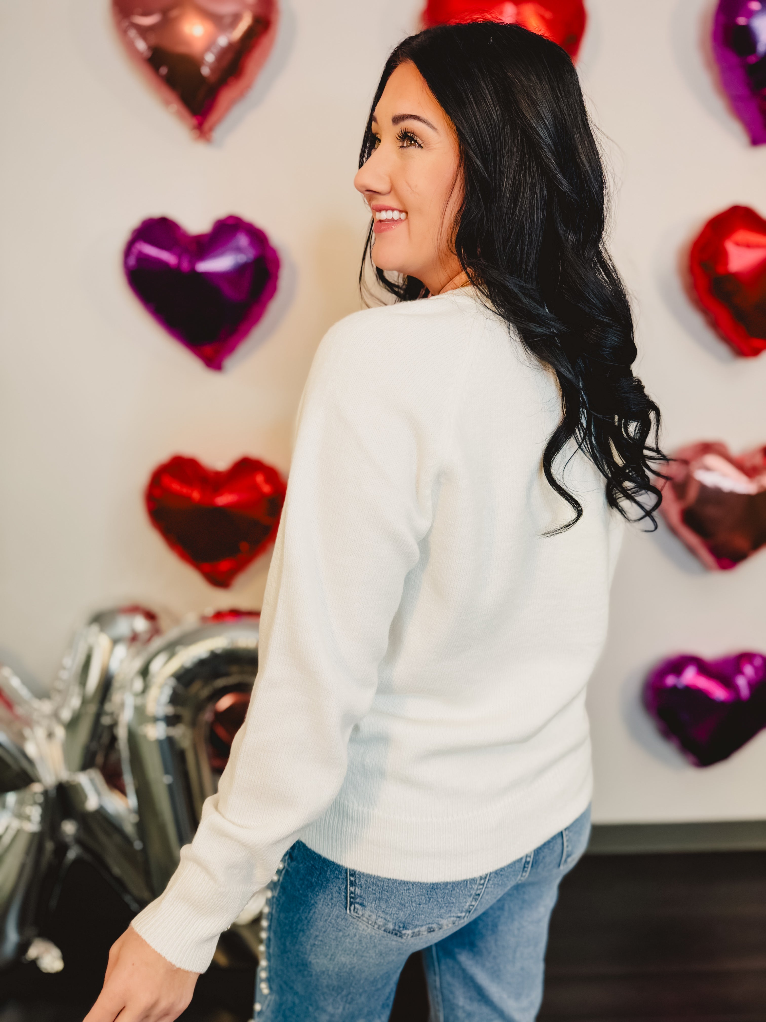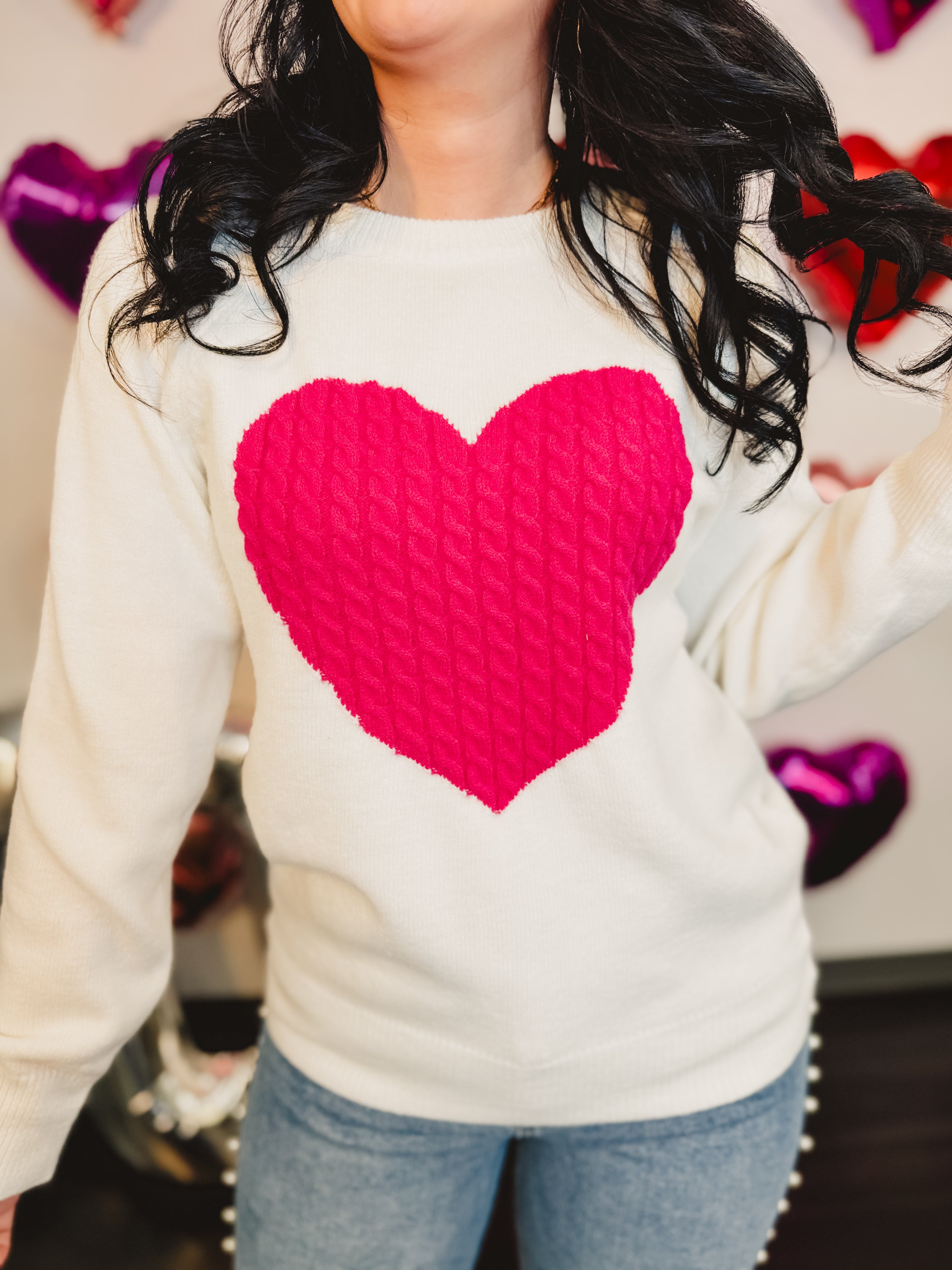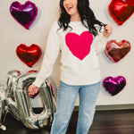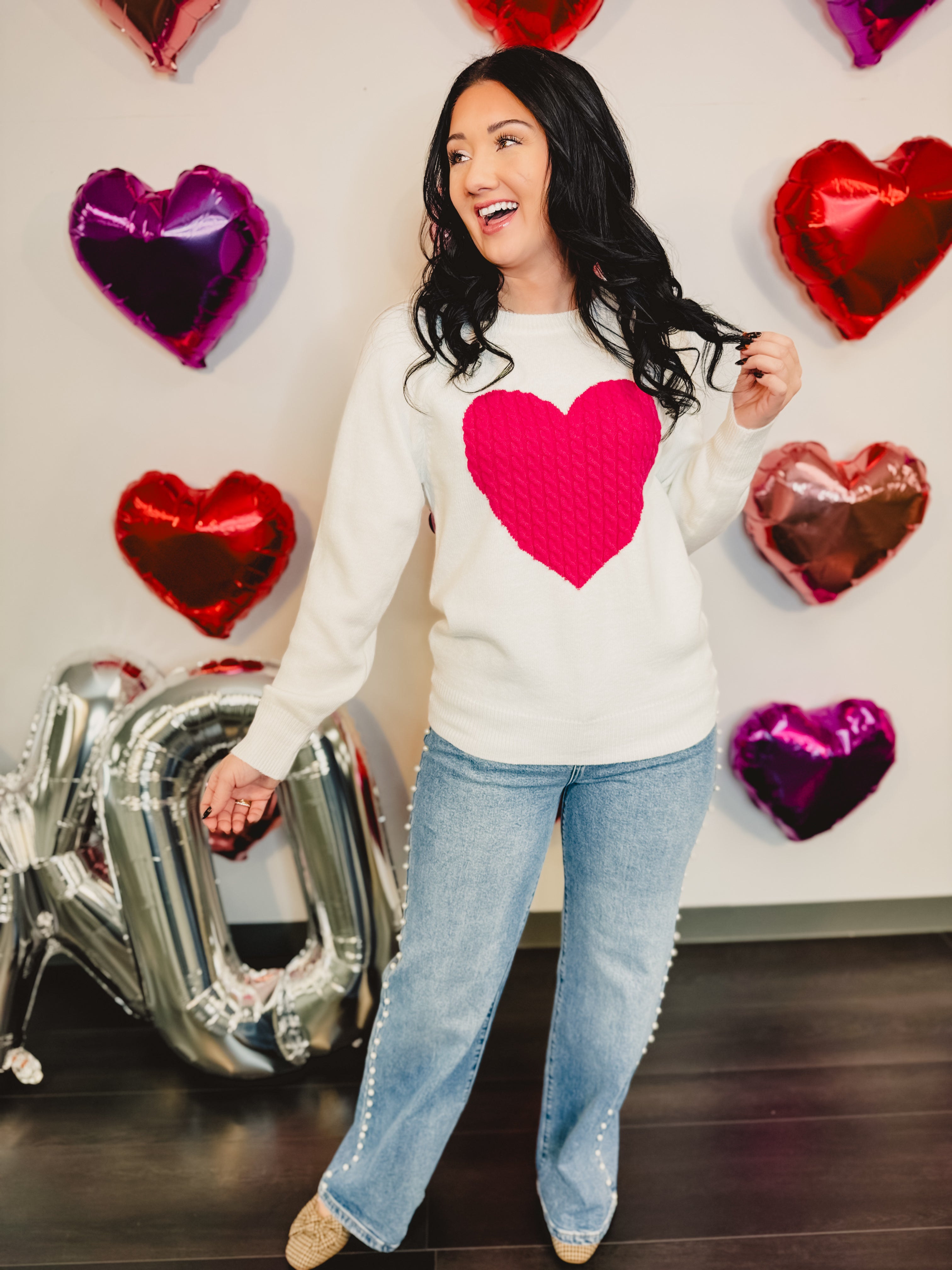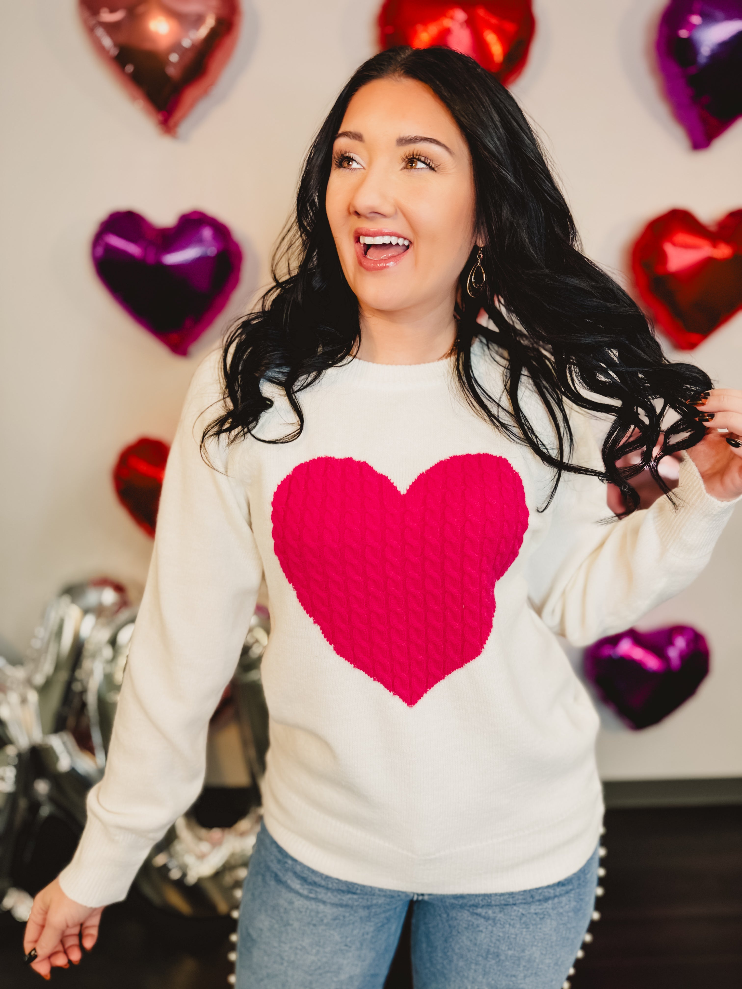 A cozy statement sweater with a playful Valentine twist. Soft and comfy with a bold heart detail that makes it perfect for the season!
