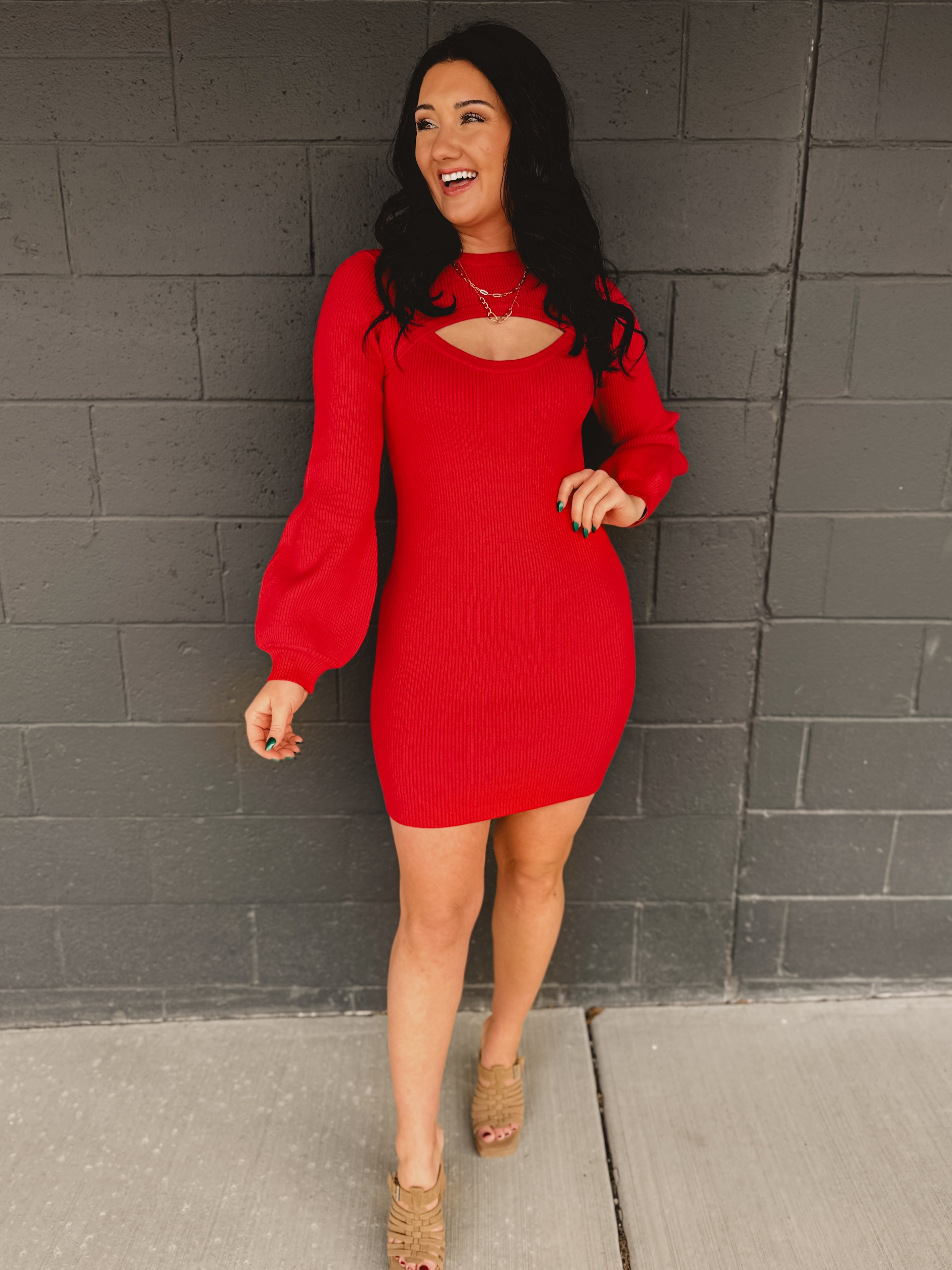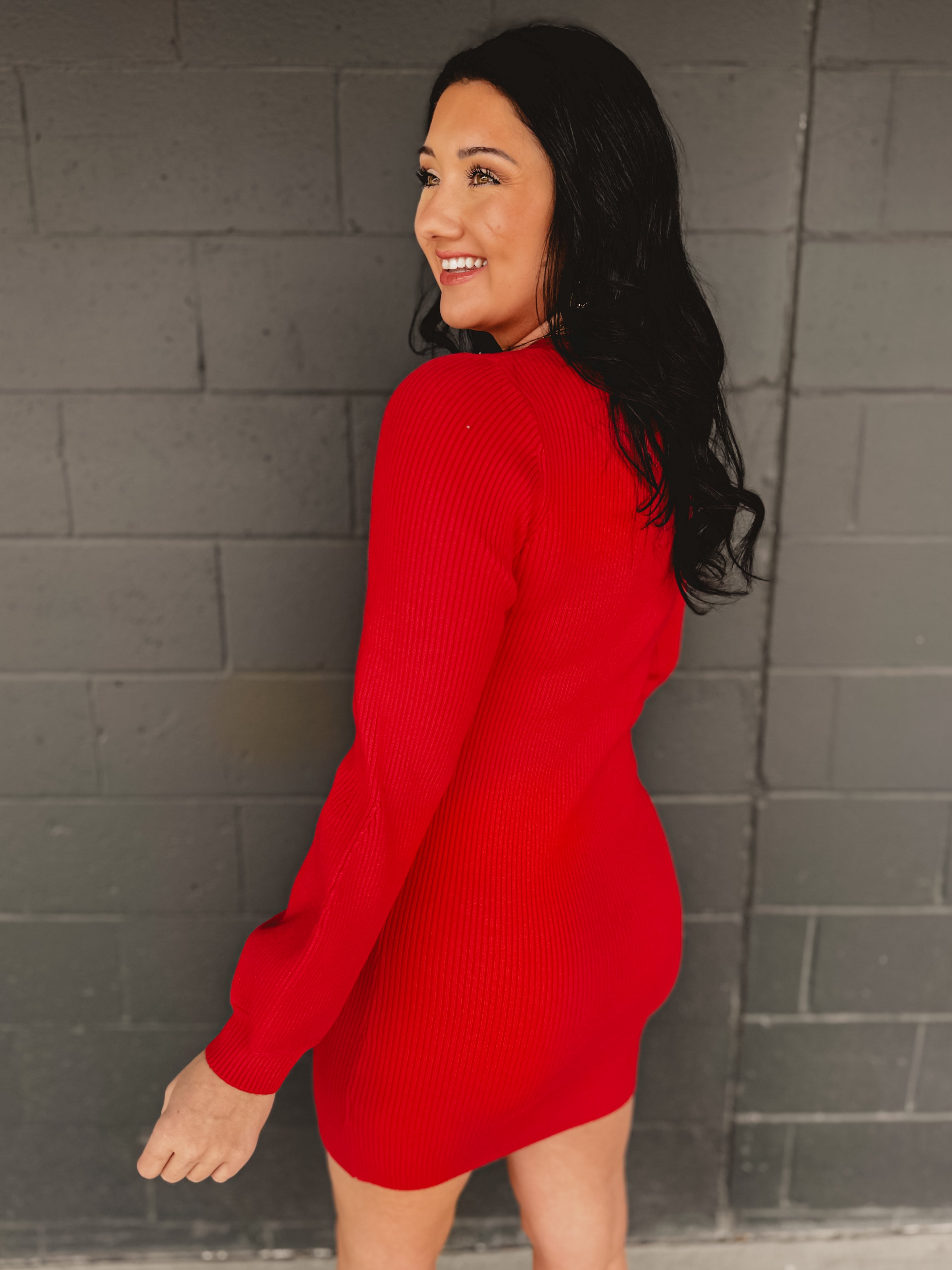 A bold and flattering knit dress that makes a statement with minimal effort. Perfect for date nights, special occasions, or Valentine’s plans.