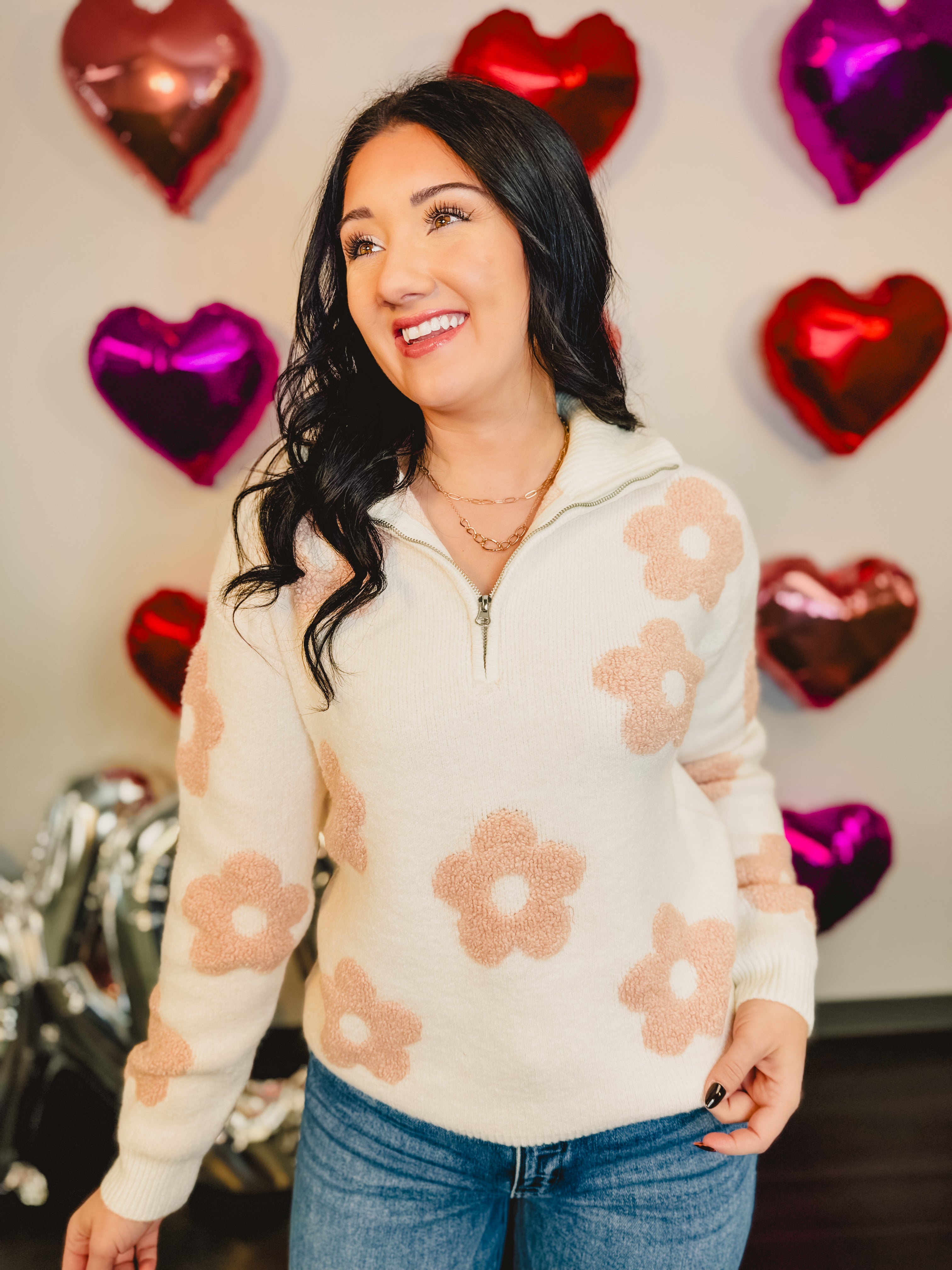 Soft, cozy, and effortlessly charming, this knit sweater features raised floral texture and a flattering quarter-zip neckline for an easy blend of comfort and style. Perfect for casual days when you still want a polished, feminine look.