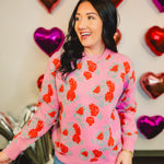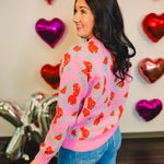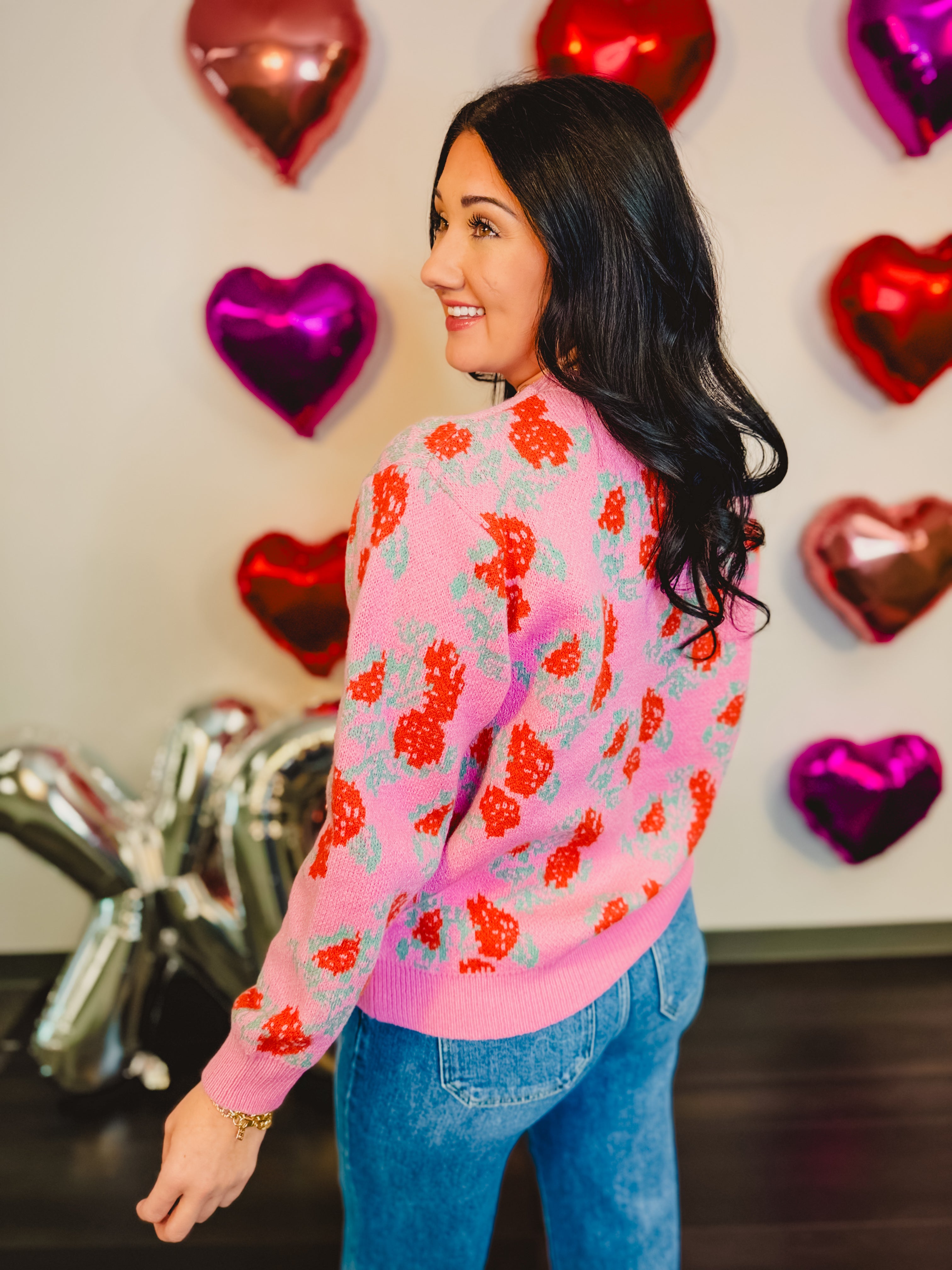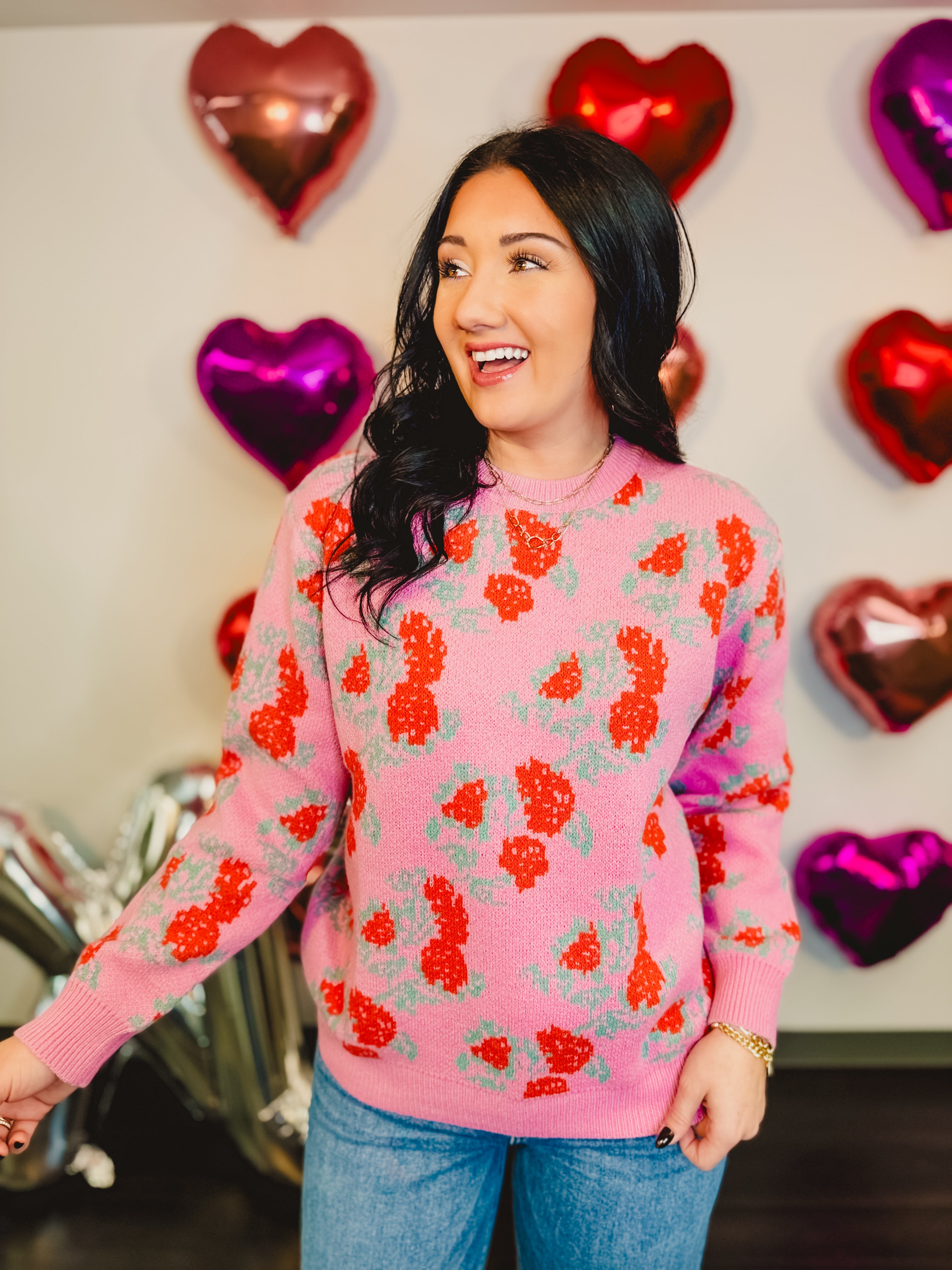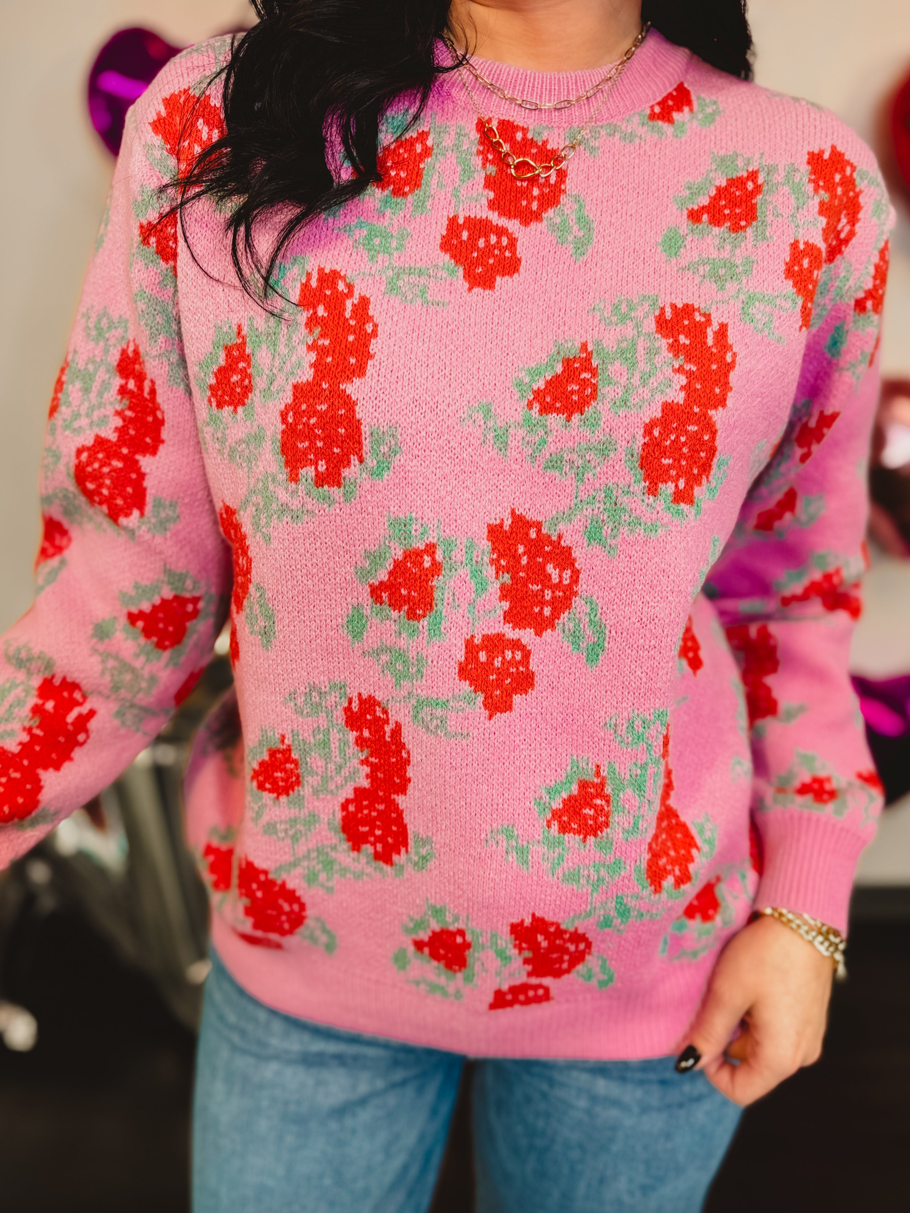 Rose Print Crewneck Knit Sweater - Pink/Red