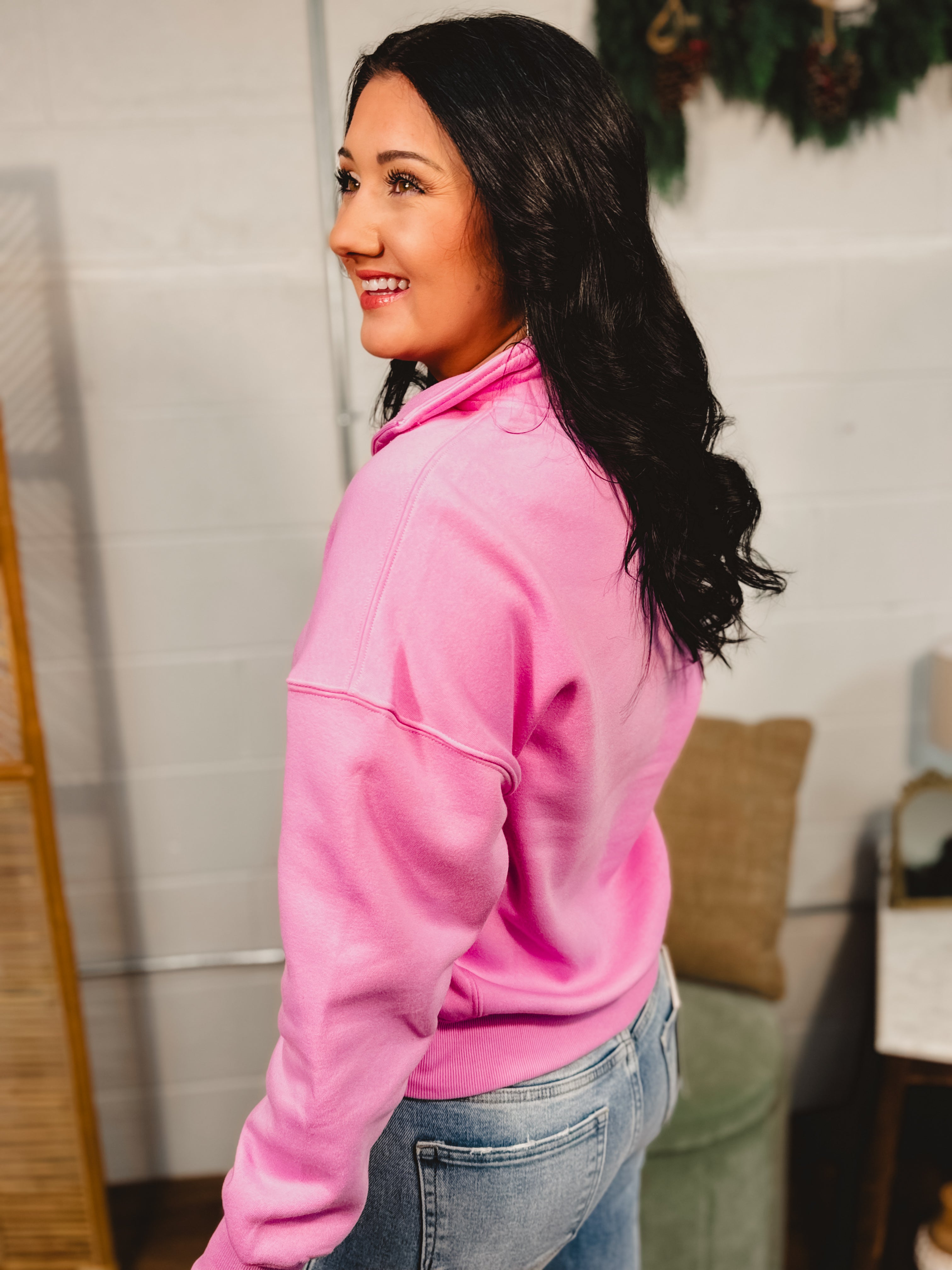 Cozy meets cute in this soft fleece half-zip, now in the sweetest candy pink shade. The high neckline and relaxed fit make it the perfect throw-on-and-go layer for errands, lounging, or styling up your everyday looks.