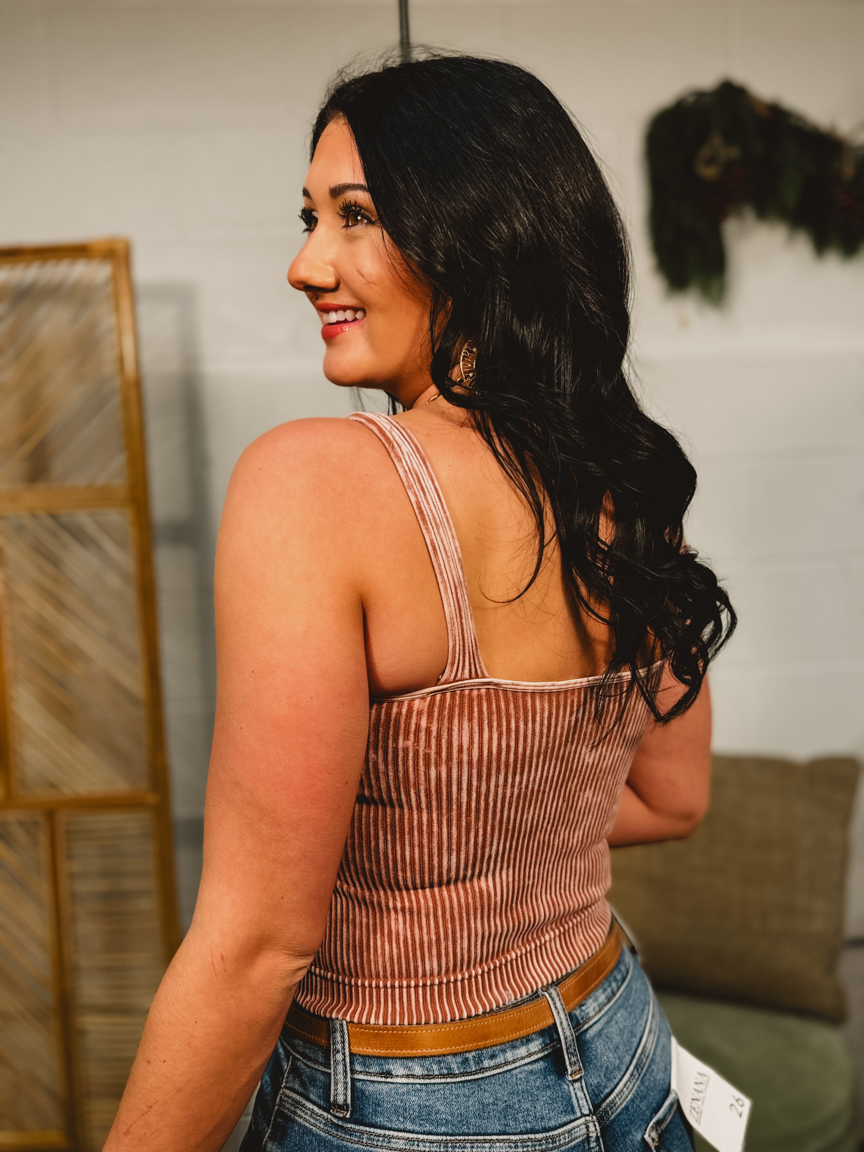 Elevate your basics with this rich deep camel ribbed tank—warm, stylish, and unbelievably comfortable. Its medium-length silhouette makes it a must-have staple for all-season outfits.