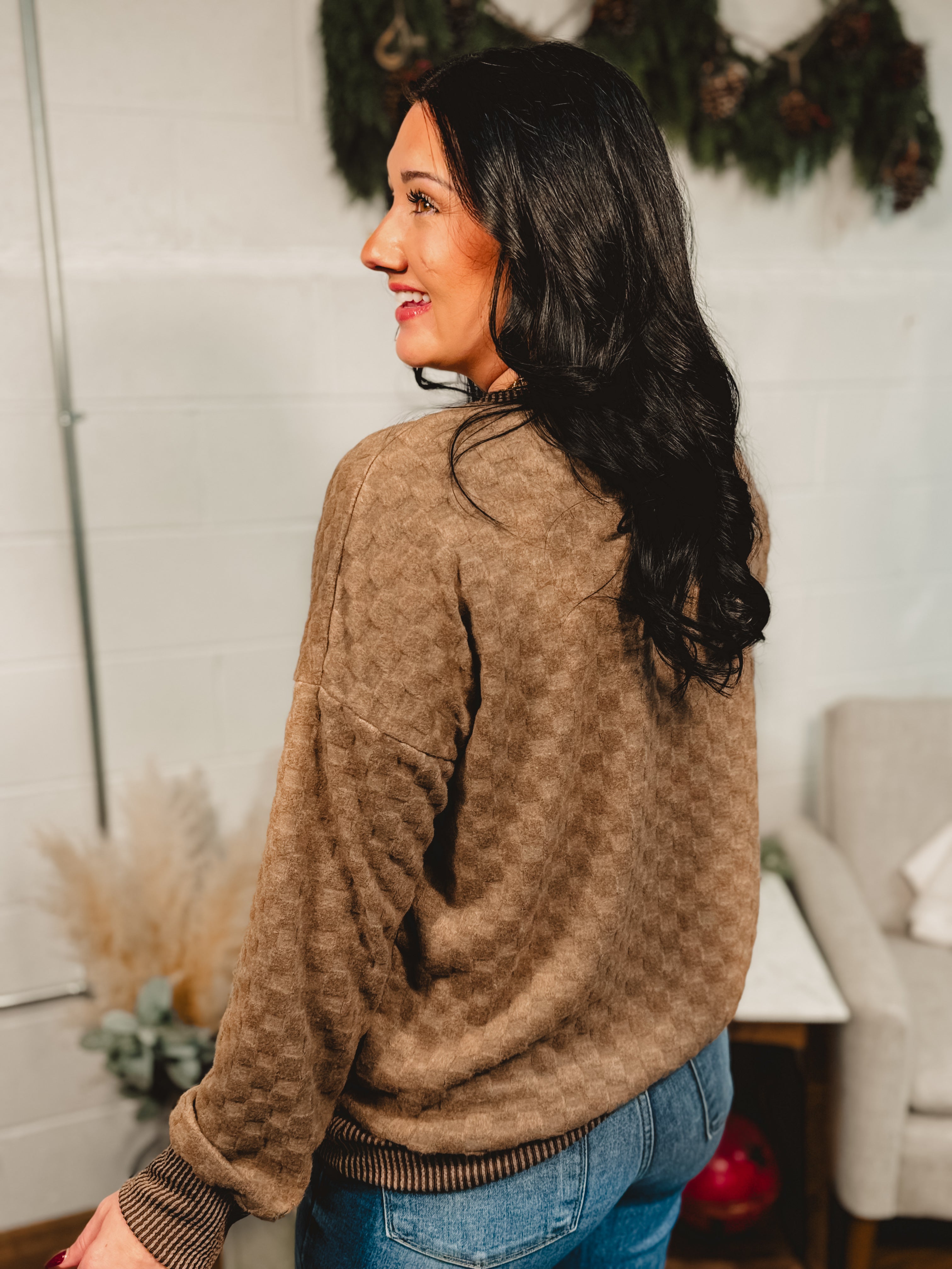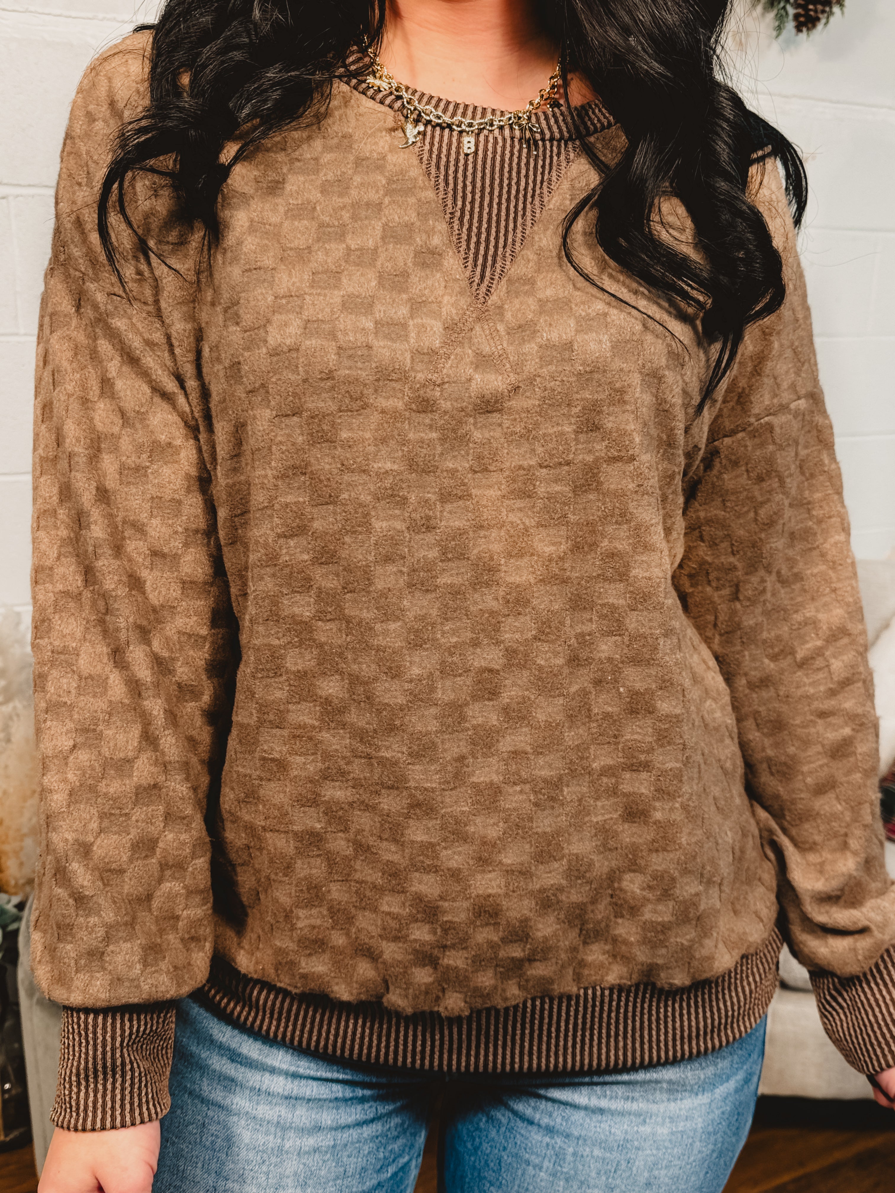 Soft Textured Checker Knit Pullover - Mocha