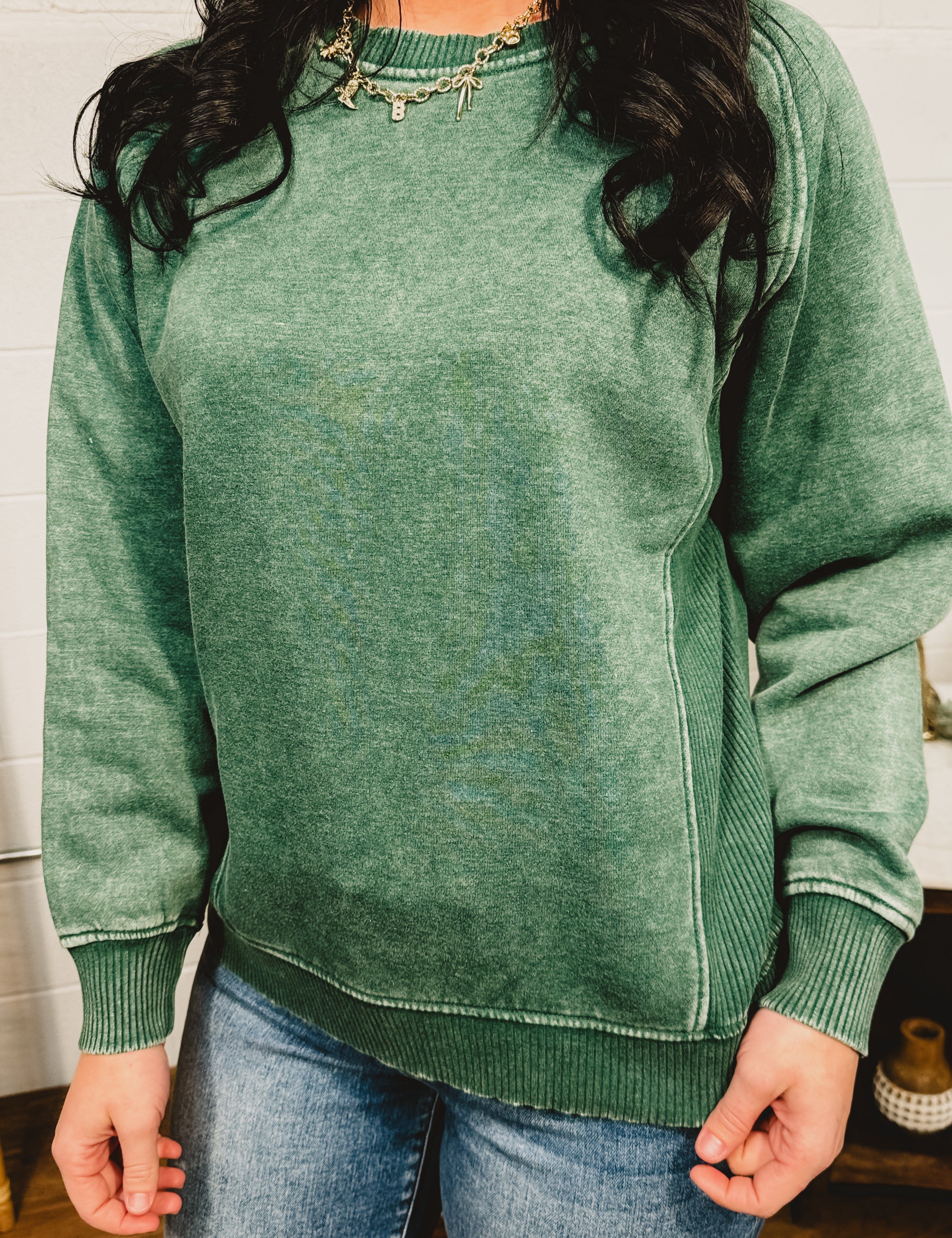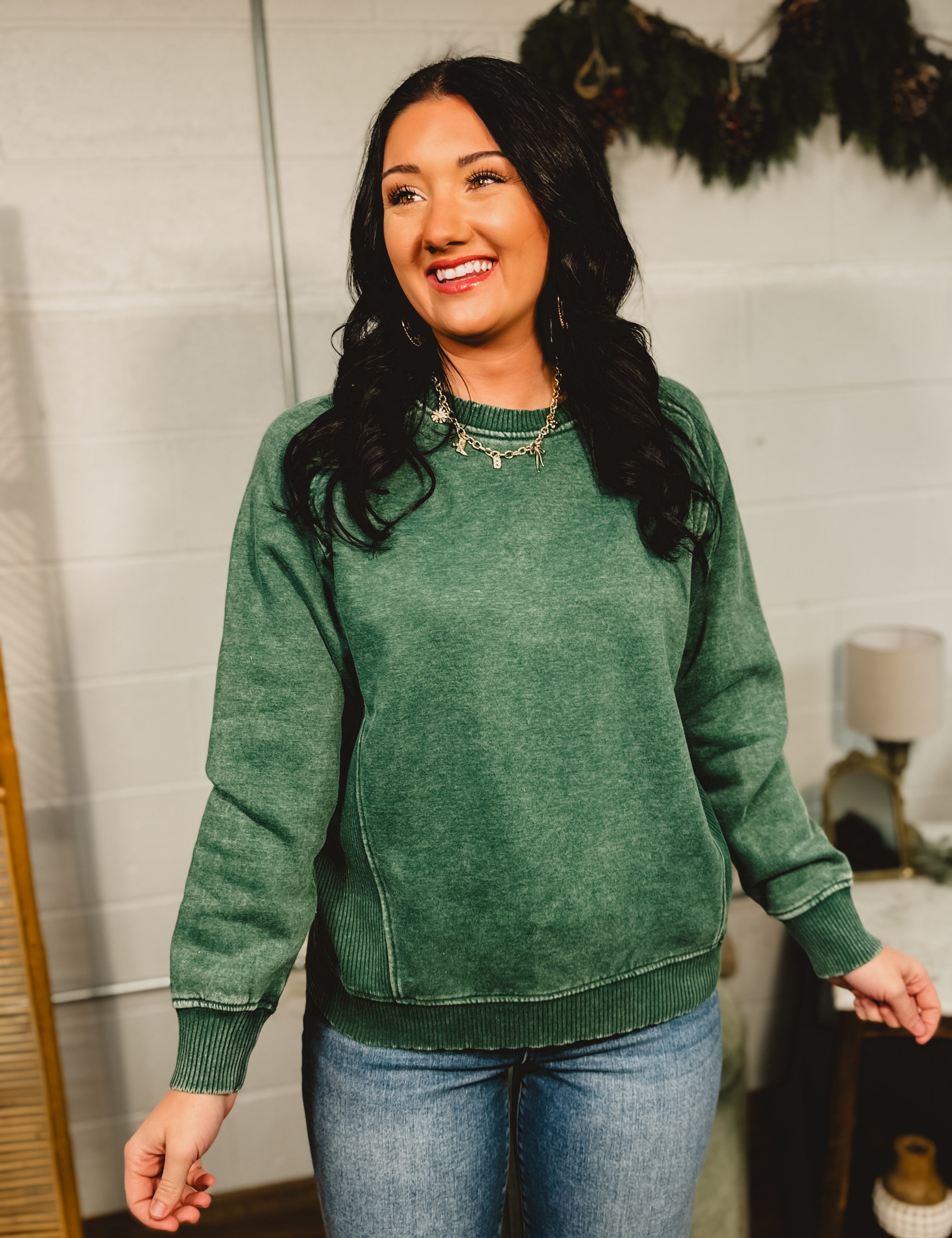 Acid Washed Fleece Crewneck Sweatshirt - Dark Green