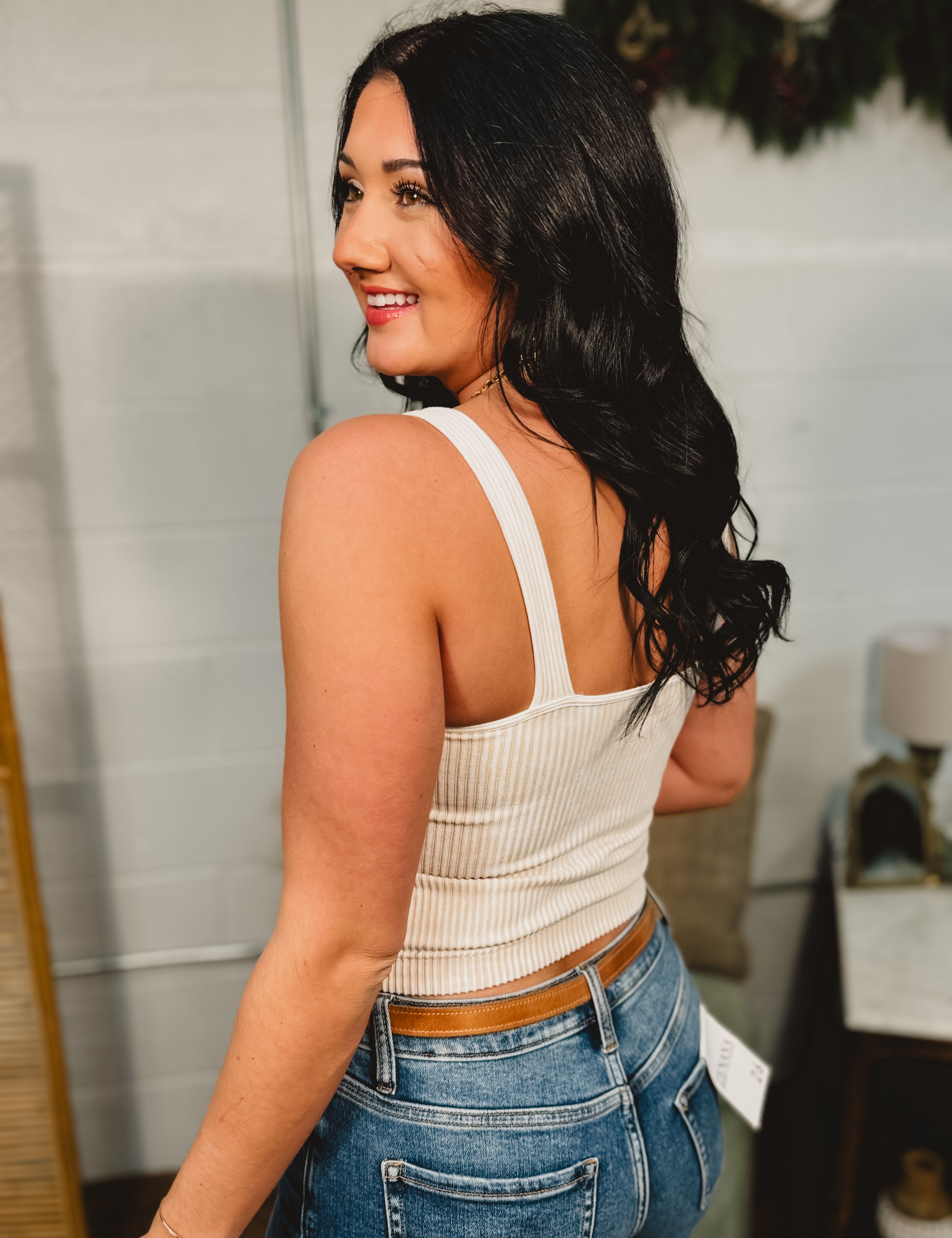Ribbed Padded V-Neck Tank - Sand Beige