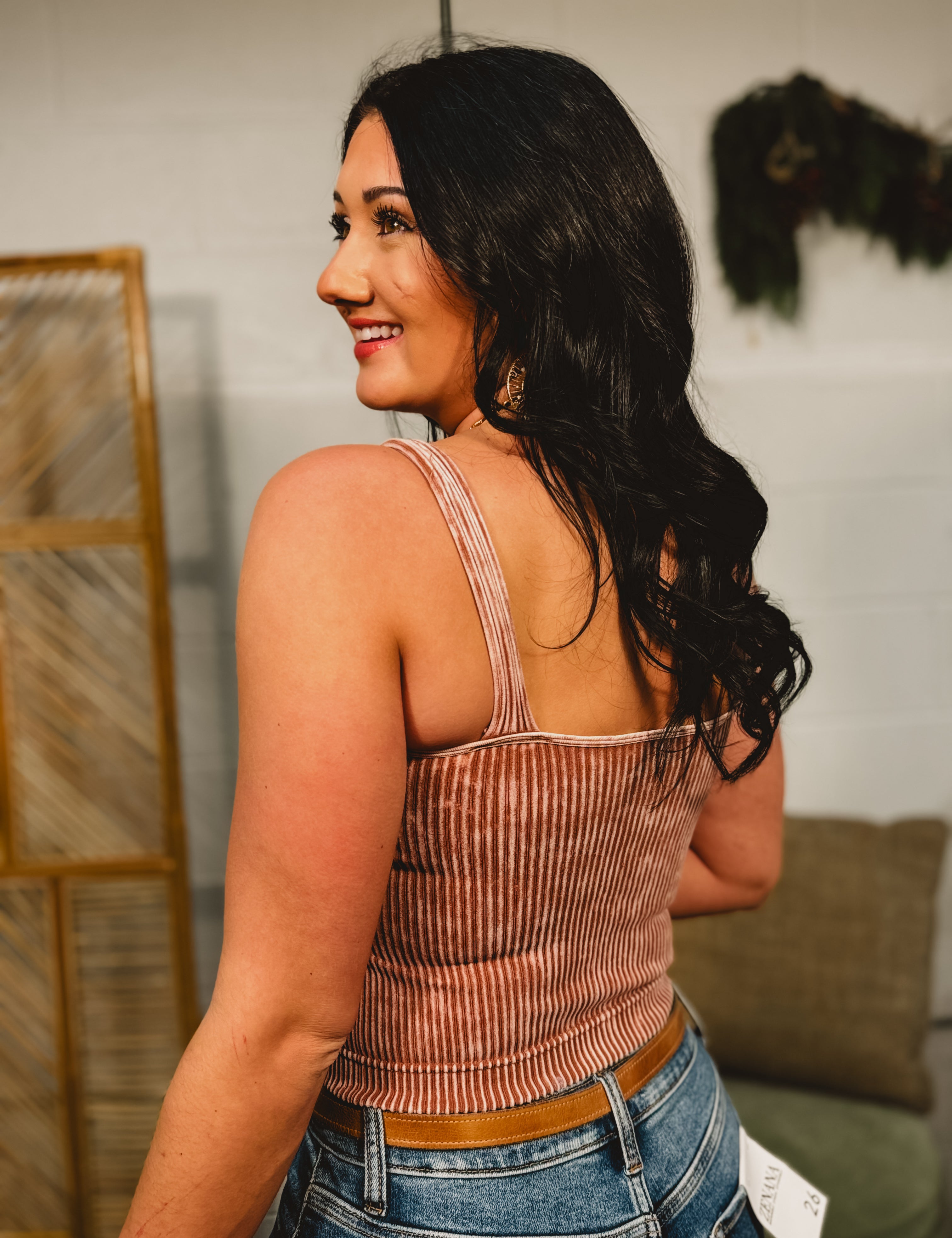 Ribbed Padded V-Neck Tank - Deep Camel