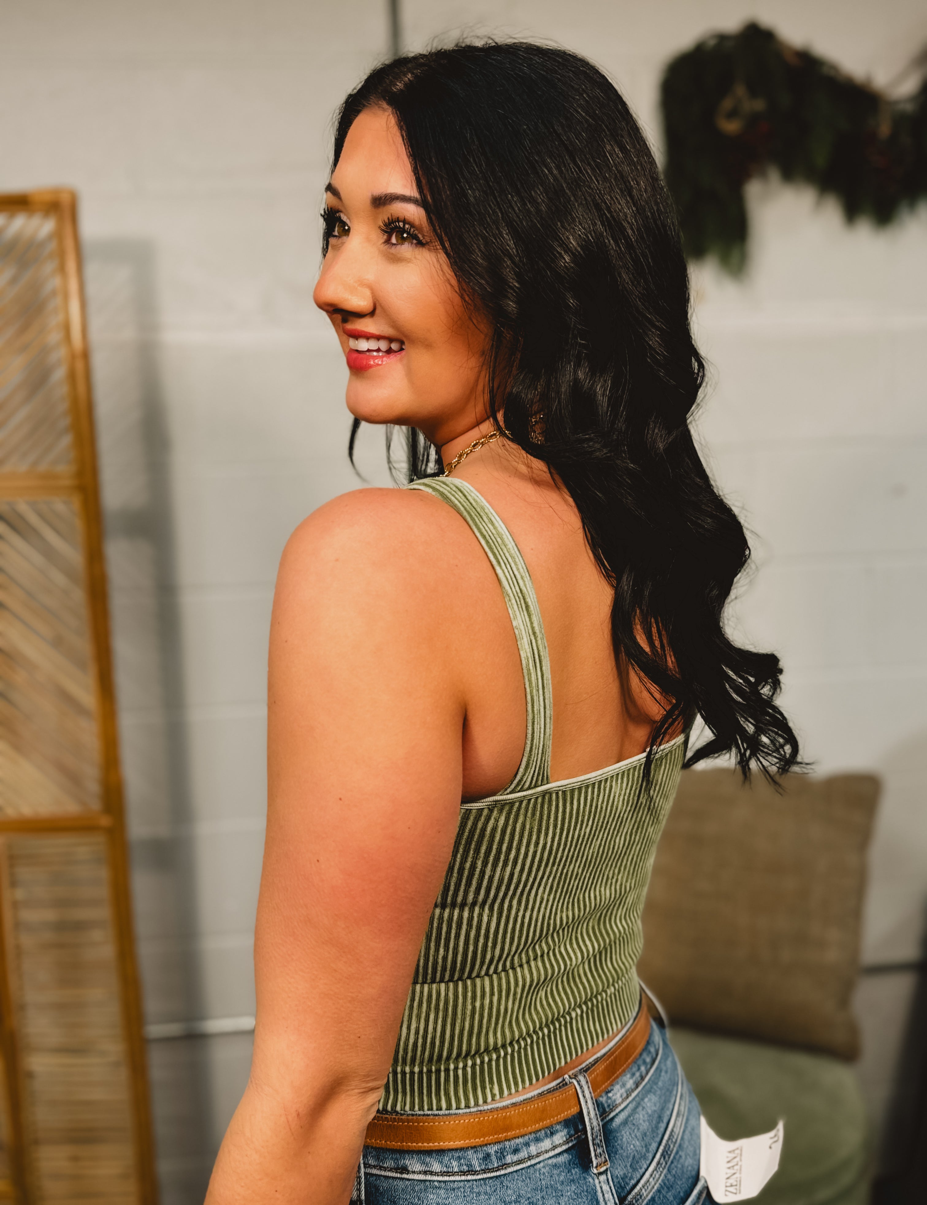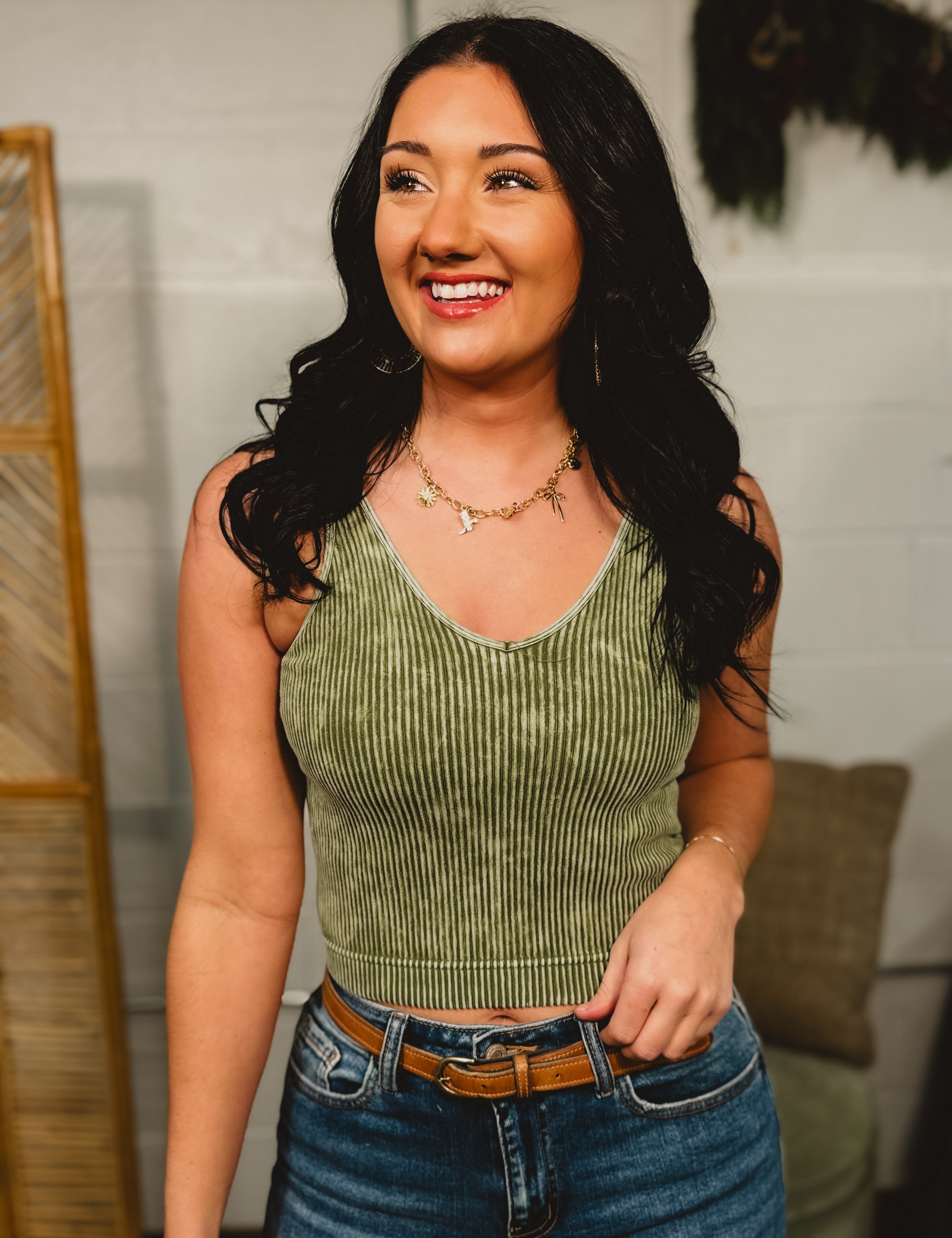 Ribbed Padded V-Neck Tank - Ash Olive
