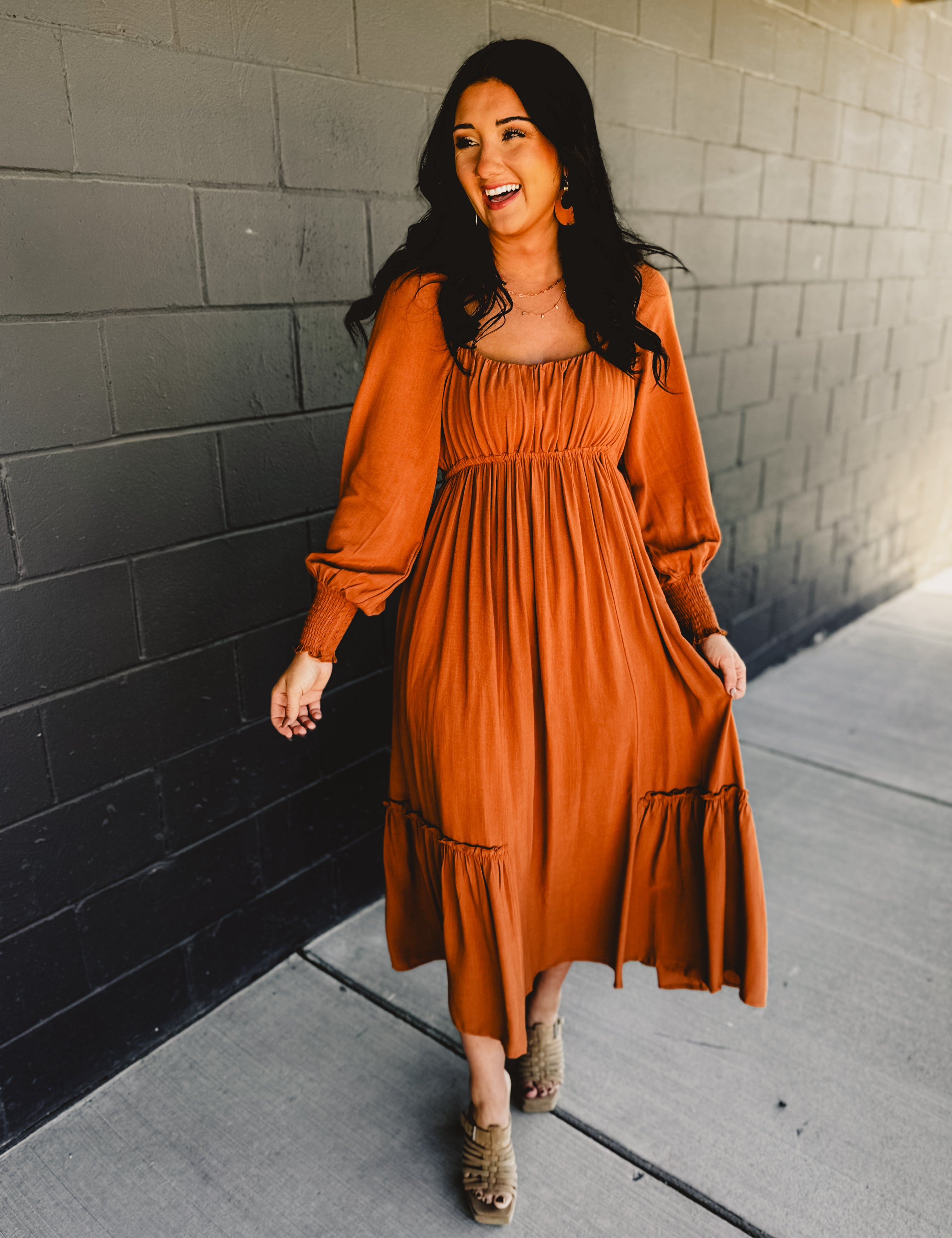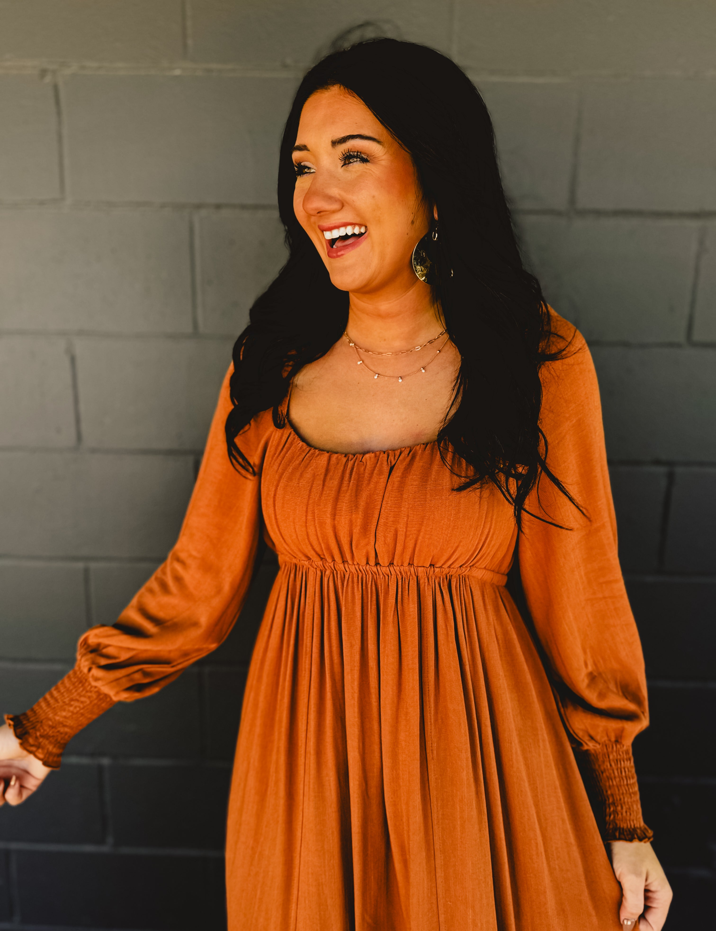 Border Print Long Sleeve Maxi Dress - Pumpkin
